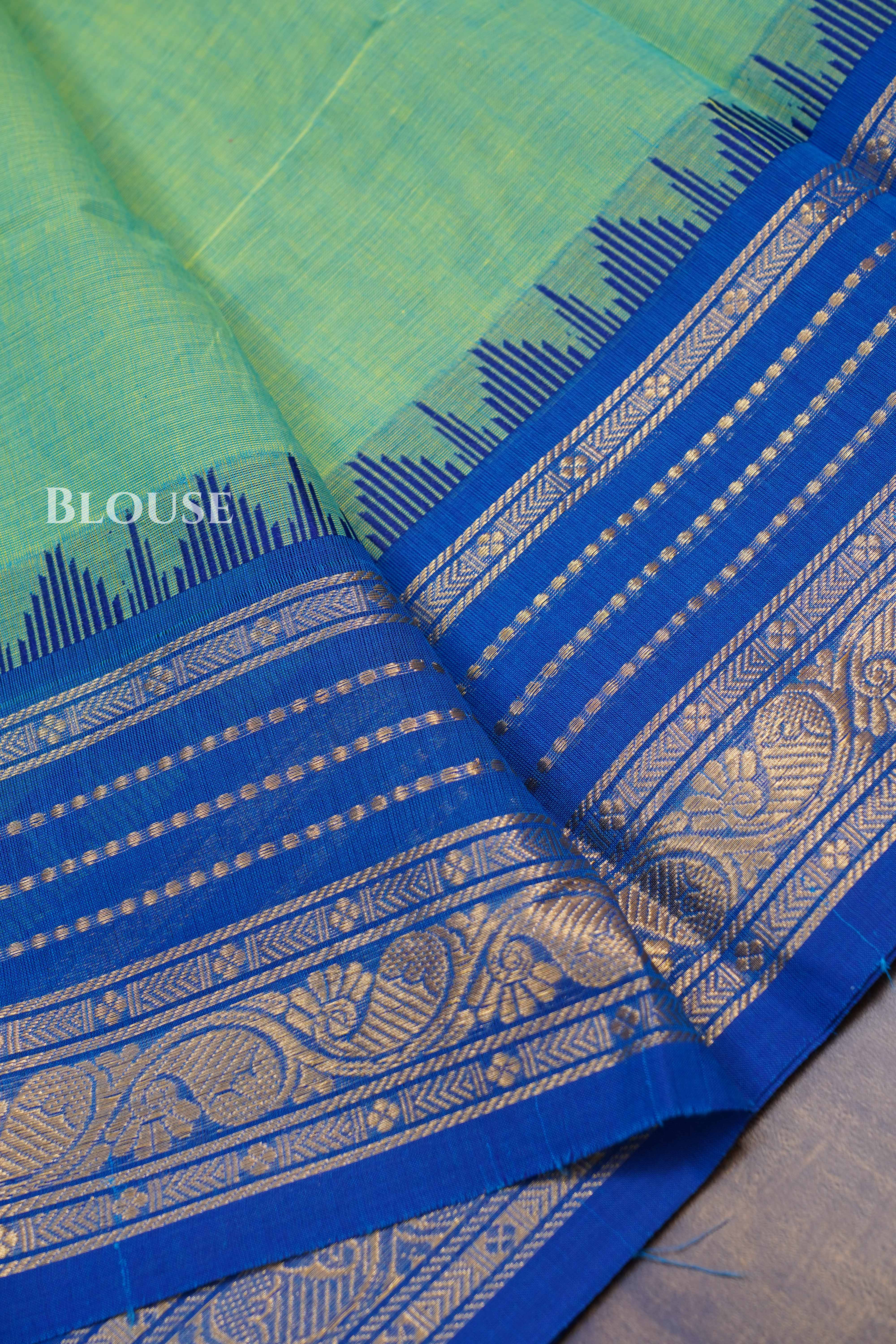 This vibrant Kanchi cotton saree features a refreshing Olive Green body highlighted with a rich purple and blue zari border. Adorned with intricate temple motifs and fine golden weaving, it perfectly blends traditional artistry with a lively modern touch. Lightweight and elegant, it’s ideal for festive and casual occasions alike.