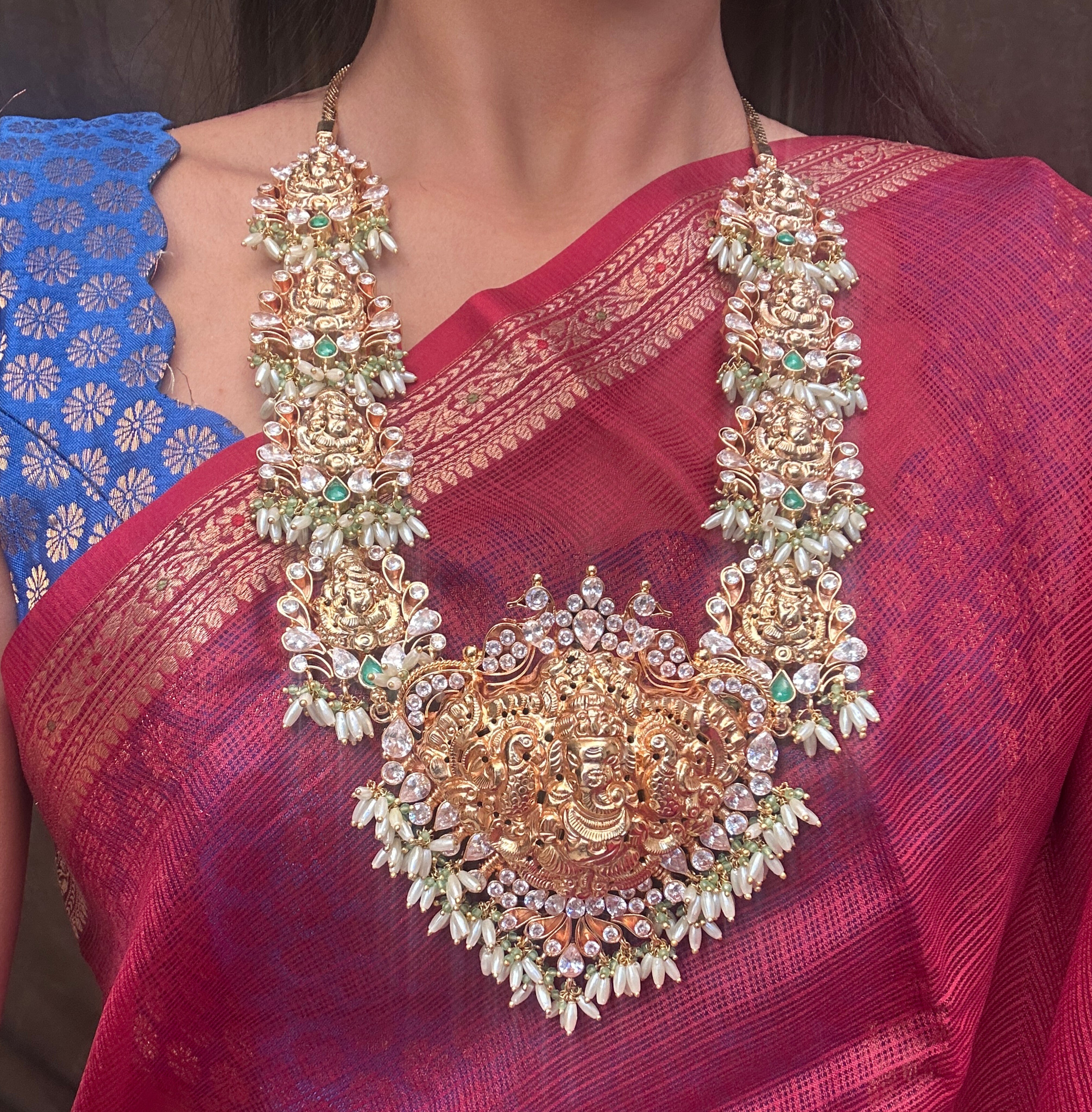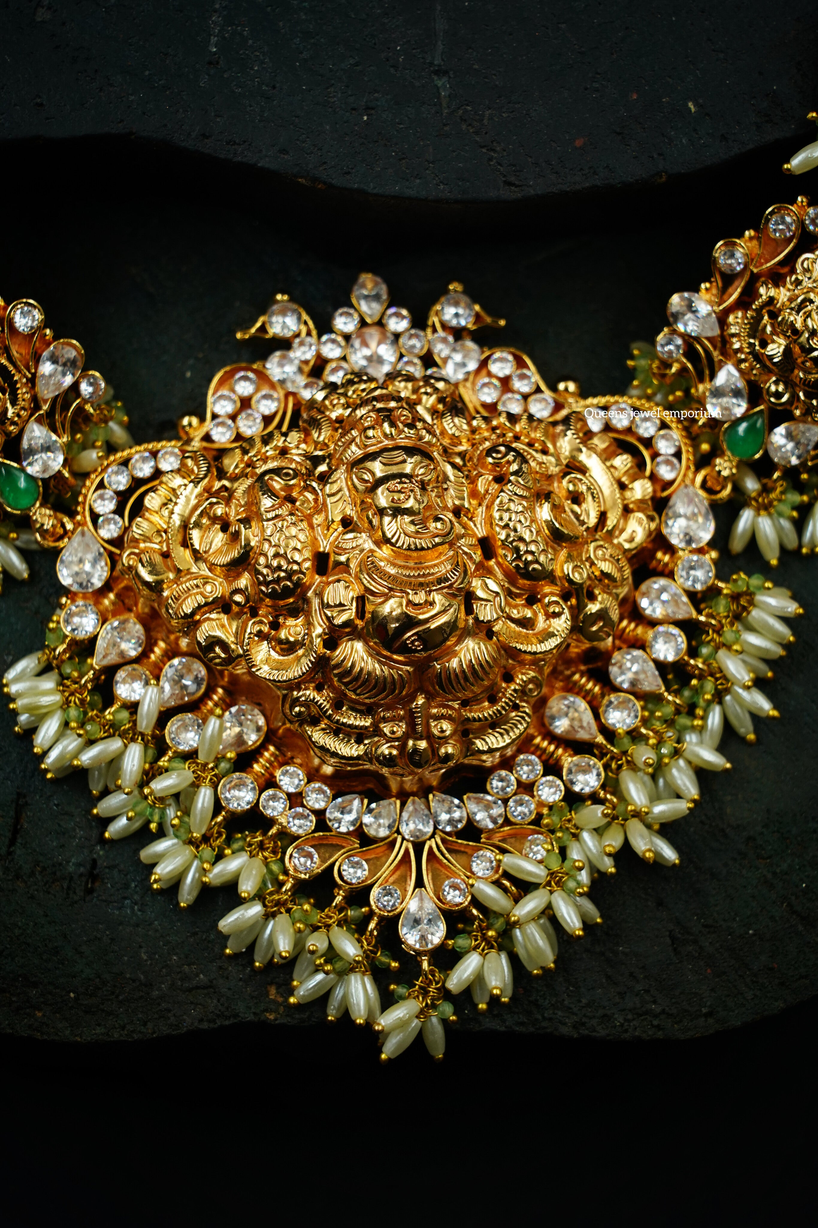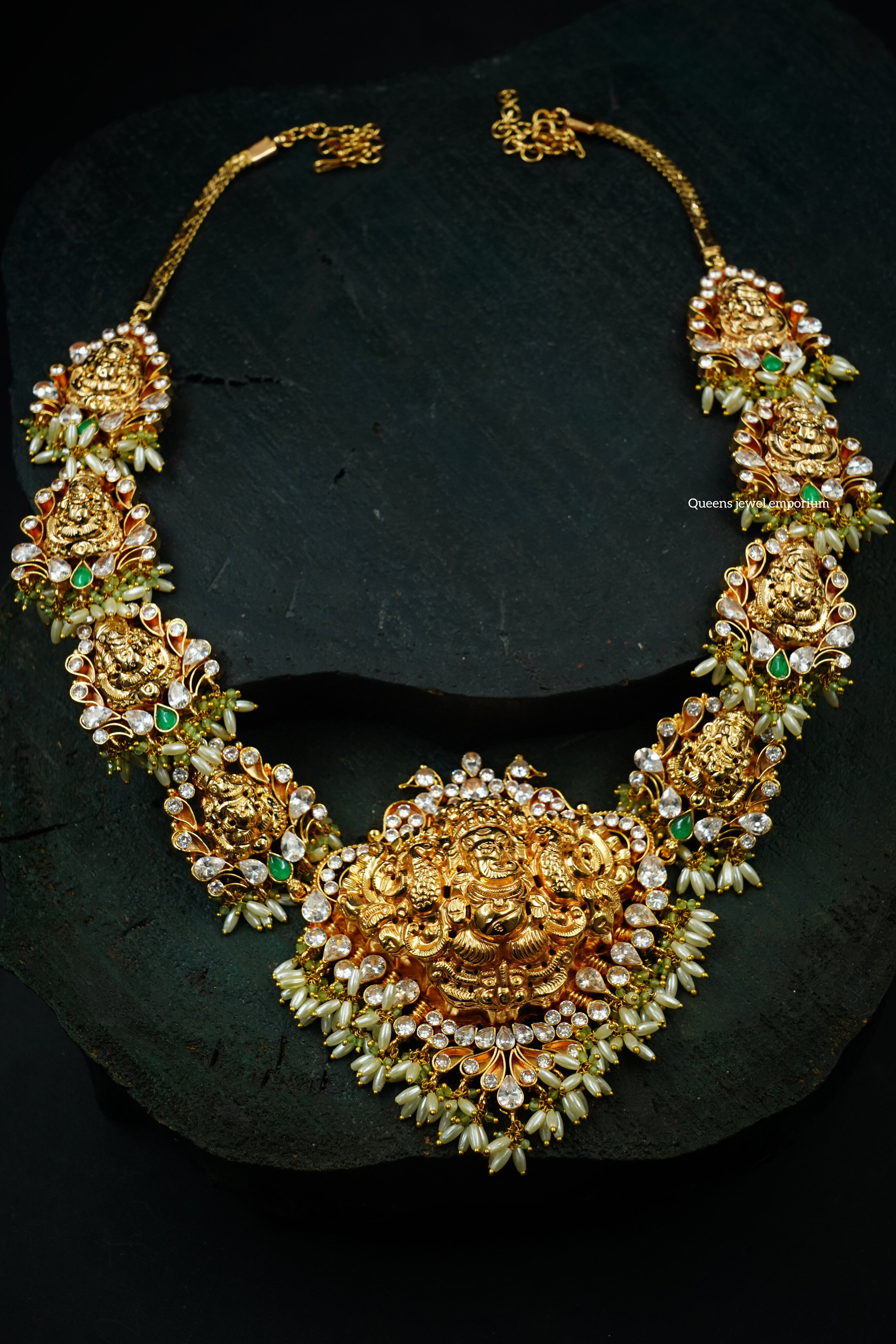 Bold Vinayaka nagas pendant with shimmering zircon stones, framed by eight Vinayaka motifs, finished with baby pearls and green beads hanging—crafted as the perfect bridal haram. At Queens, we design one-of-a-kind jewellery to make you shine like a queen wherever you go.