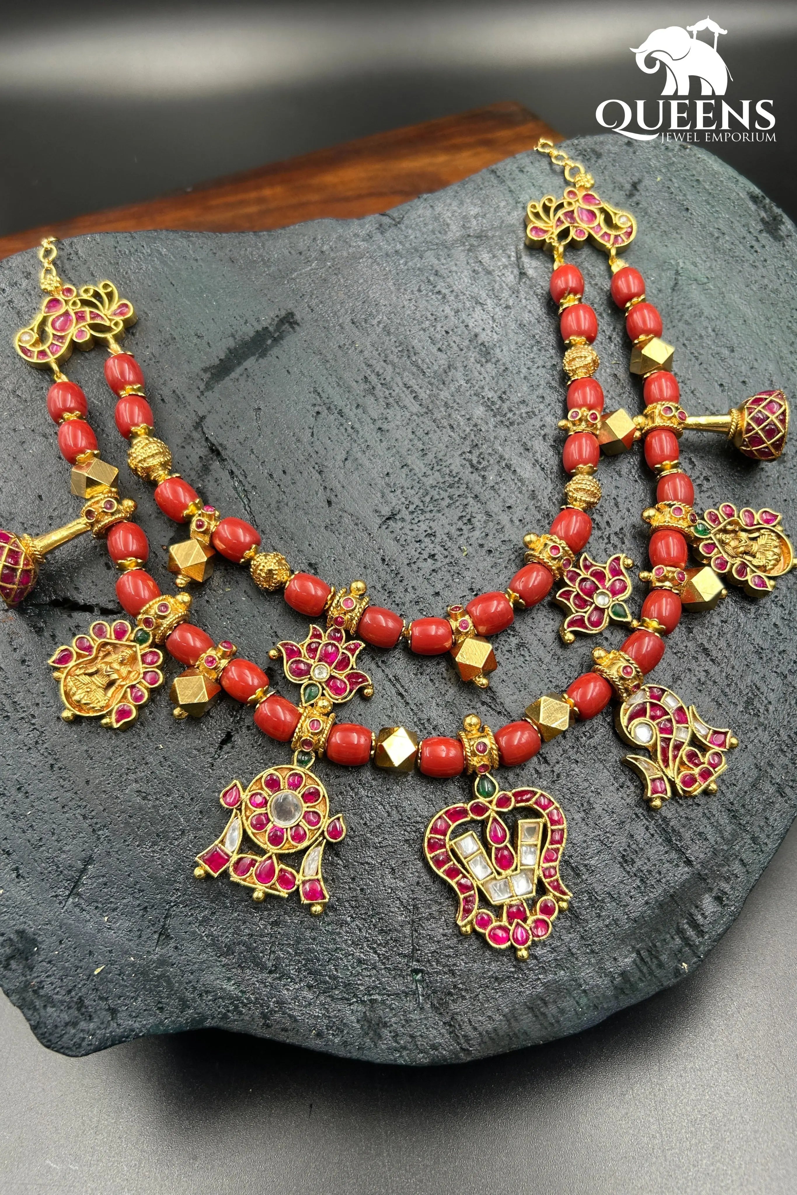 This elegant Aastamangalam coral necklace features vibrant red coral beads and is crafted with precision and attention to detail. The natural beauty of the coral is perfectly complemented by the intricate gold-plated design, making it a timeless piece that will elevate any outfit. Transform your look with this stunning necklace today.
