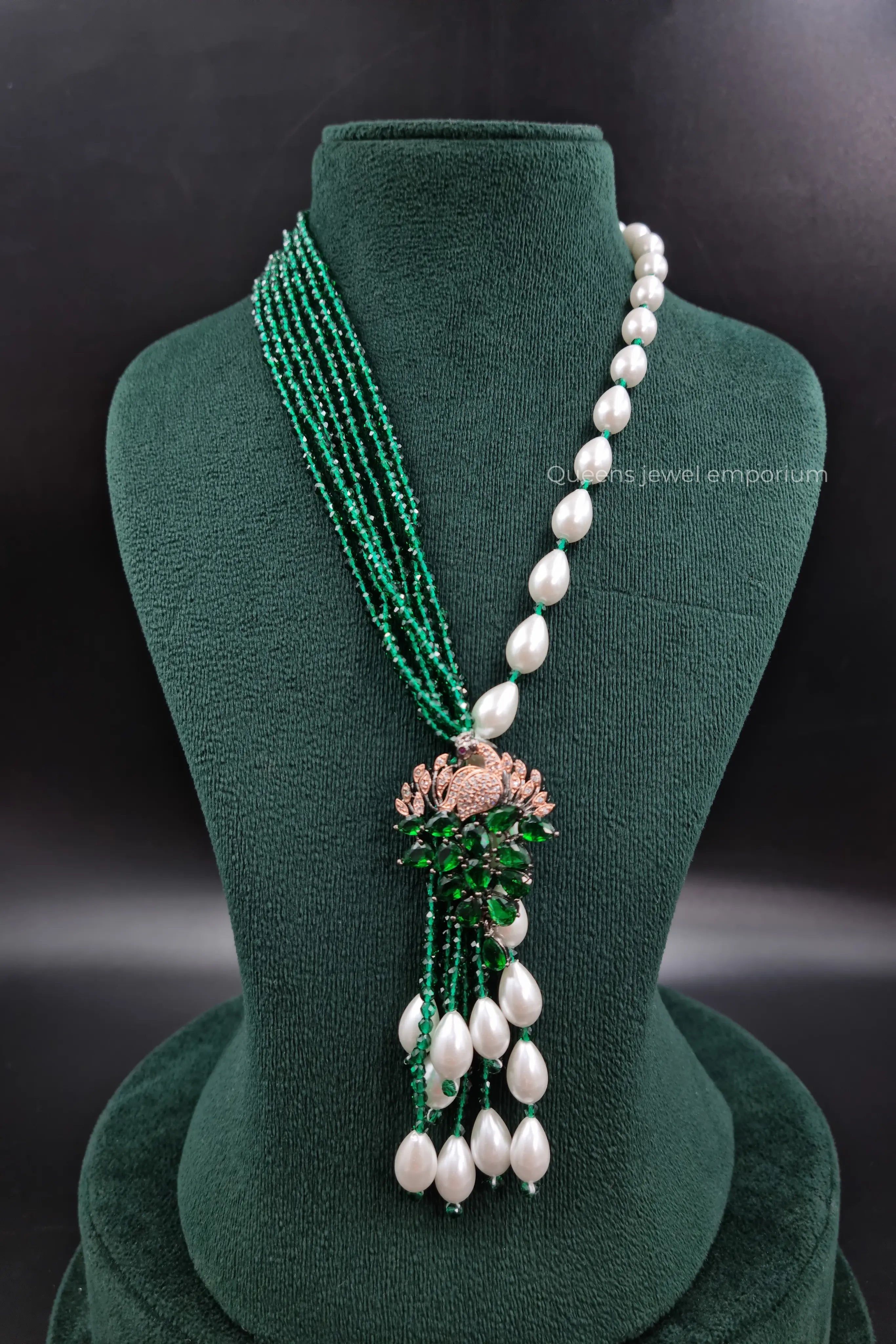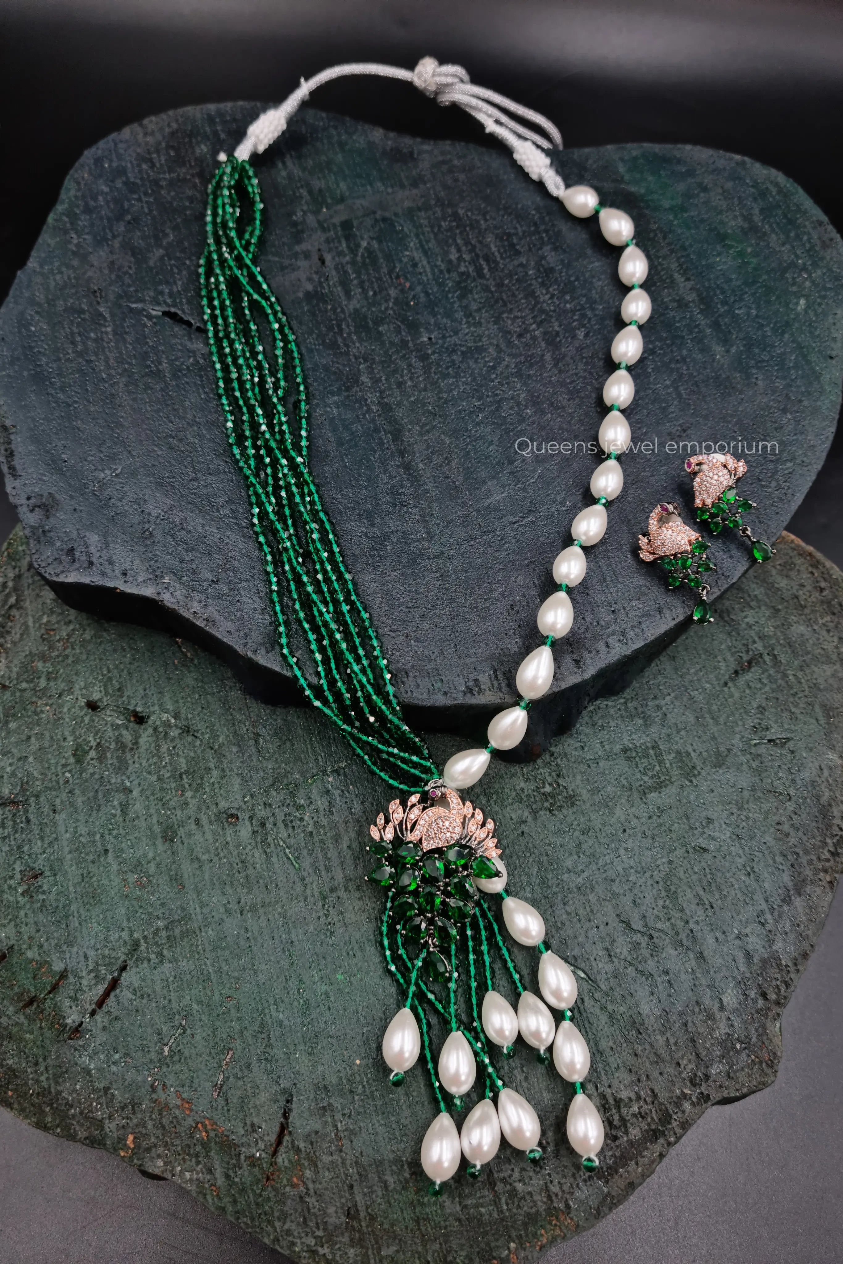 Expertly crafted with premium quality, this AKANKSHA HARAM features a stunning peacock design pendant and matching earrings. The vibrant green beads and teardrops add an elegant touch to any outfit. Elevate your style with this must-have accessory.