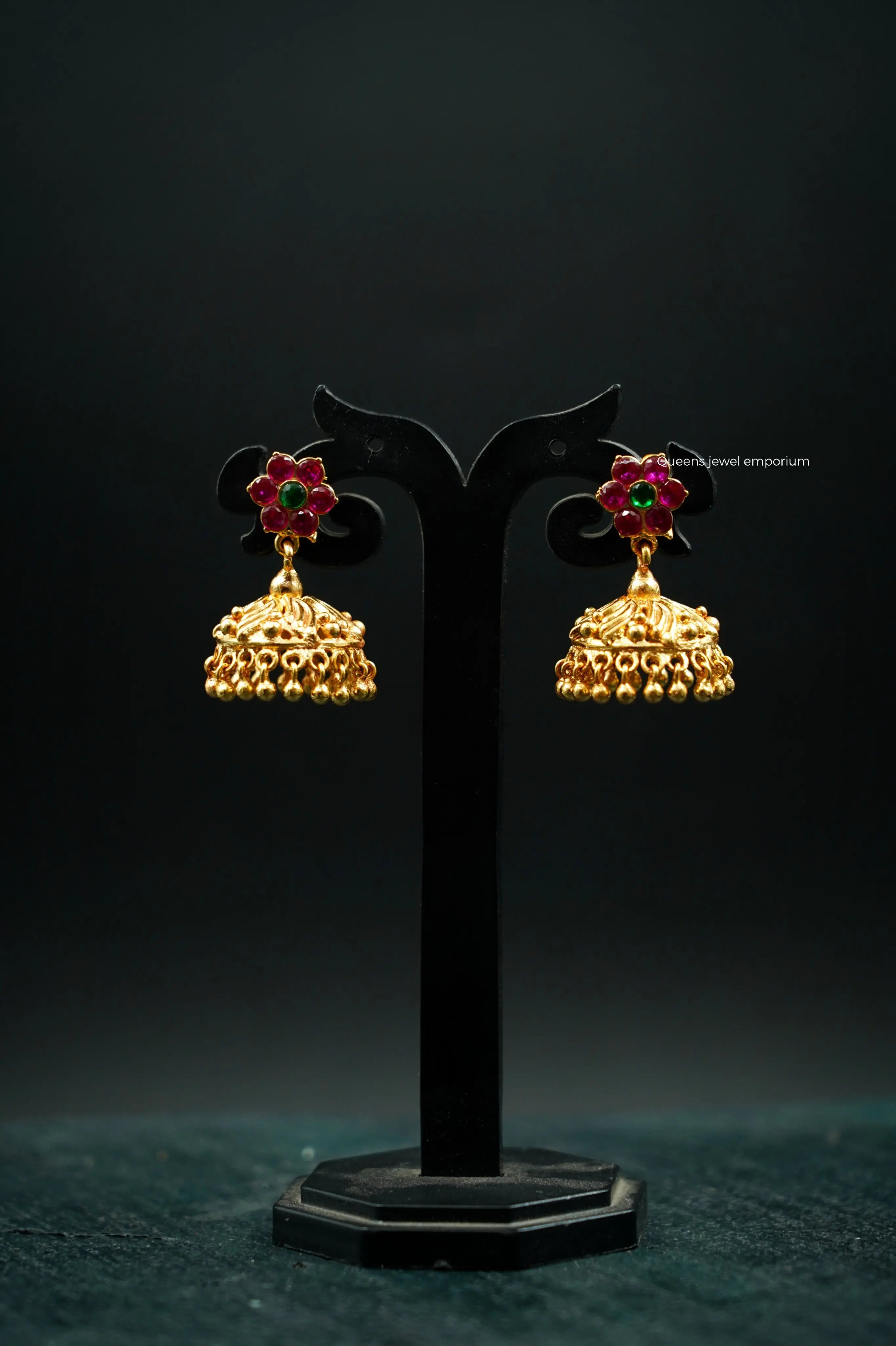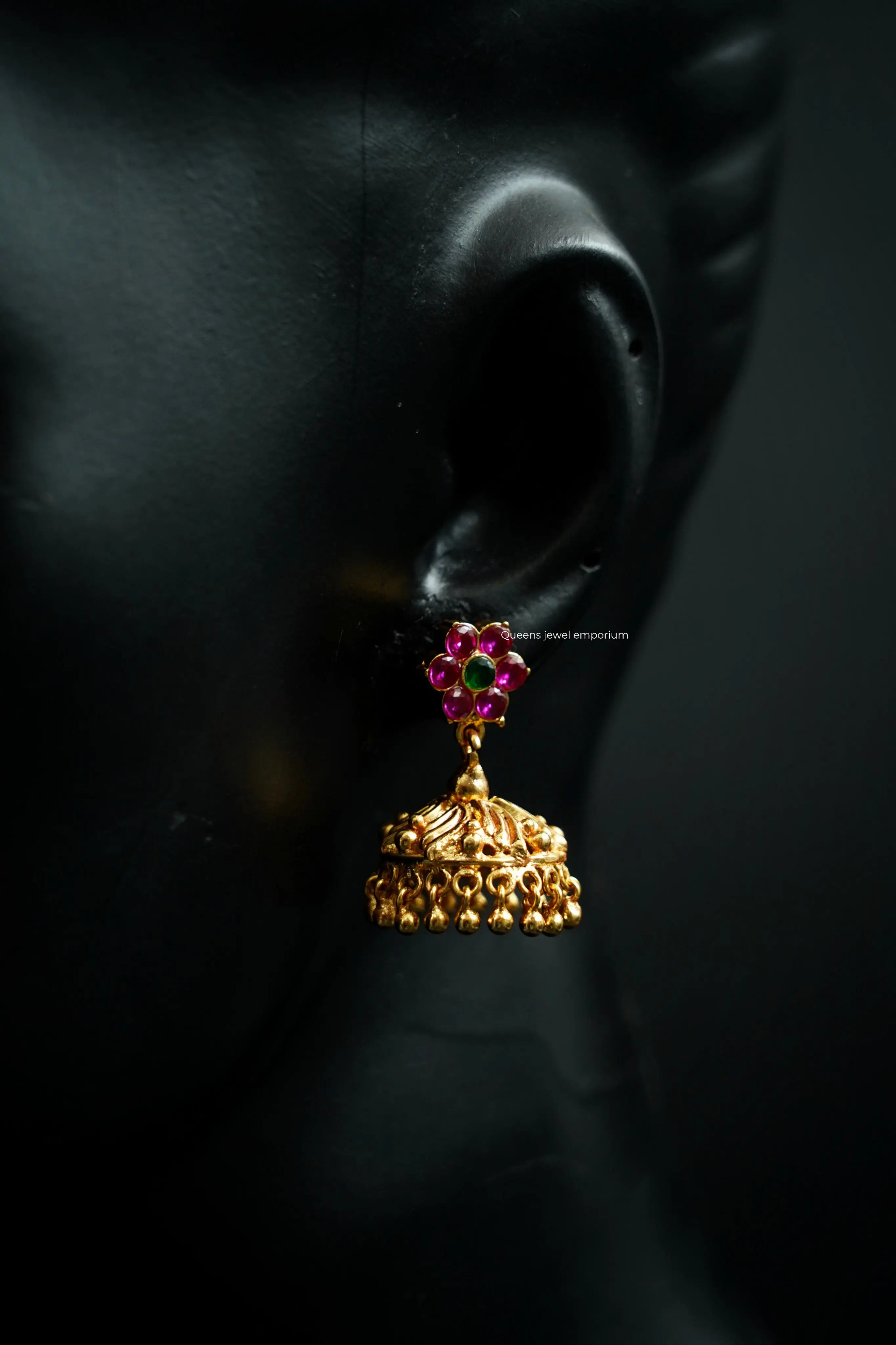 Introducing Aksara jumka - the perfect blend of South Indian tradition and modern design. Made with gold-silver alloy and sparkling zircon stones, these medium-sized jhumkas elevate your style, adding a luxurious touch to any outfit. Stand out in any crowd with Aksara zircon jhumkas.