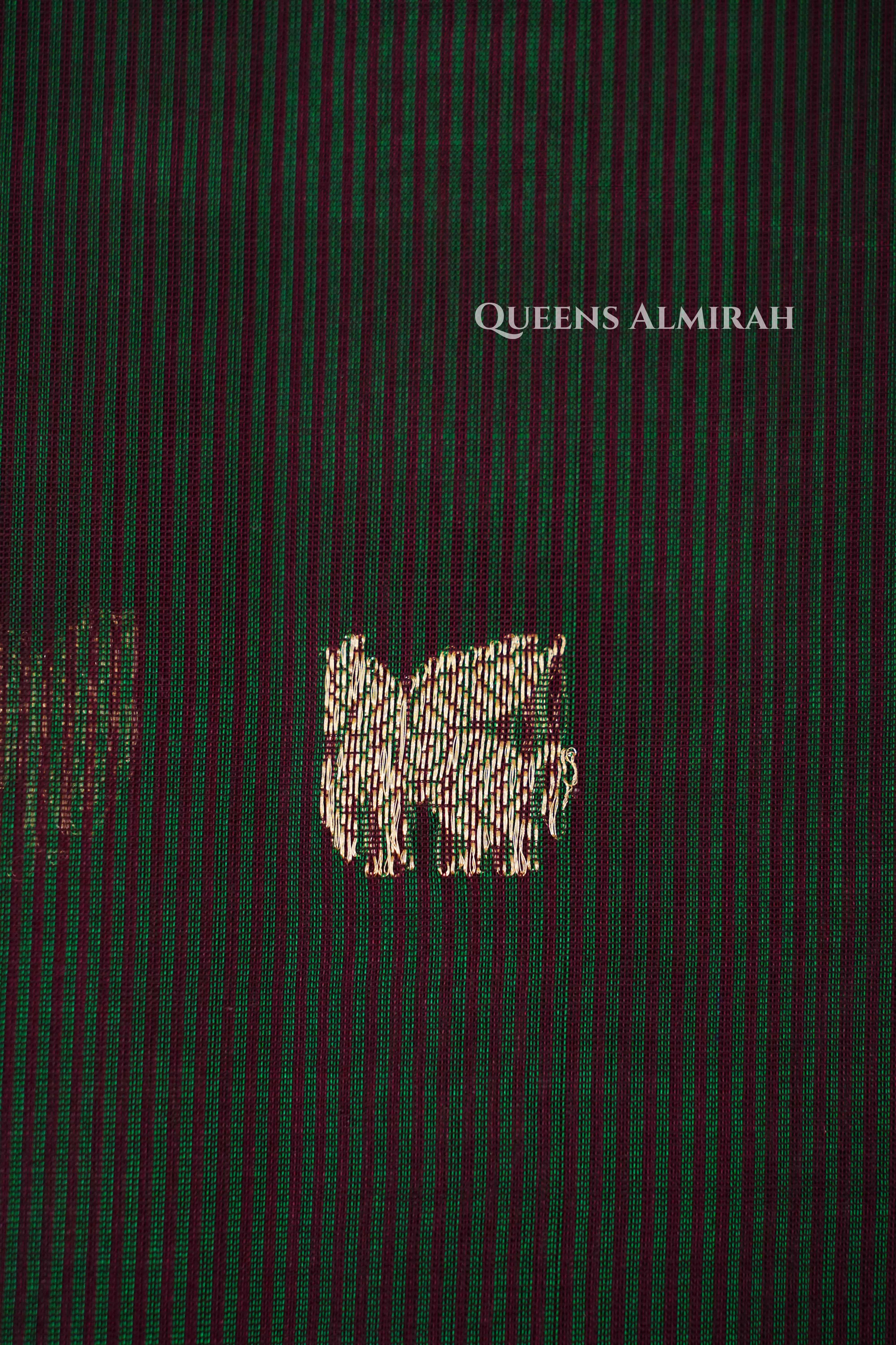 “A Algae Green Chettinad silk cotton saree adorned with subtle pinstripes and an opulent golden zari border featuring intricate floral motifs, exuding traditional grandeur and sophistication.”