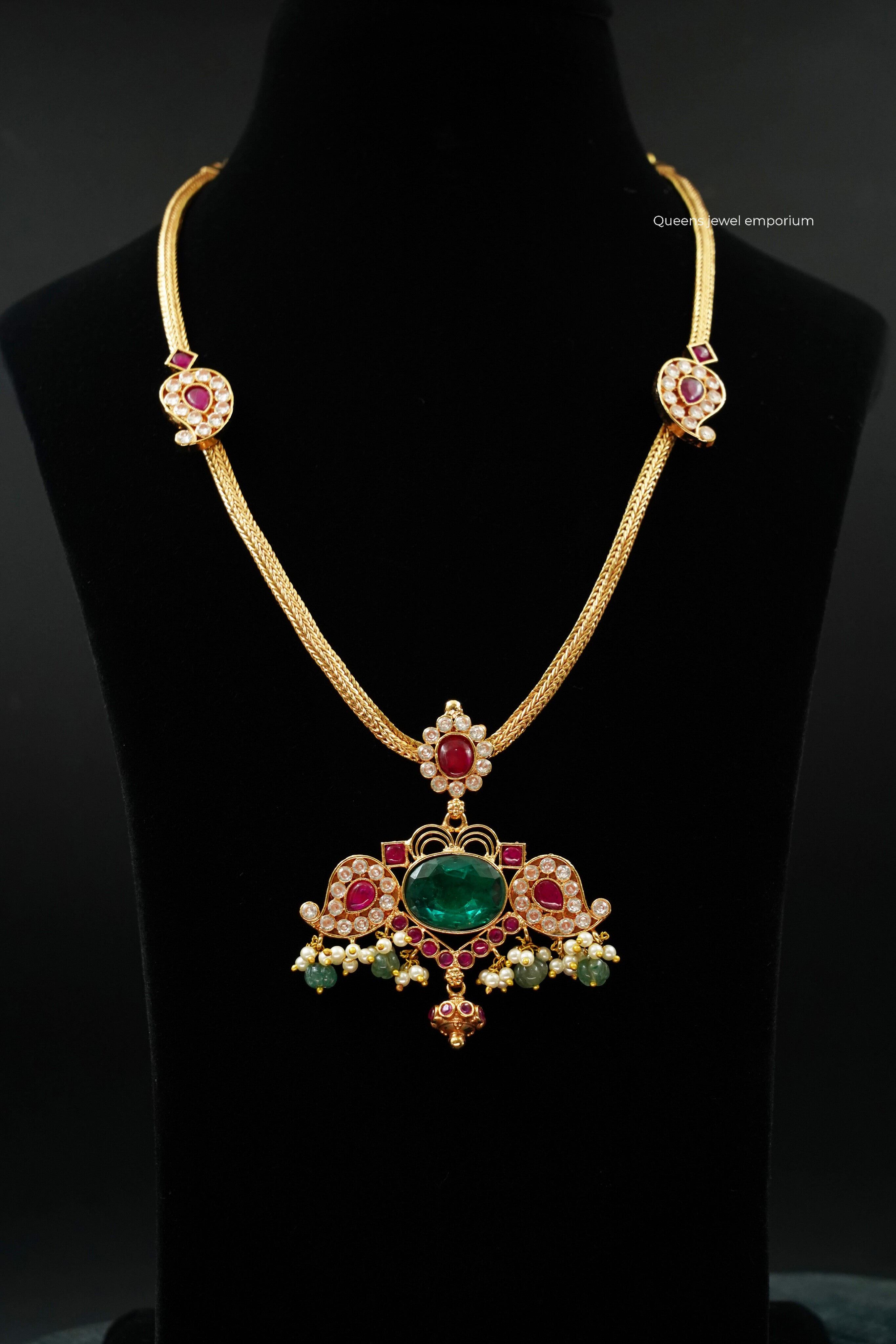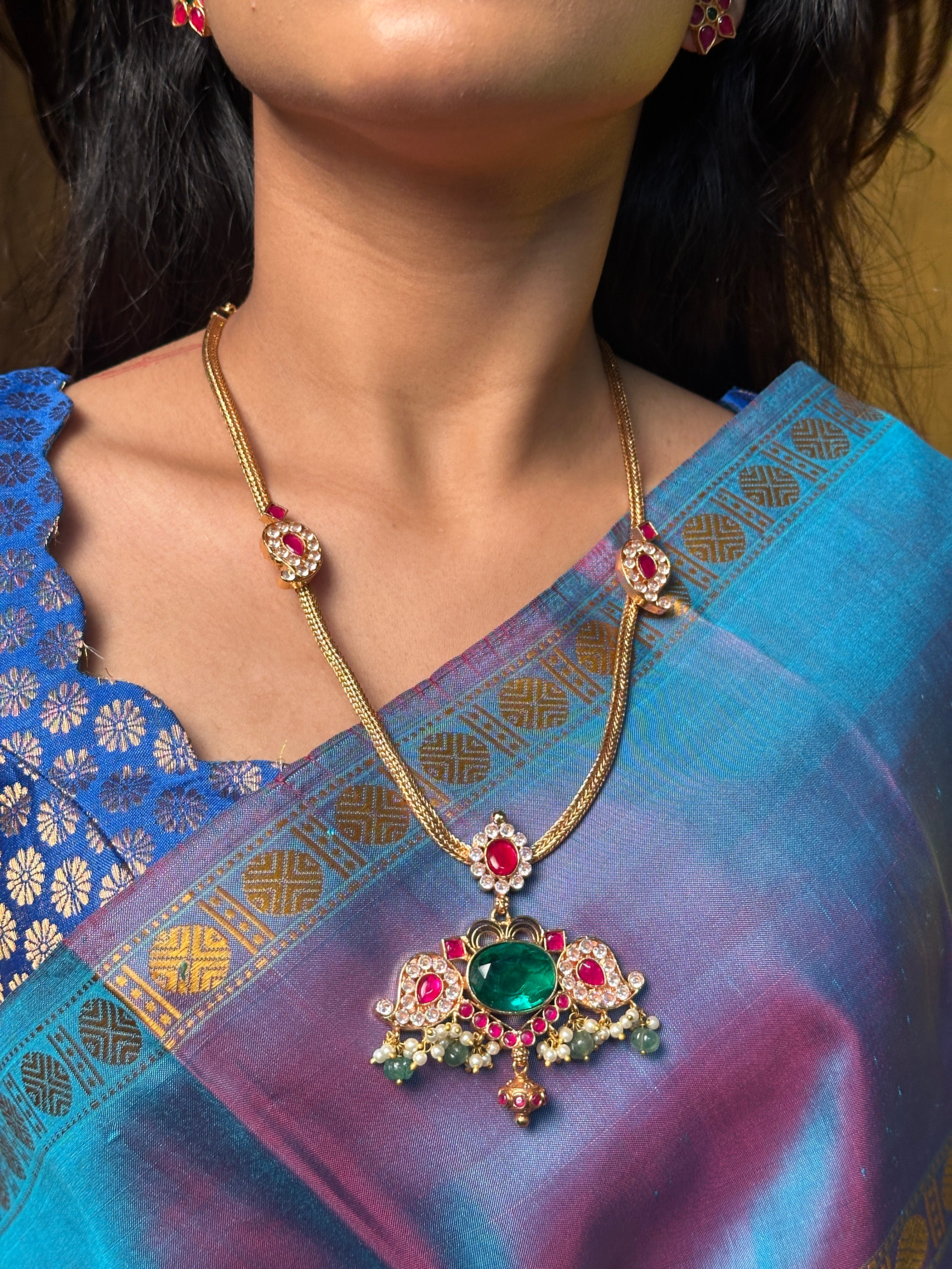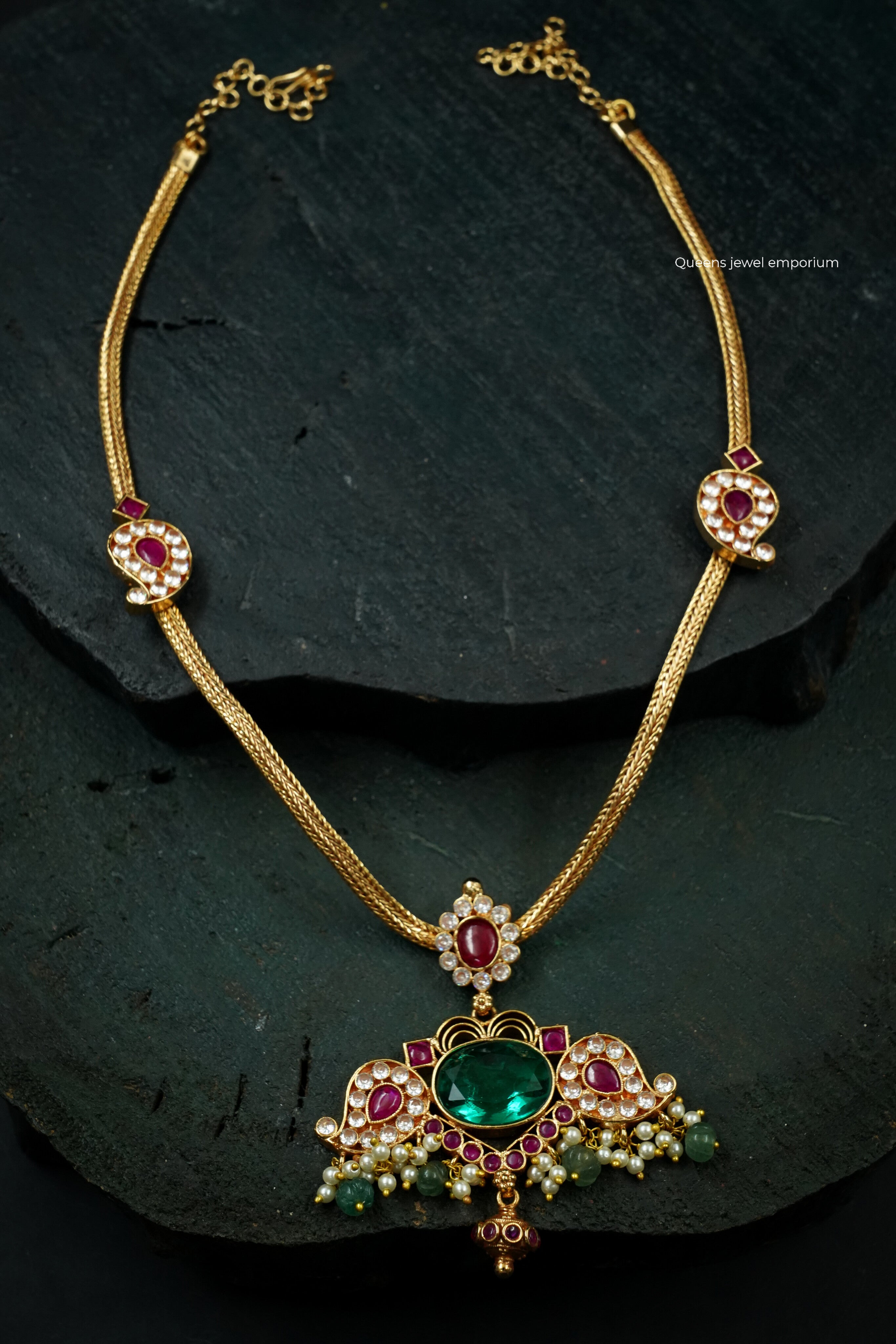 A graceful necklace featuring an oval green emerald stone paired with two zircon mango motifs for a rich traditional touch. The chain carries two mango elements and one floral motif, finished with soft green beads, baby pearls, and a kemp ball hanging for added colour and movement.Handcrafted by our expert artisans.