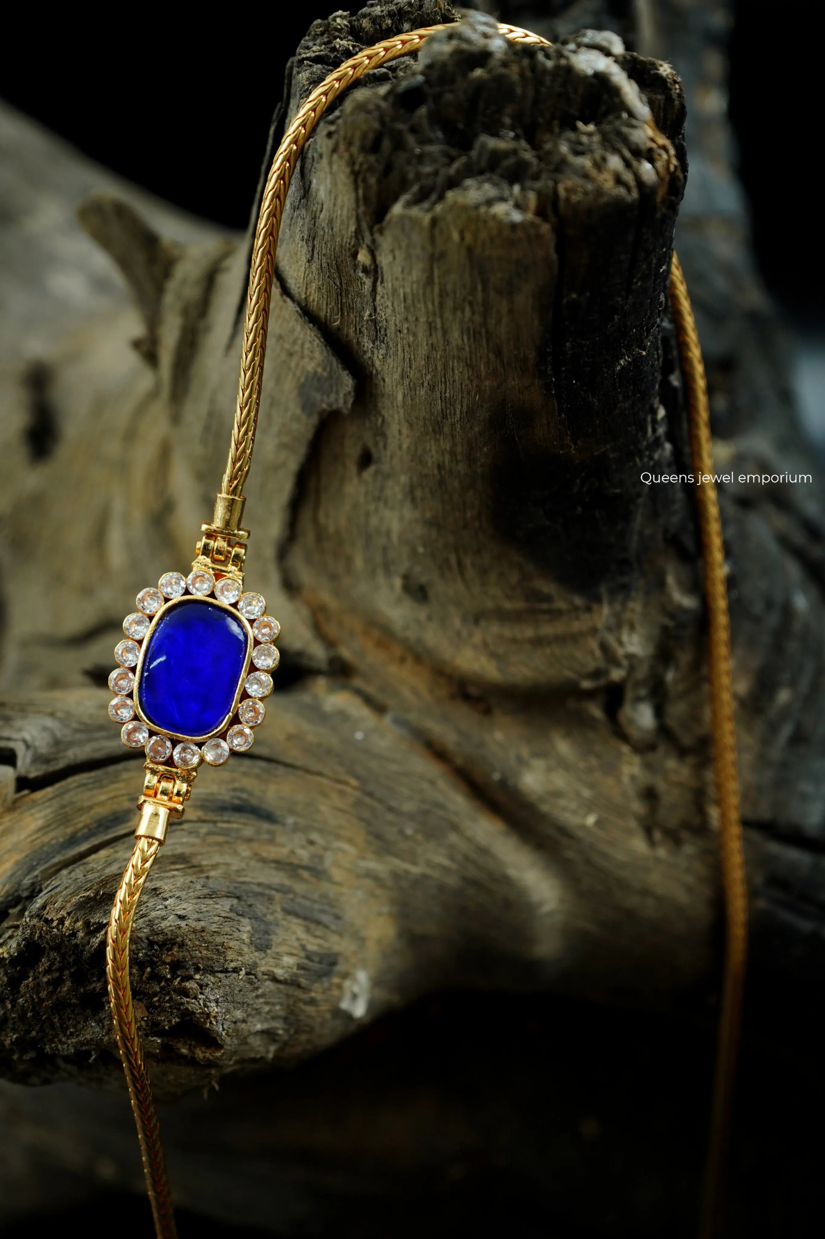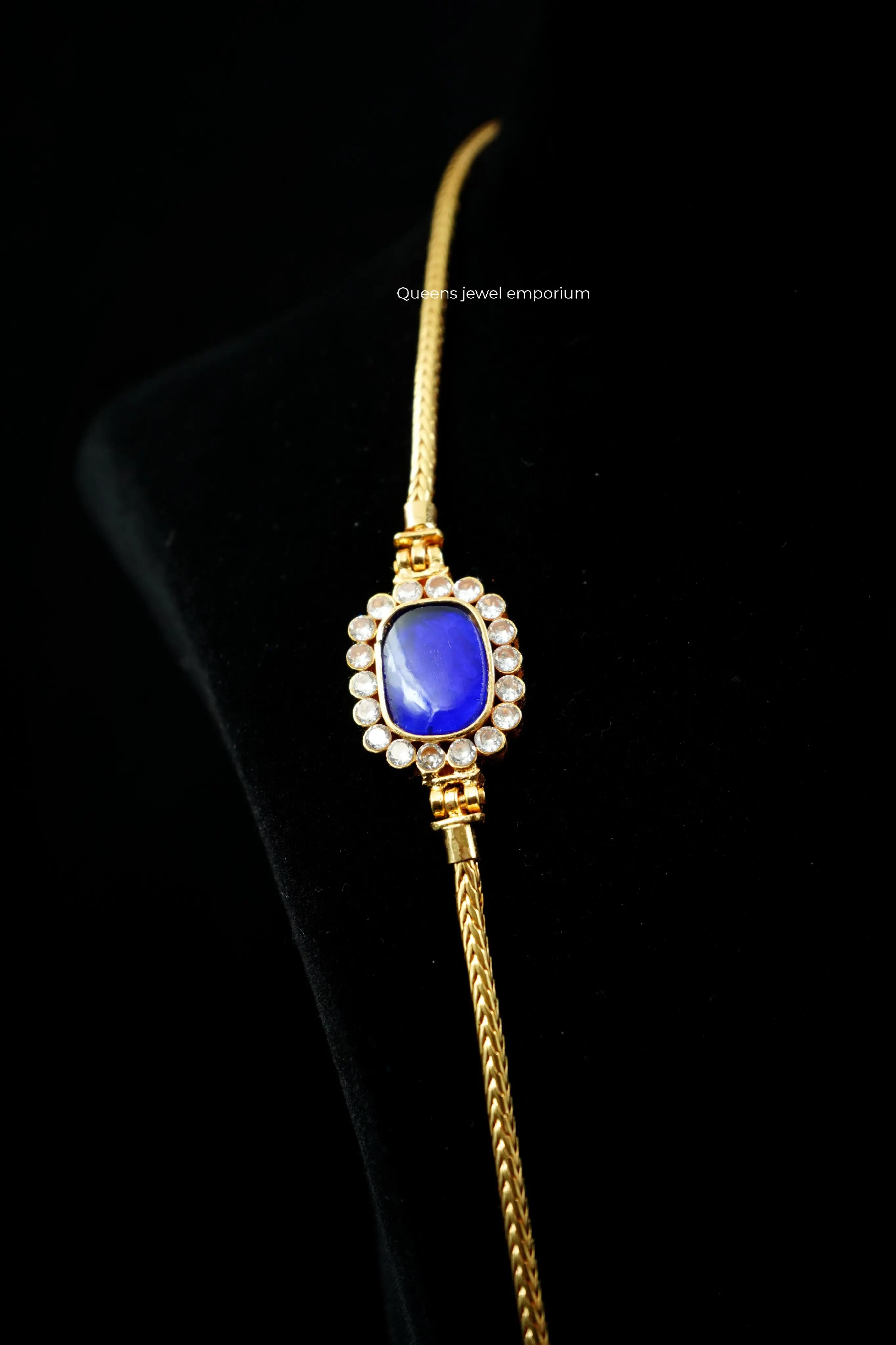 Elevate Your Style with Our Rectangular Blue Stone Mogappu Chain, Surrounded by Dazzling Zircon Accents. A Perfect Blend of Rich Color and Sparkling Elegance, Crafted to Add a Touch of Luxury and Tradition to Any Occasion..