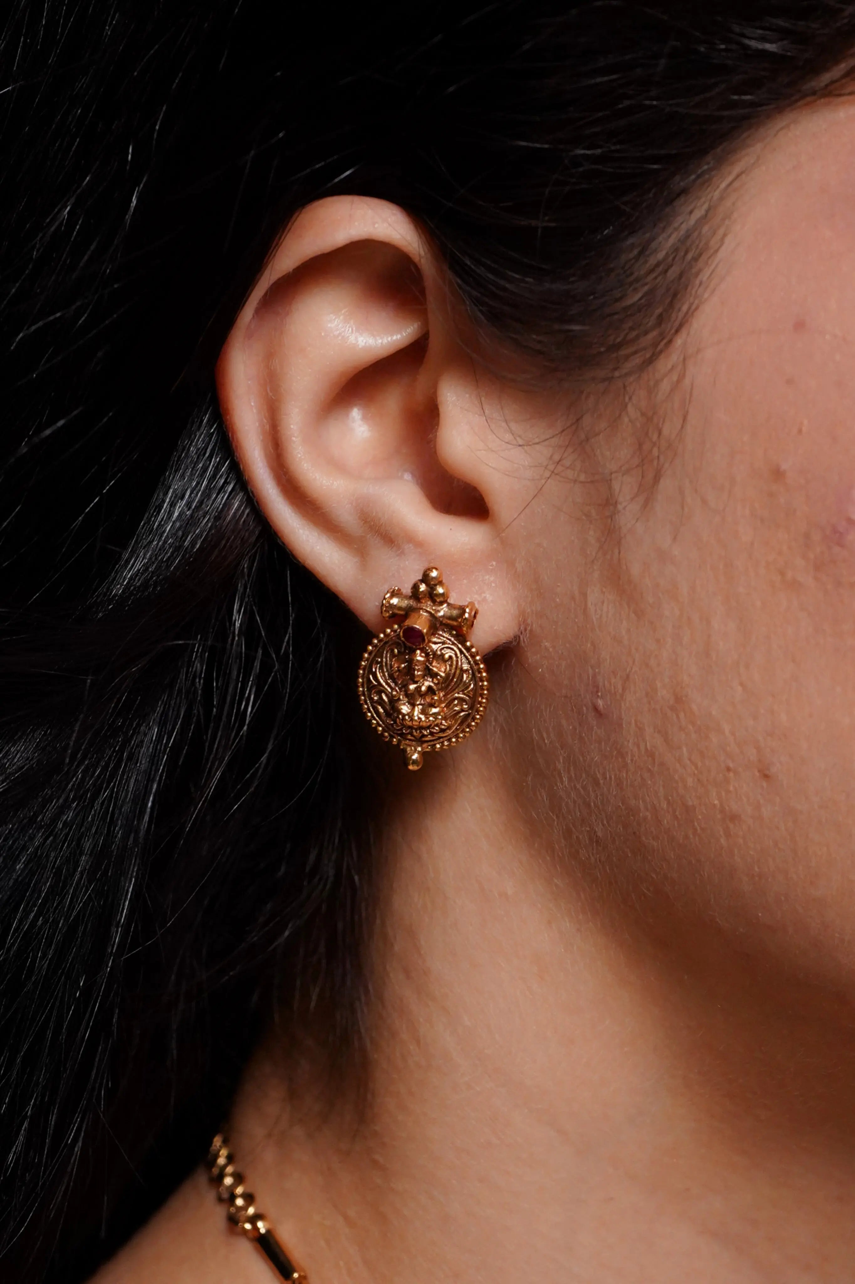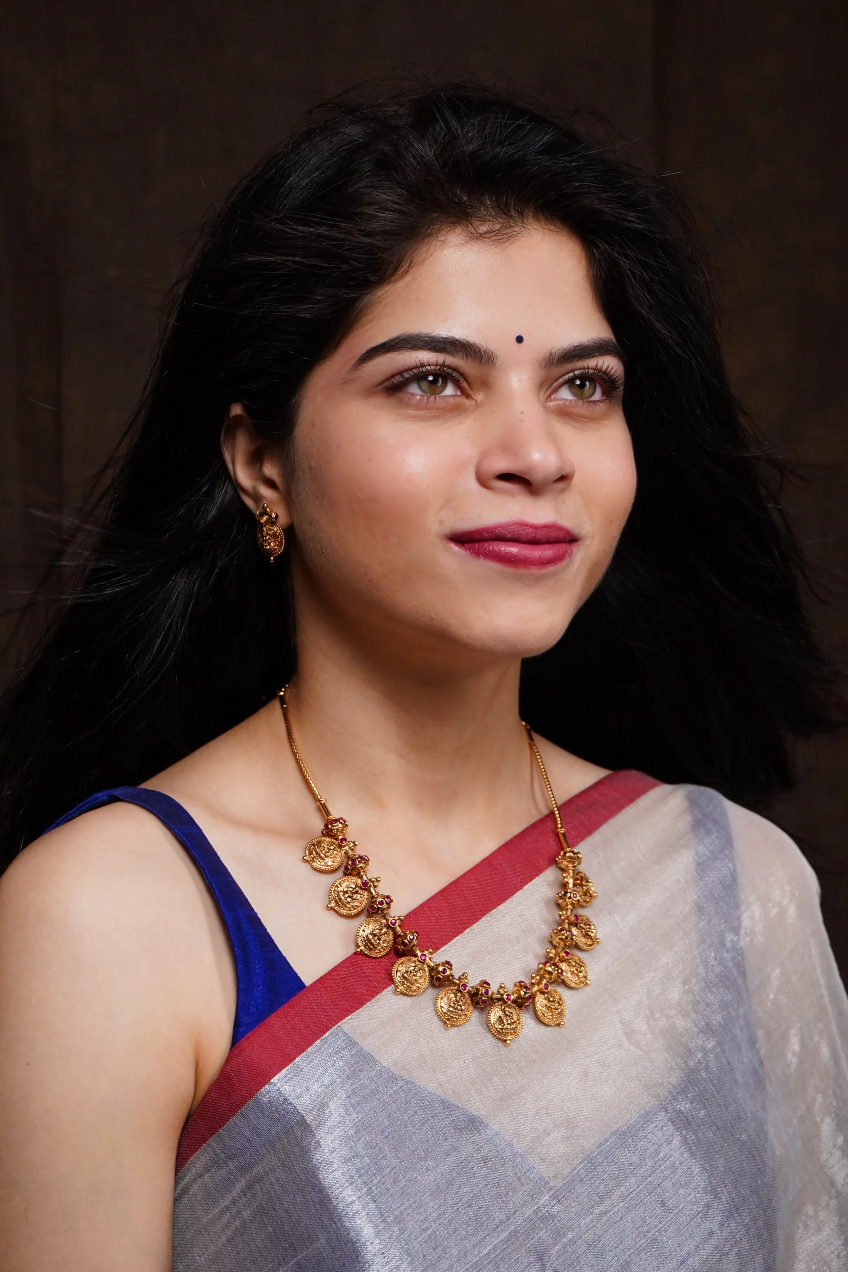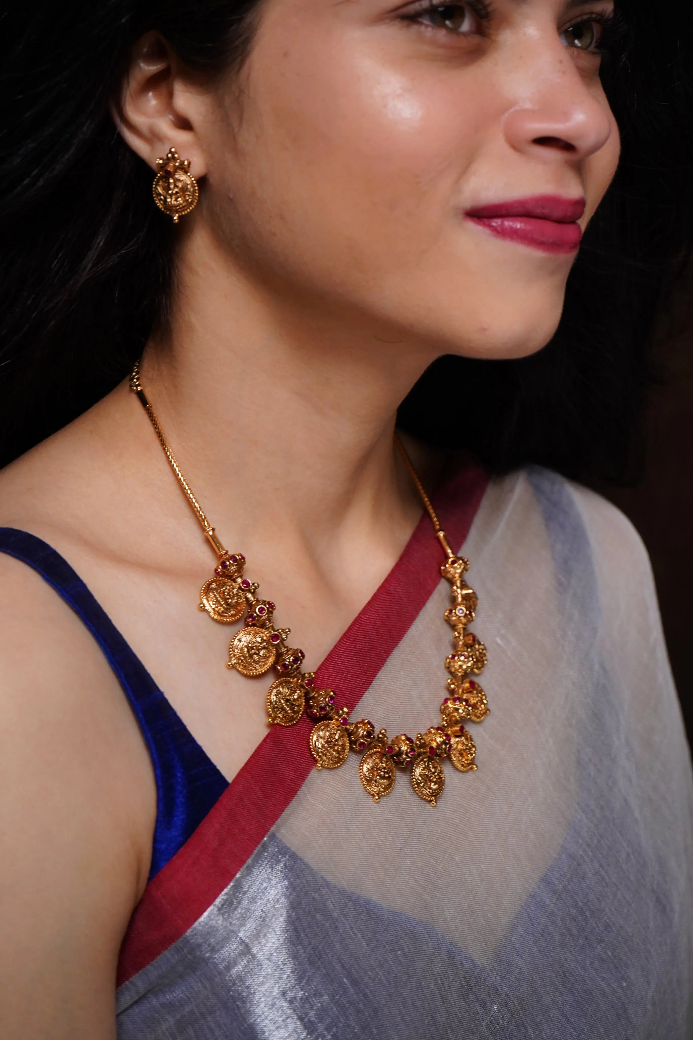 Make a statement with your traditional attire by wearing the ANIKHA KASU EARRING. The Lakshmi motifs add a charming South Indian touch to this elegant necklace, making it suitable for both temple visits and special occasions. Made with 24ct gold plated silver alloy, it adds a sophisticated touch to your sarees. Elevate your style and showcase your love for temple jewellery.