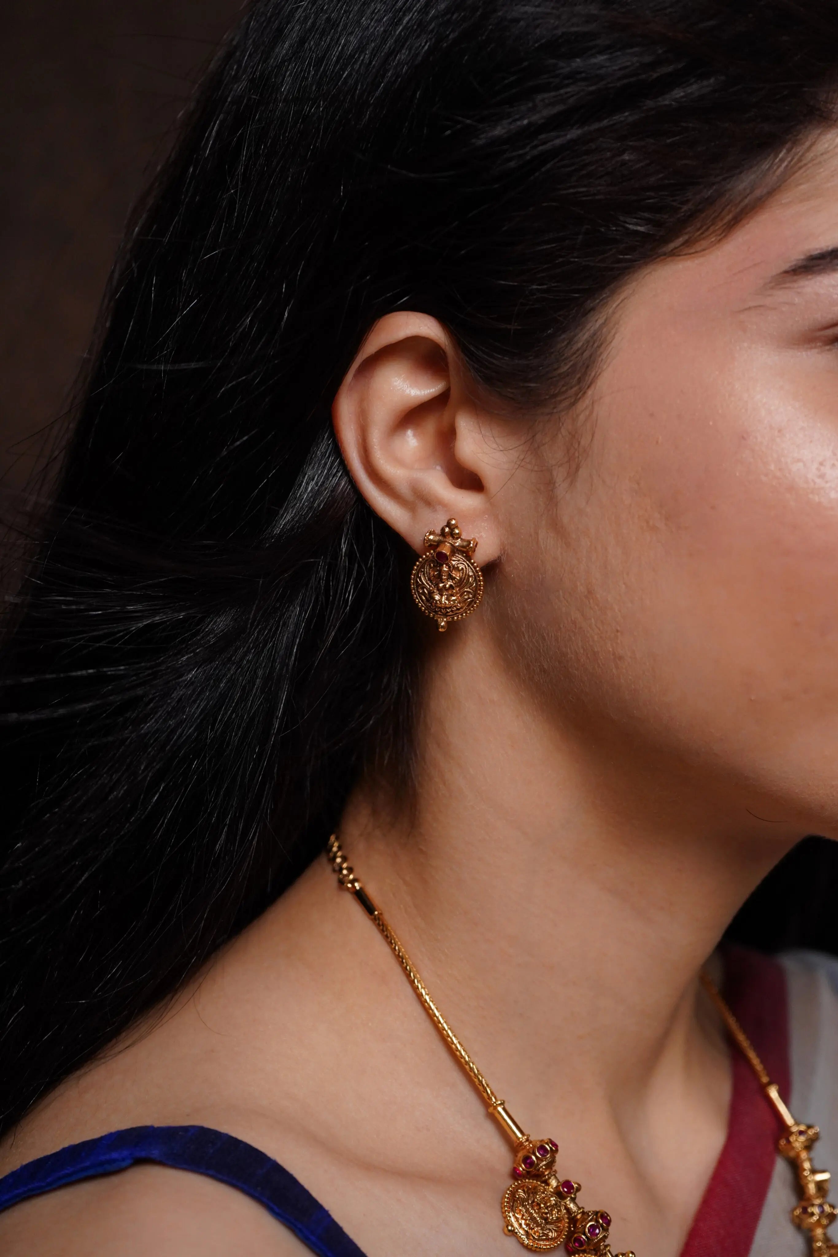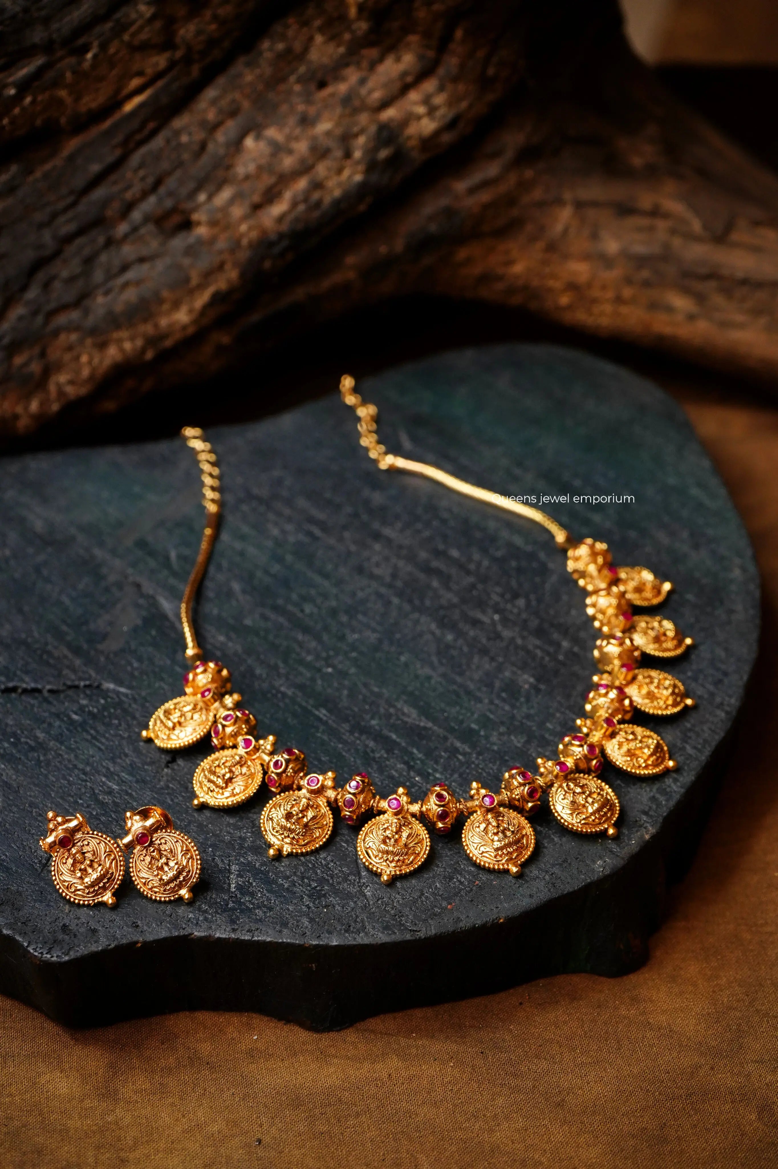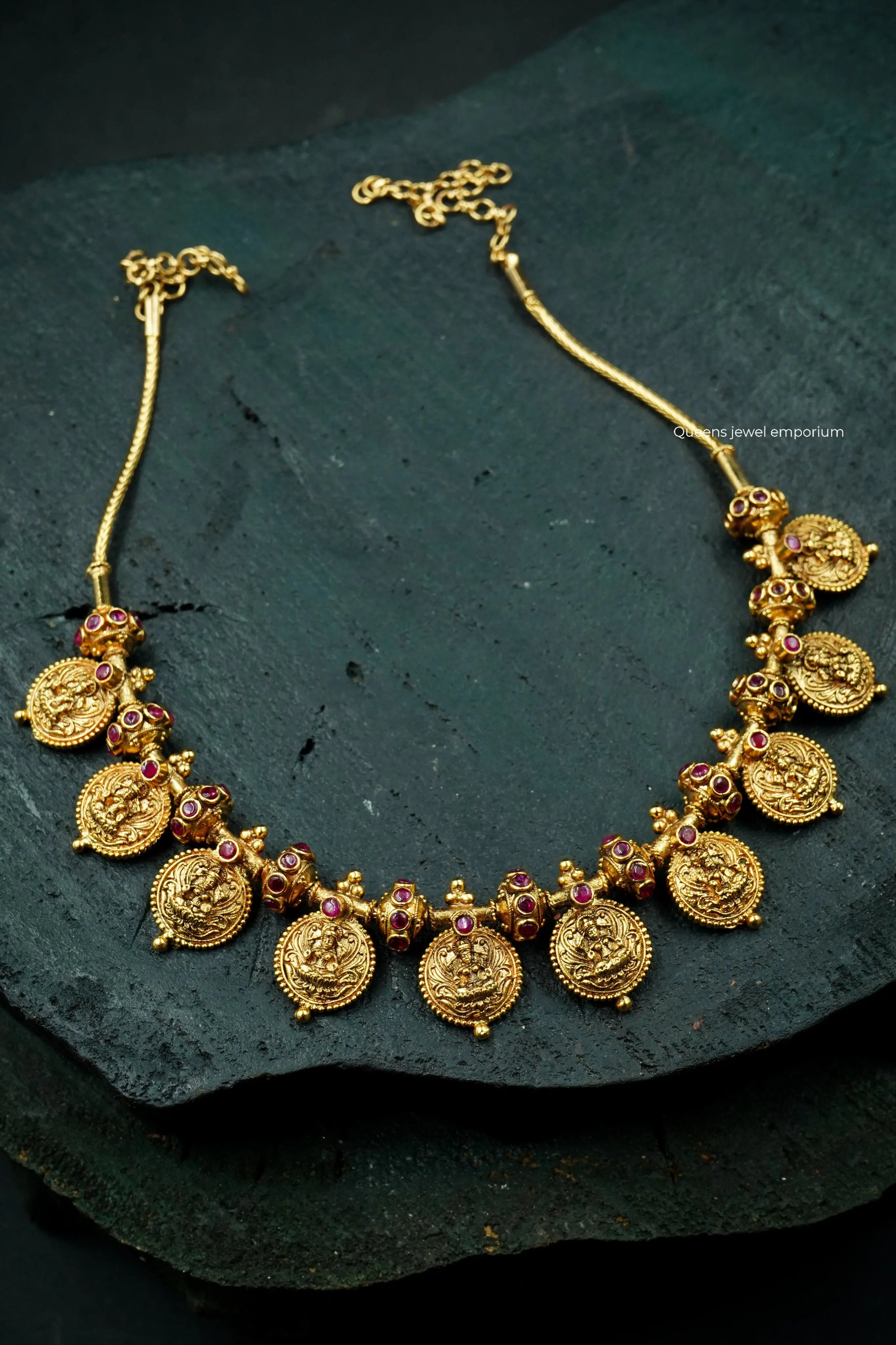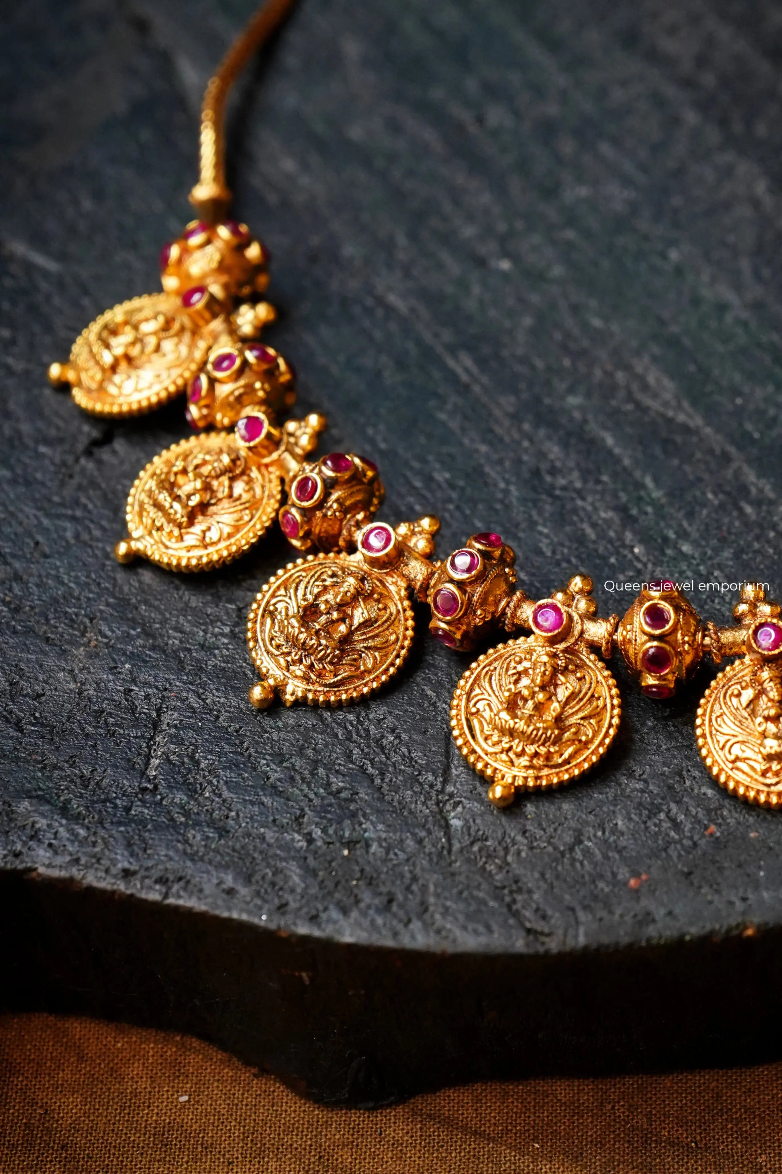 Make a statement with your traditional attire by wearing the ANIKHA KASU NECKLACE. The Lakshmi motifs add a charming South Indian touch to this elegant necklace, making it suitable for both temple visits and special occasions. Made with 24ct gold plated silver alloy, it adds a sophisticated touch to your sarees. Elevate your style and showcase your love for temple jewellery.Special occasion for onam.