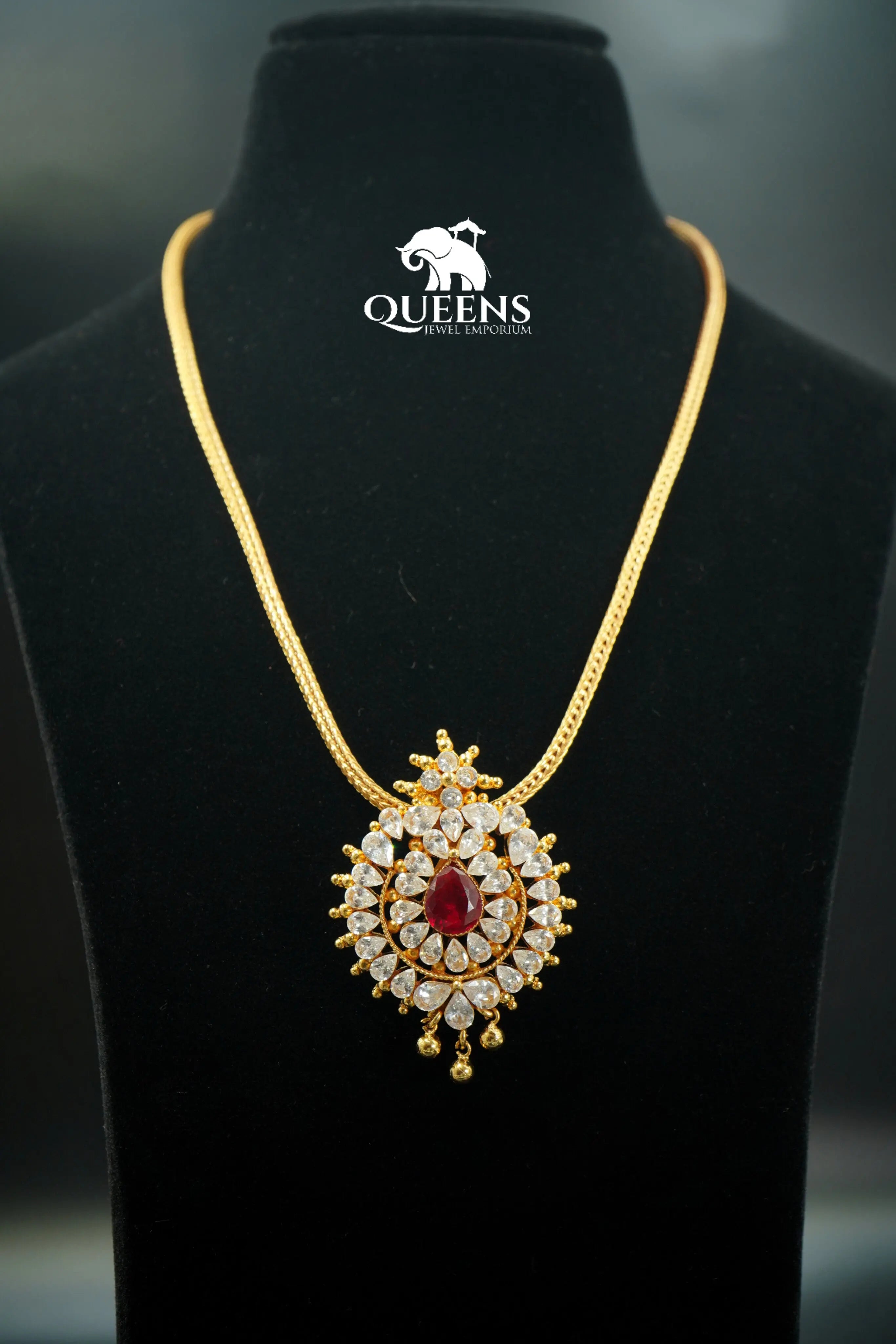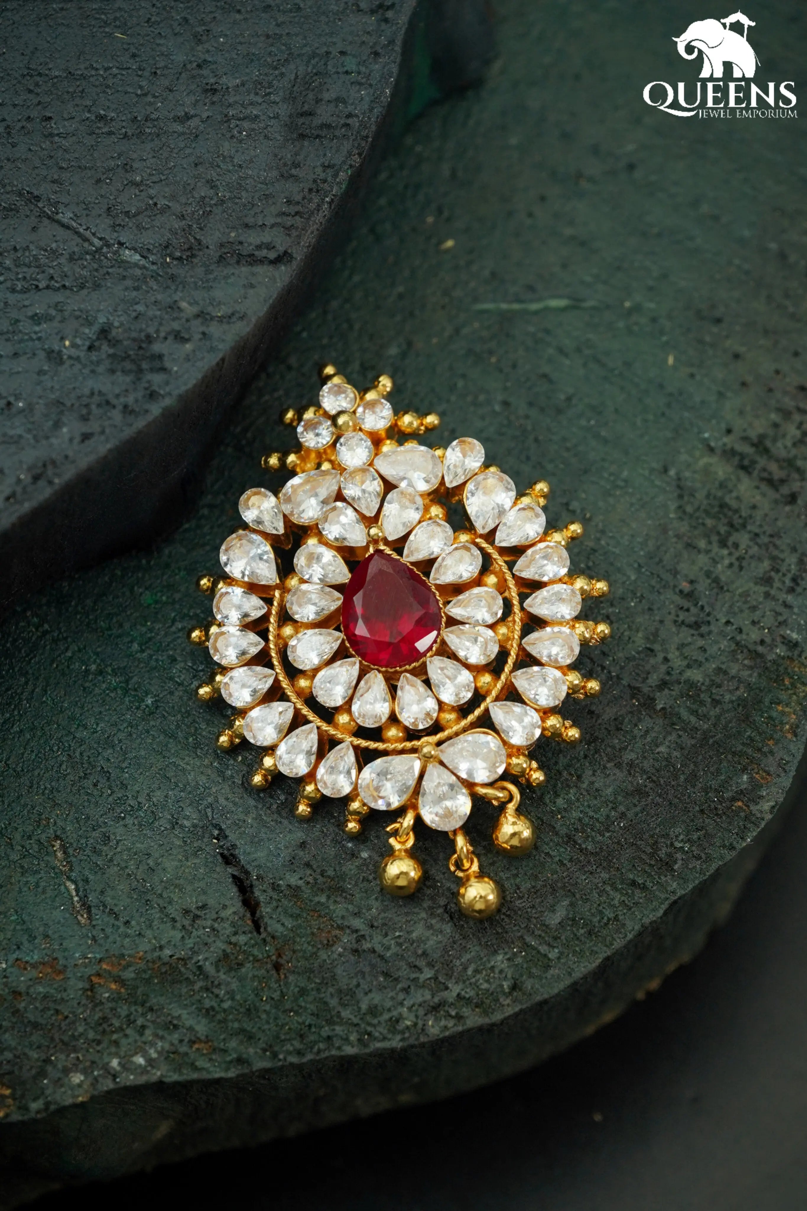 Introducing the ANJALI PENDANT, a stunning addition to any traditional South Indian jewelry collection. This pendant features sparkling zircon and pink stones, highlighted by elegant gold balls and perfect for any wedding or special occasion. Elevate your Pattu Sarees with this beautiful pendant.