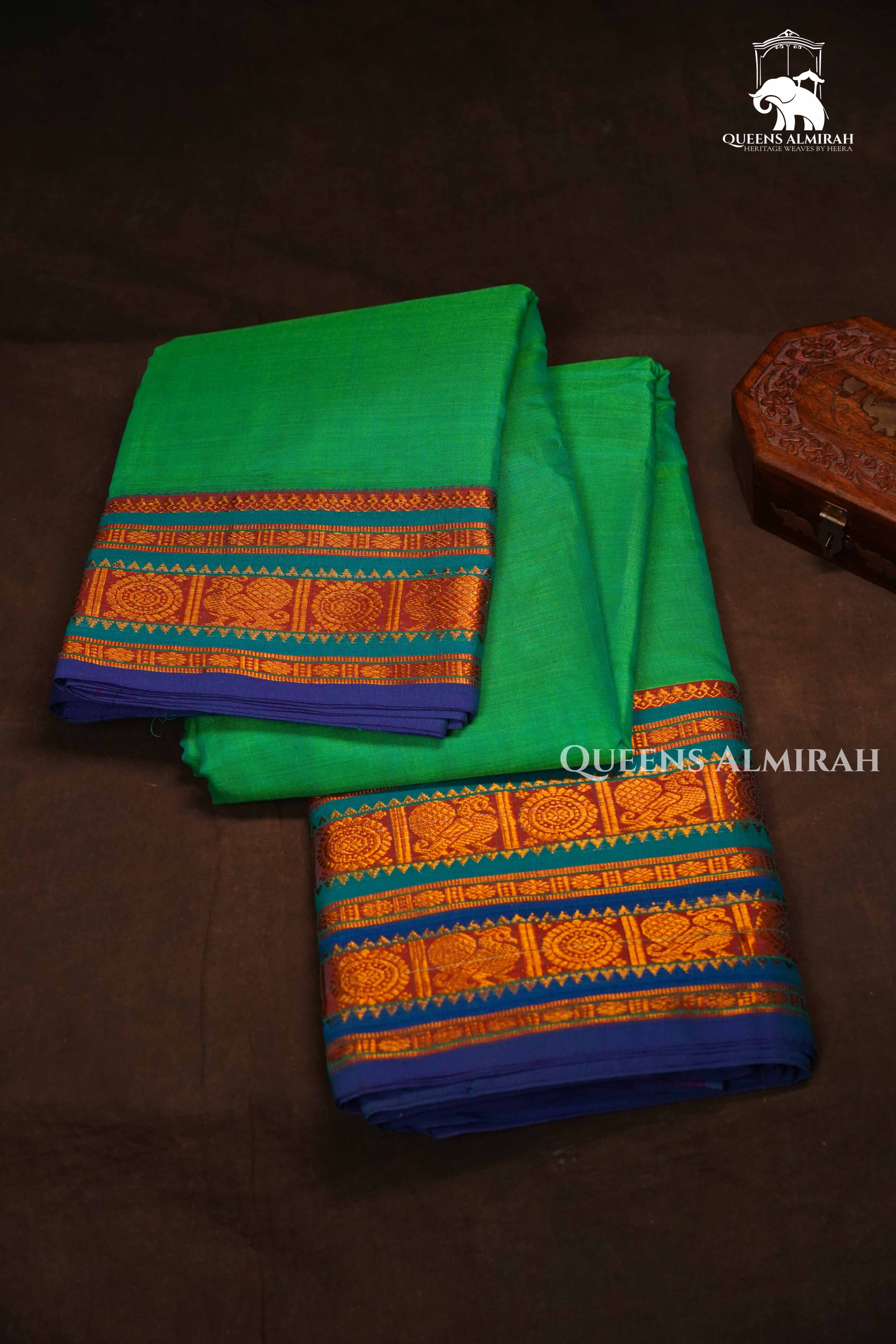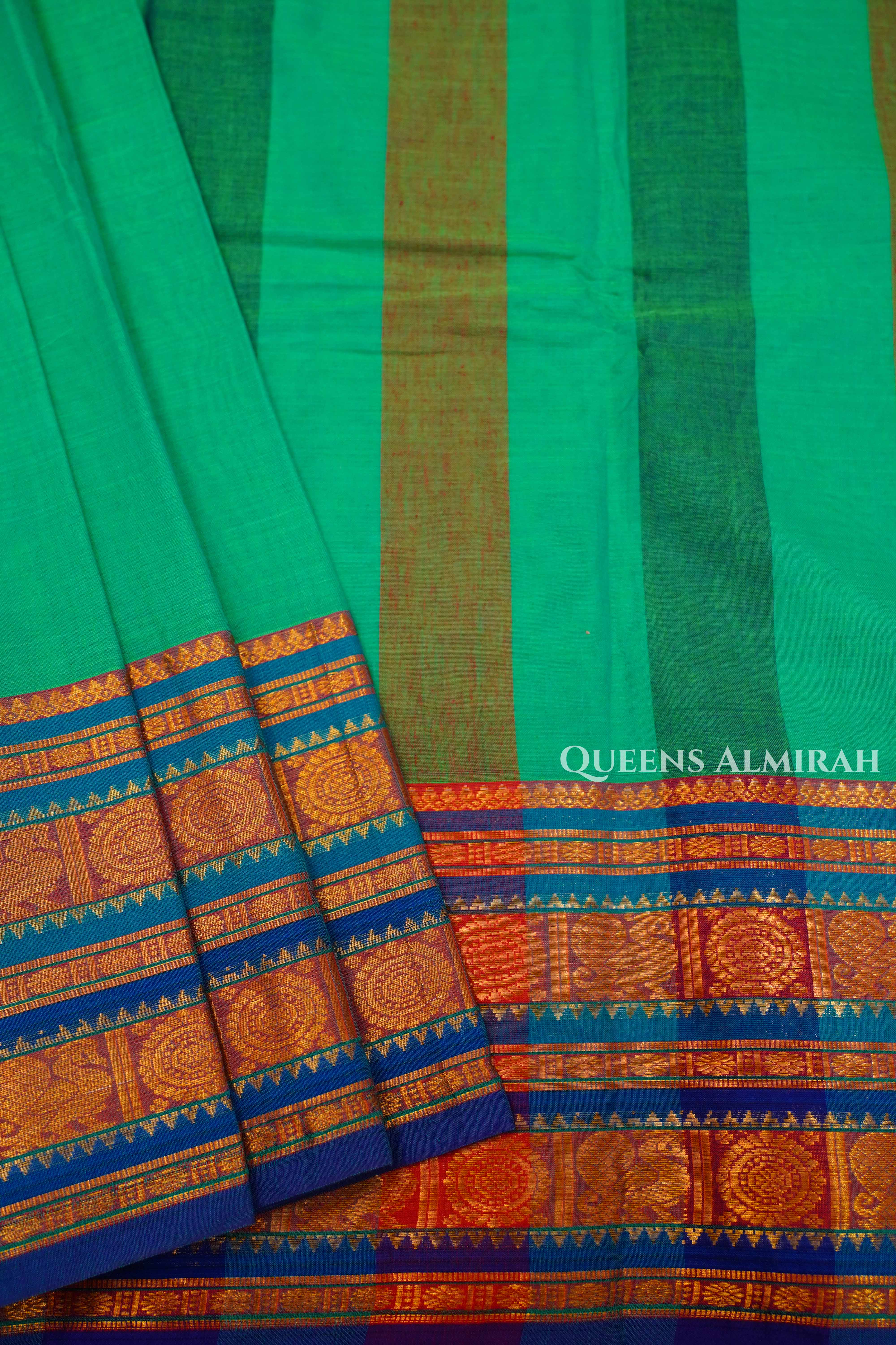 "Exude subtle charm with this elegant Aqua Green saree, adorned with delicate golden zari weaving and a rich contrasting border. Its soft hue blends sophistication with tradition, making it an ideal choice for festive celebrations and graceful occasions."