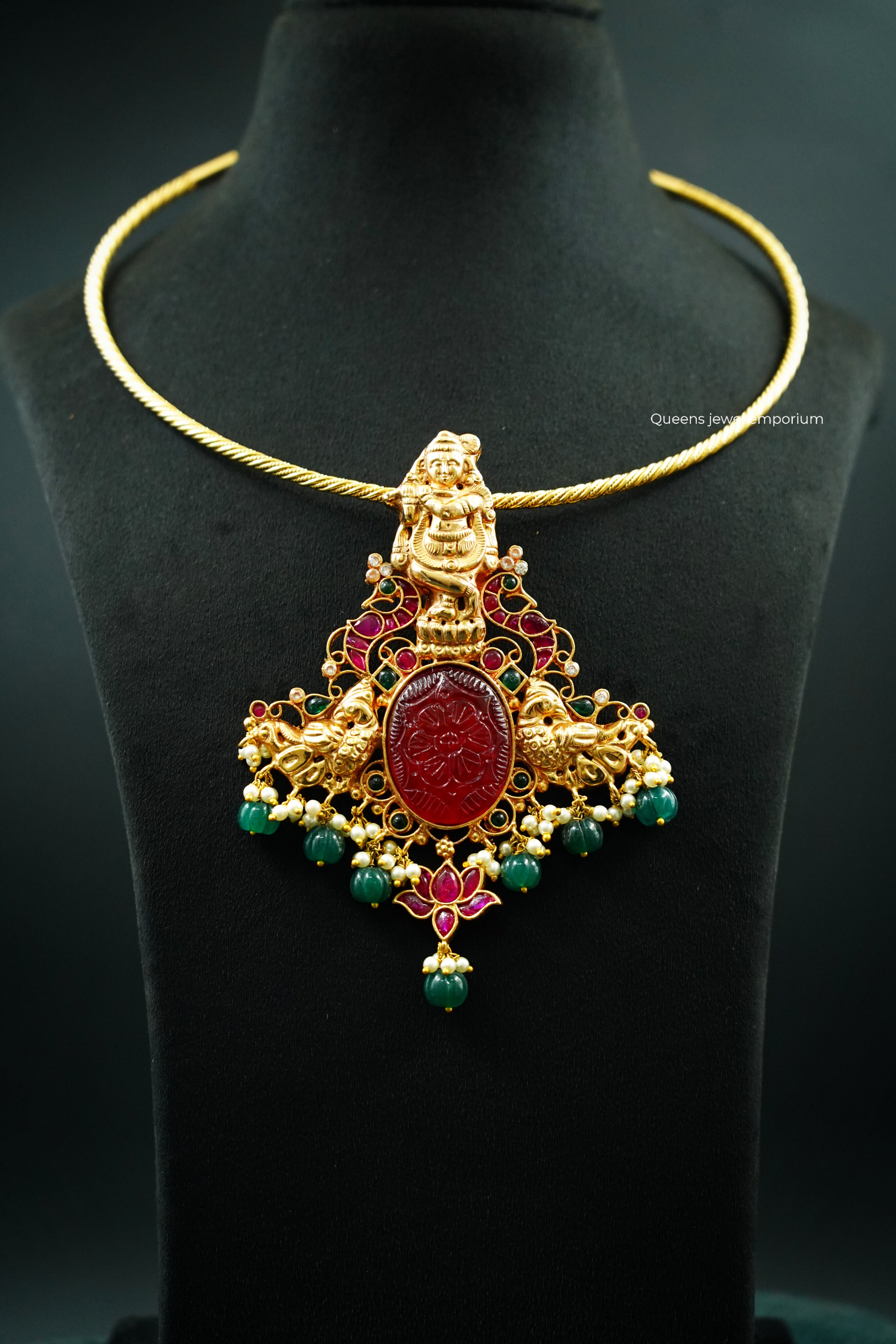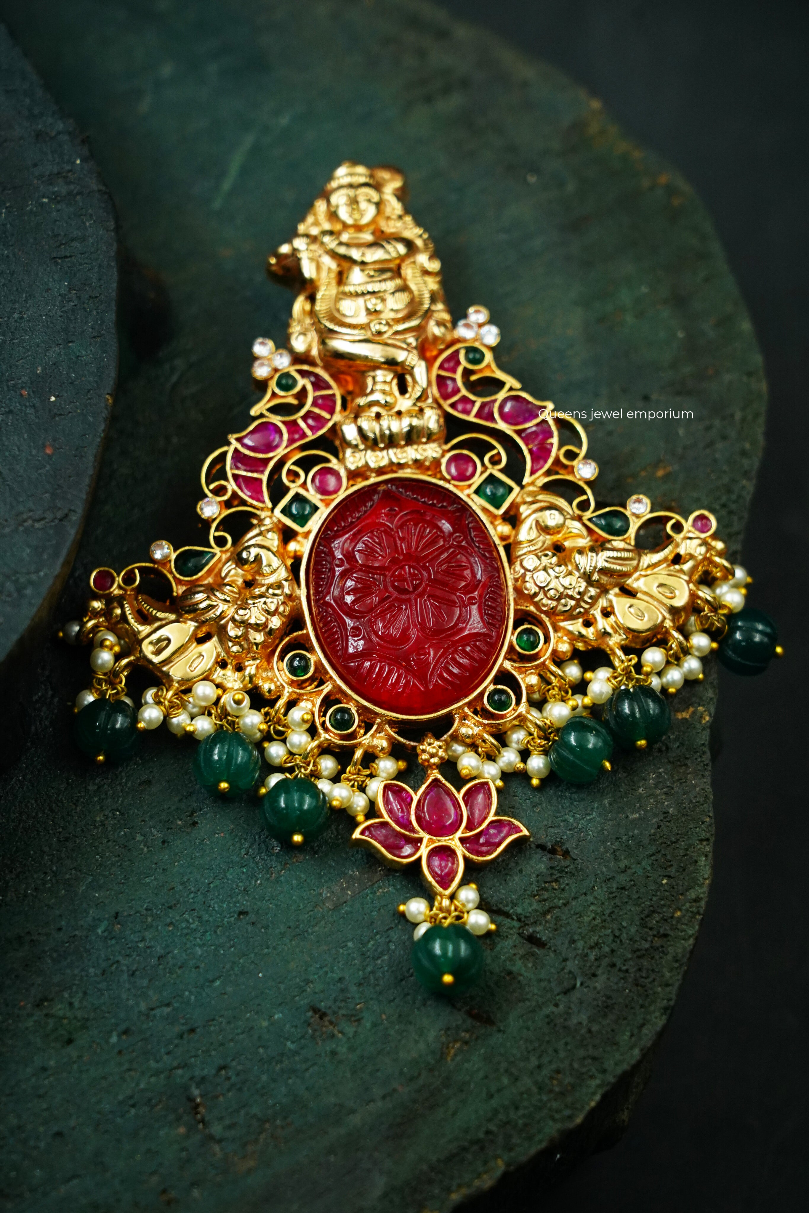 Carved red stone centerpiece with nagas Krishnar motif on top and nagas peacock motif, finished with baby pearls and green pumpkin-shaped bead hangings. A captivating pendant, handcrafted by Queens Jewel Emporium for traditional elegance.