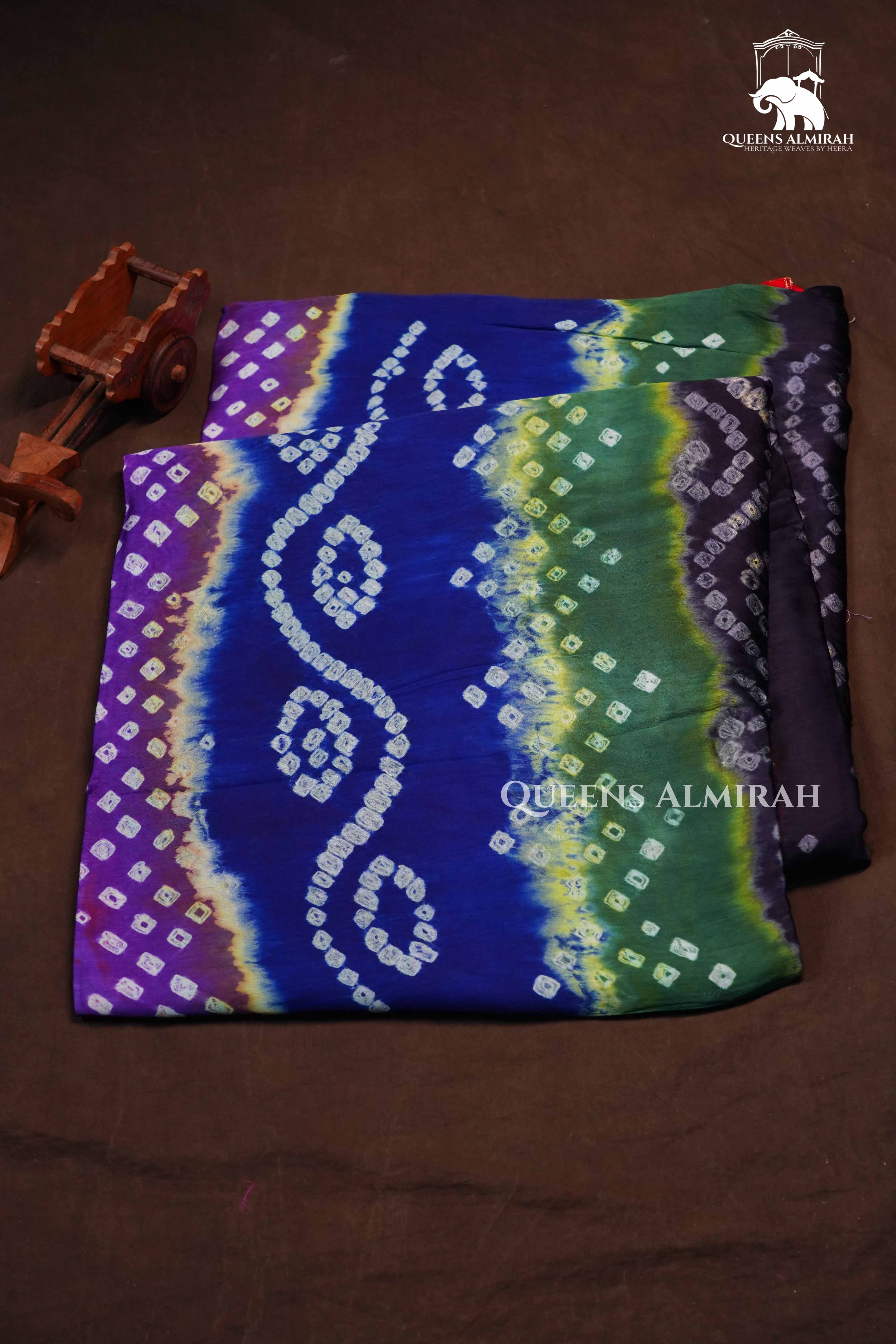 Elevate your style with our MARINE BLUE MODAL SILK SAREE. Made from the finest modal silk, it features an exquisite Bandhini tie-dye design and rich Plum Purple color. The multishade rainbow pallu adds a touch of elegance. Look and feel beautiful in this must-have saree.