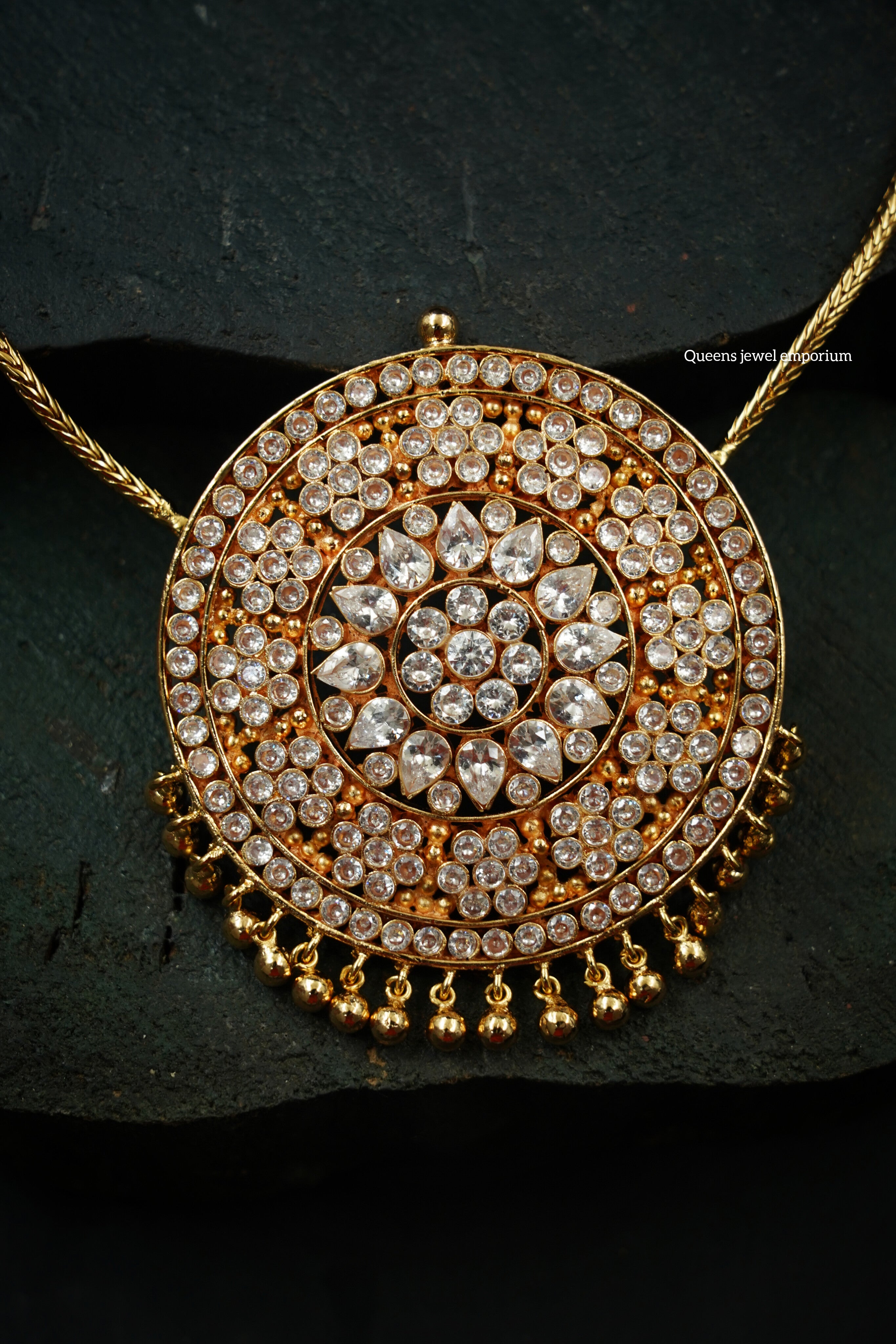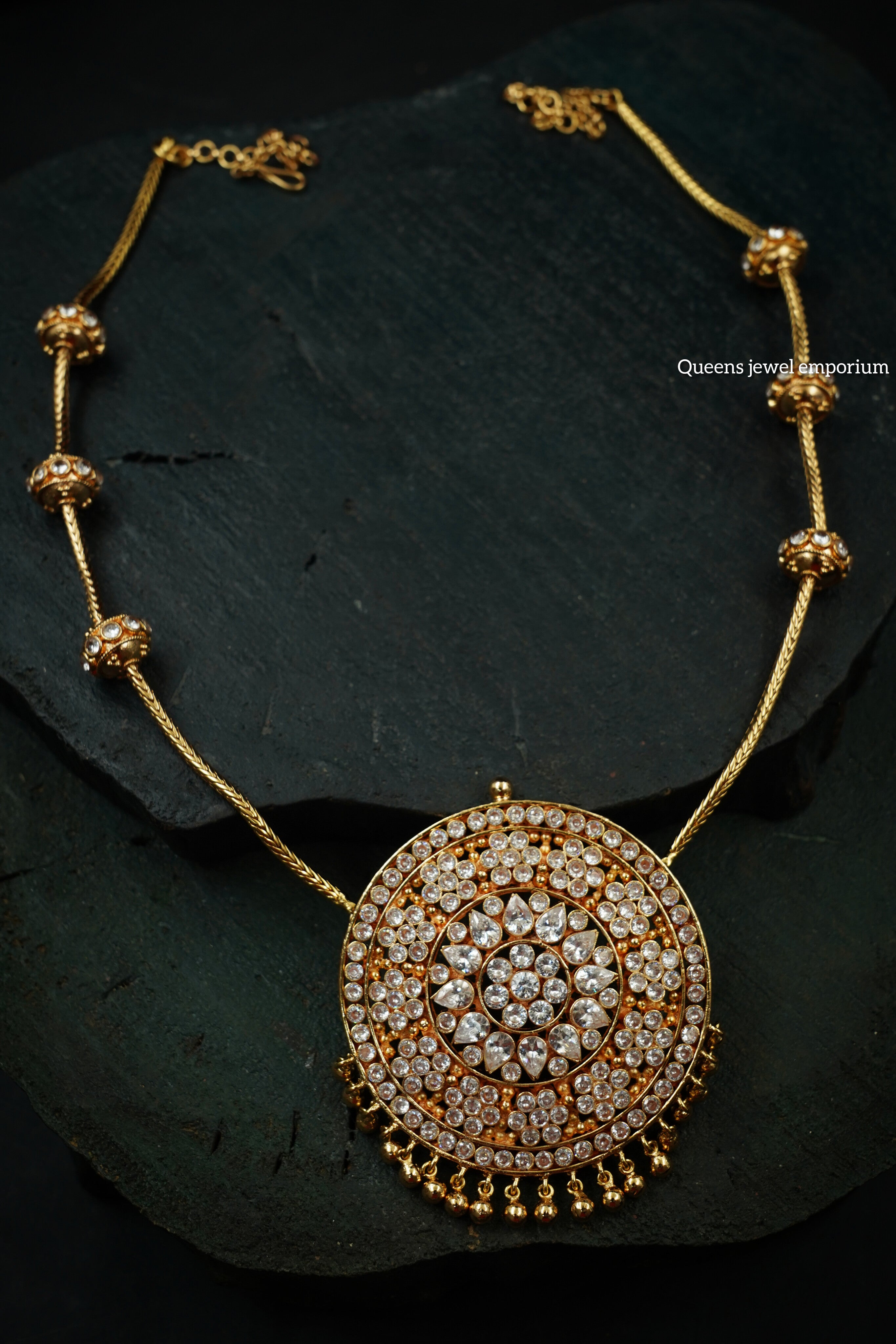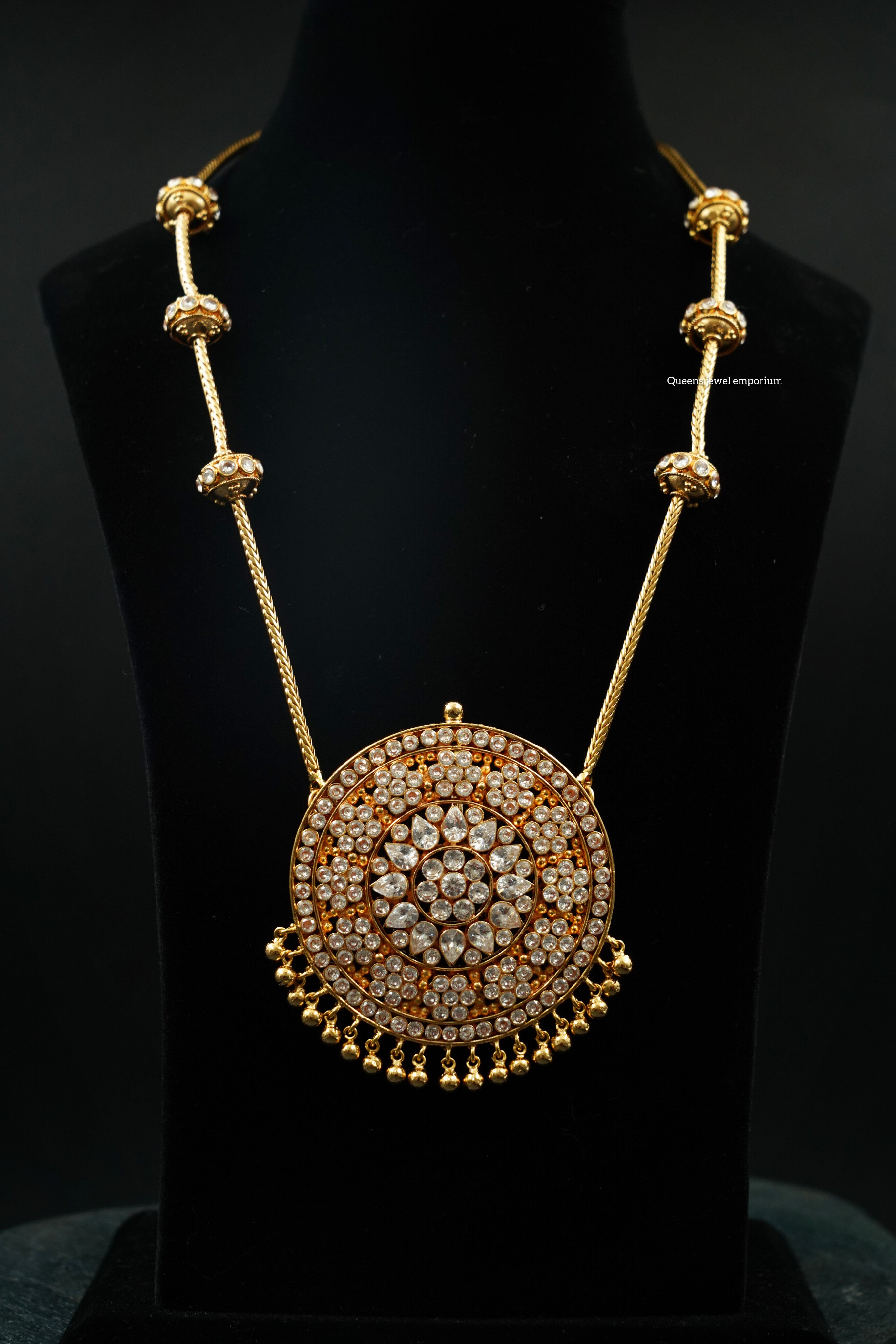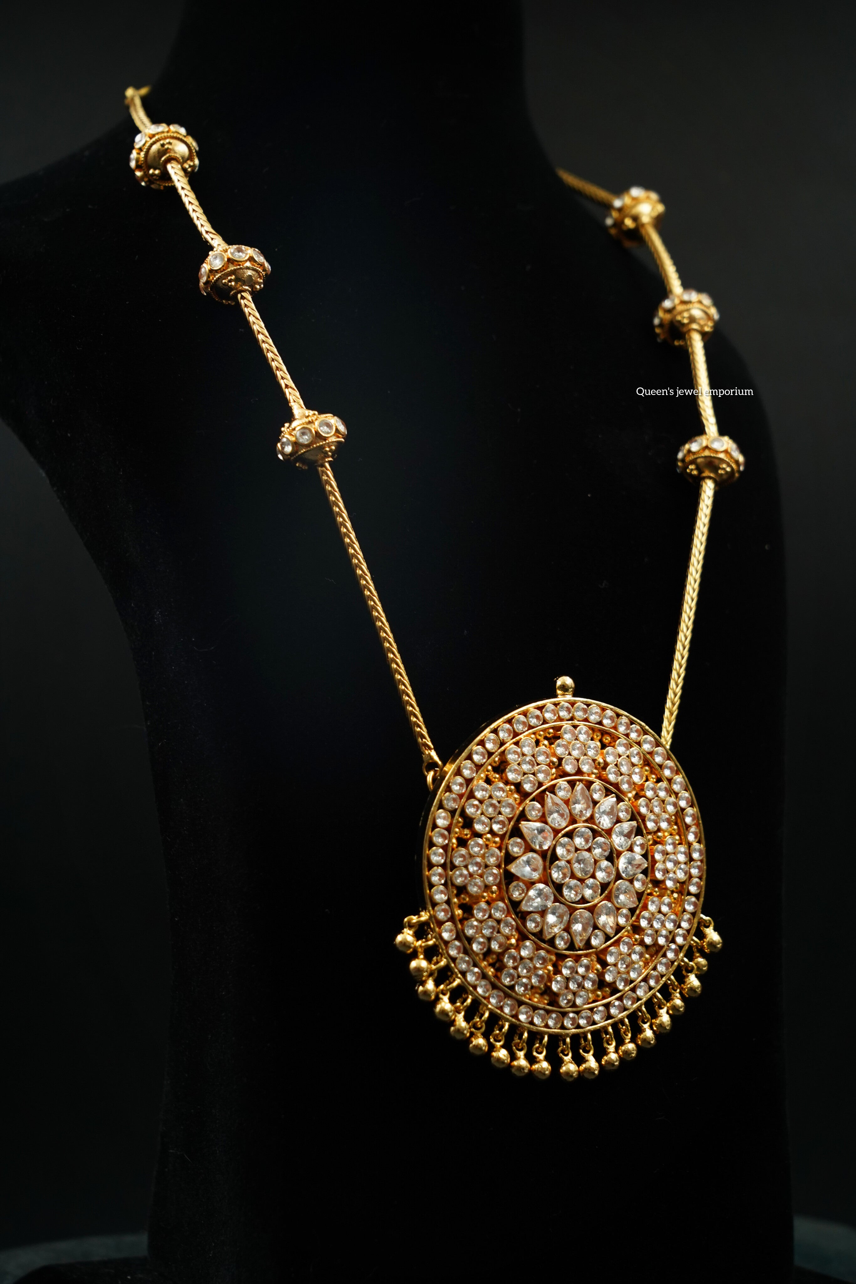 Crafted in 24CT gold-plated silver alloy using multiple thick gold sheet forming technique. Adorn your traditional attire with this impeccably crafted rakadai haram. A jadavillai type pendant joined with a kodi chain that's embellished with the stone balls.Pair it up with zari less kanjeevarams or tissue linens to keep up with the trend.