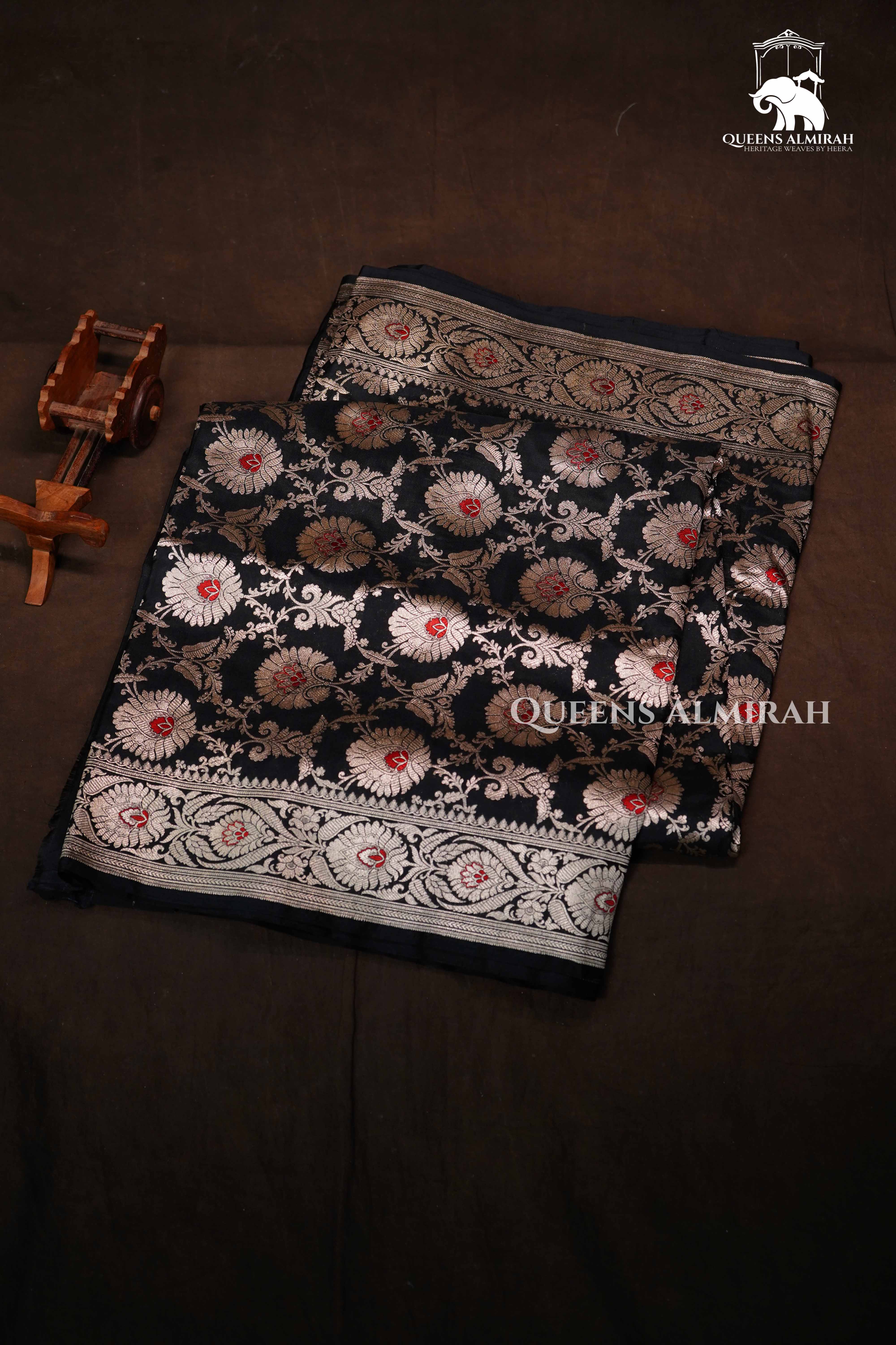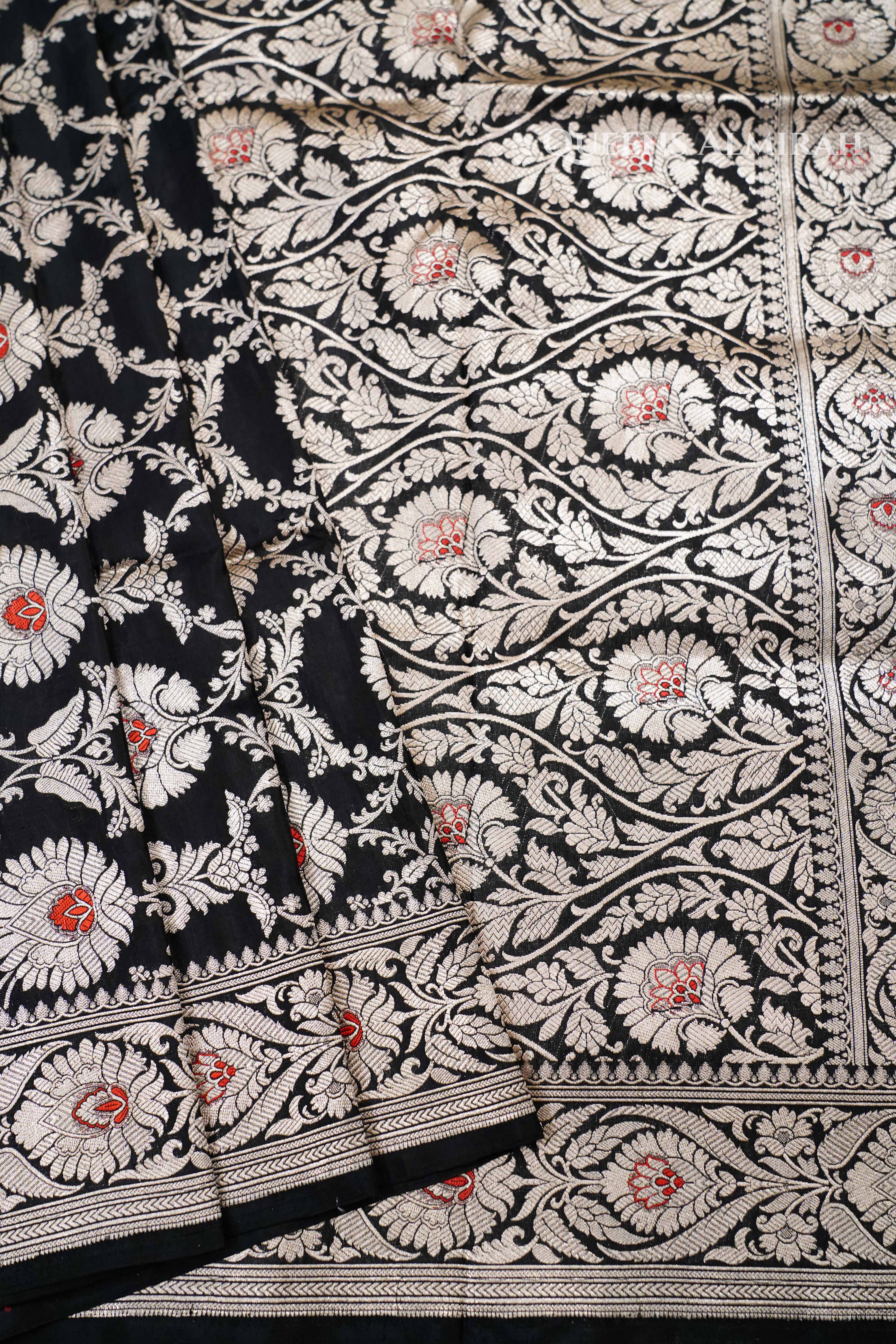 Make a statement with this elegant black Banarasi silk saree featuring exquisite silver zari floral motifs and intricately woven borders. The subtle hints of red in the blooms add charm and sophistication — a perfect blend of bold and traditional for evening occasions and grand festivities.