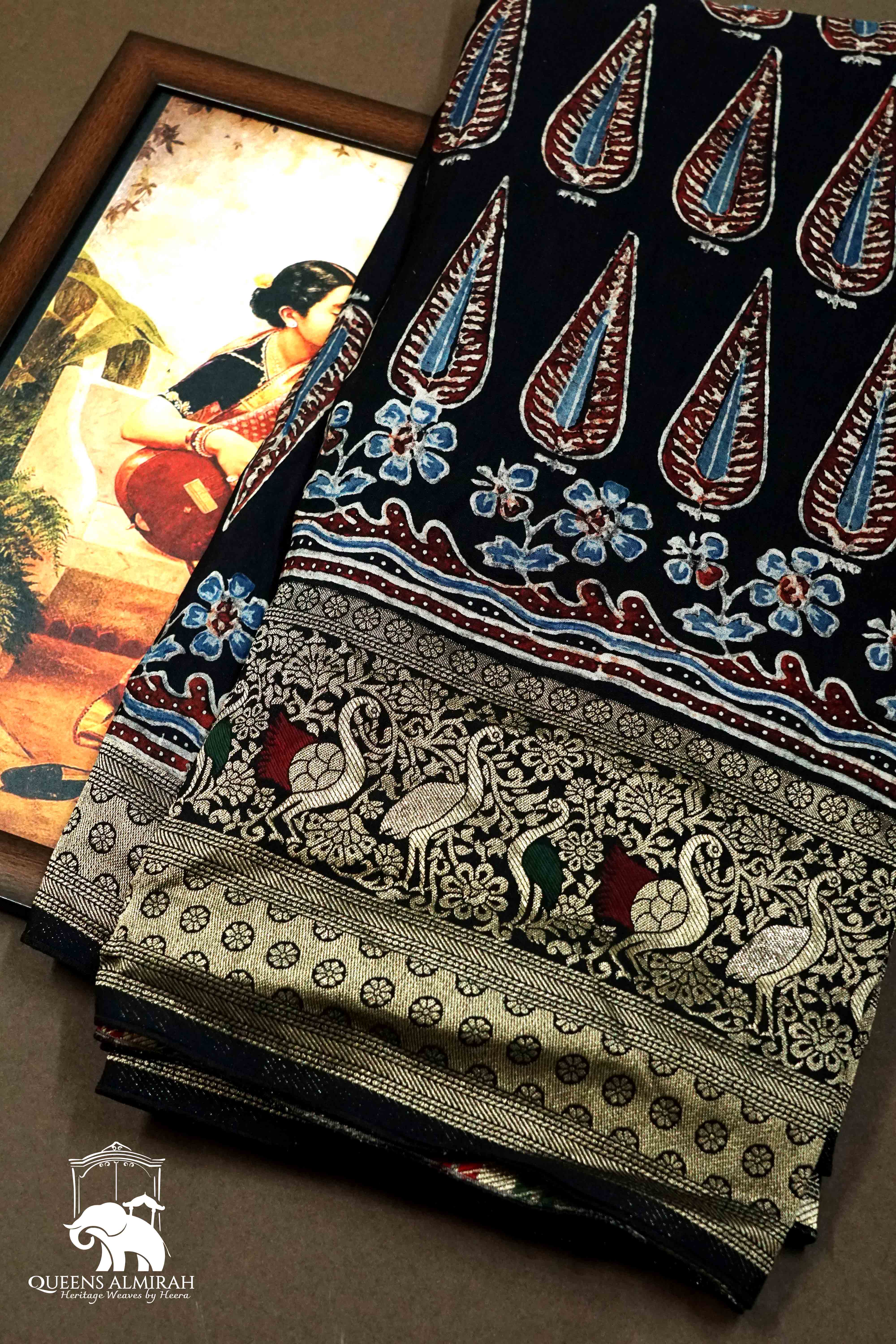 Introduce elegance with our BLACK DOLA AJARAKH SAREE. Naturally dyed, adorned with kanchi pallu, meena work, brocade detailing, and exquisite peacock and flower motifs, this saree exudes sophistication. Elevate your style with this authentic and versatile statement piece. Perfect for any occasion.