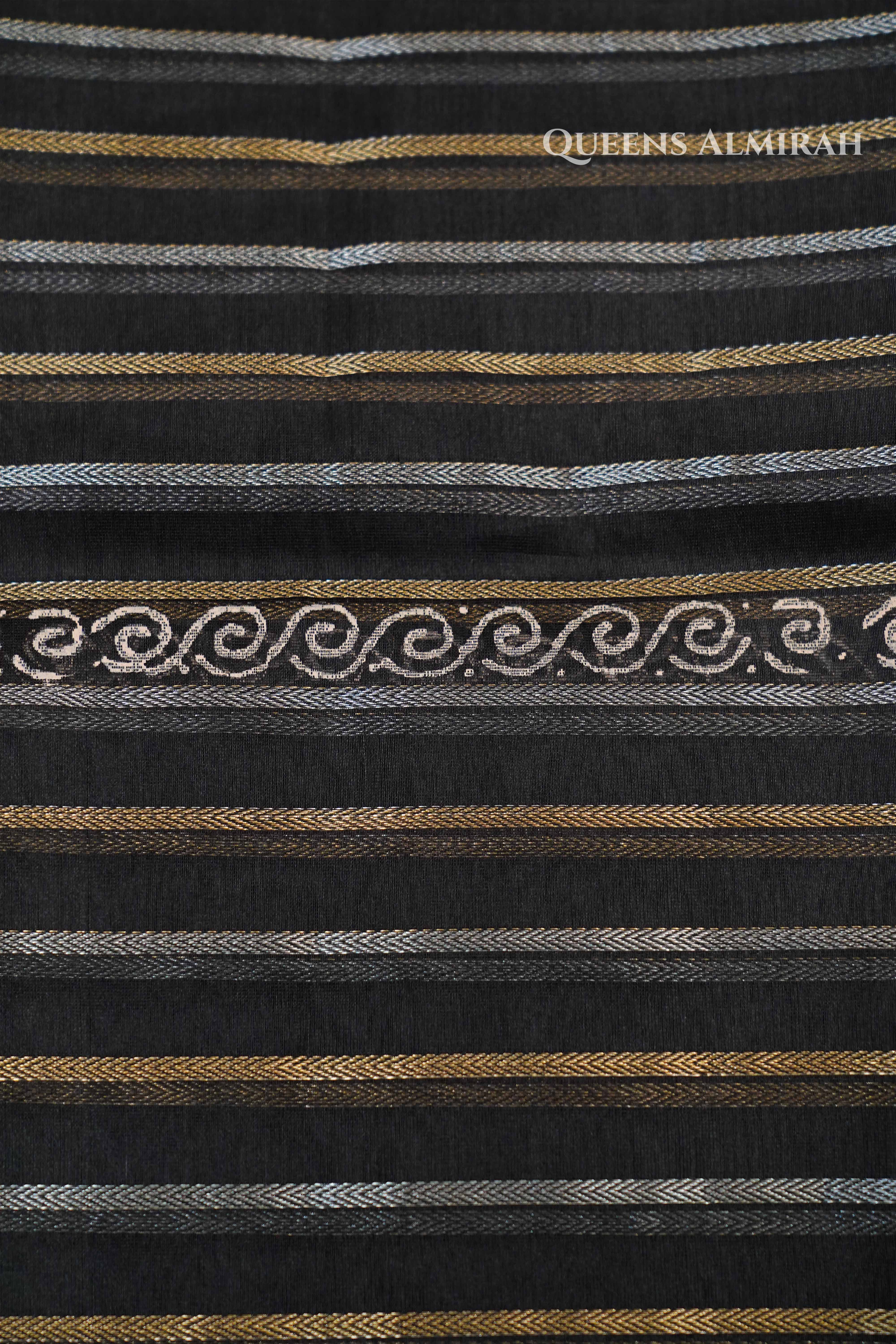 This black Katan Organza saree blends sheer elegance with timeless craftsmanship. Adorned with delicate golden zari stripes and wave motifs, it offers a luxurious yet lightweight drape. Perfect for evening occasions, this saree brings a regal touch to modern ethnic styling.