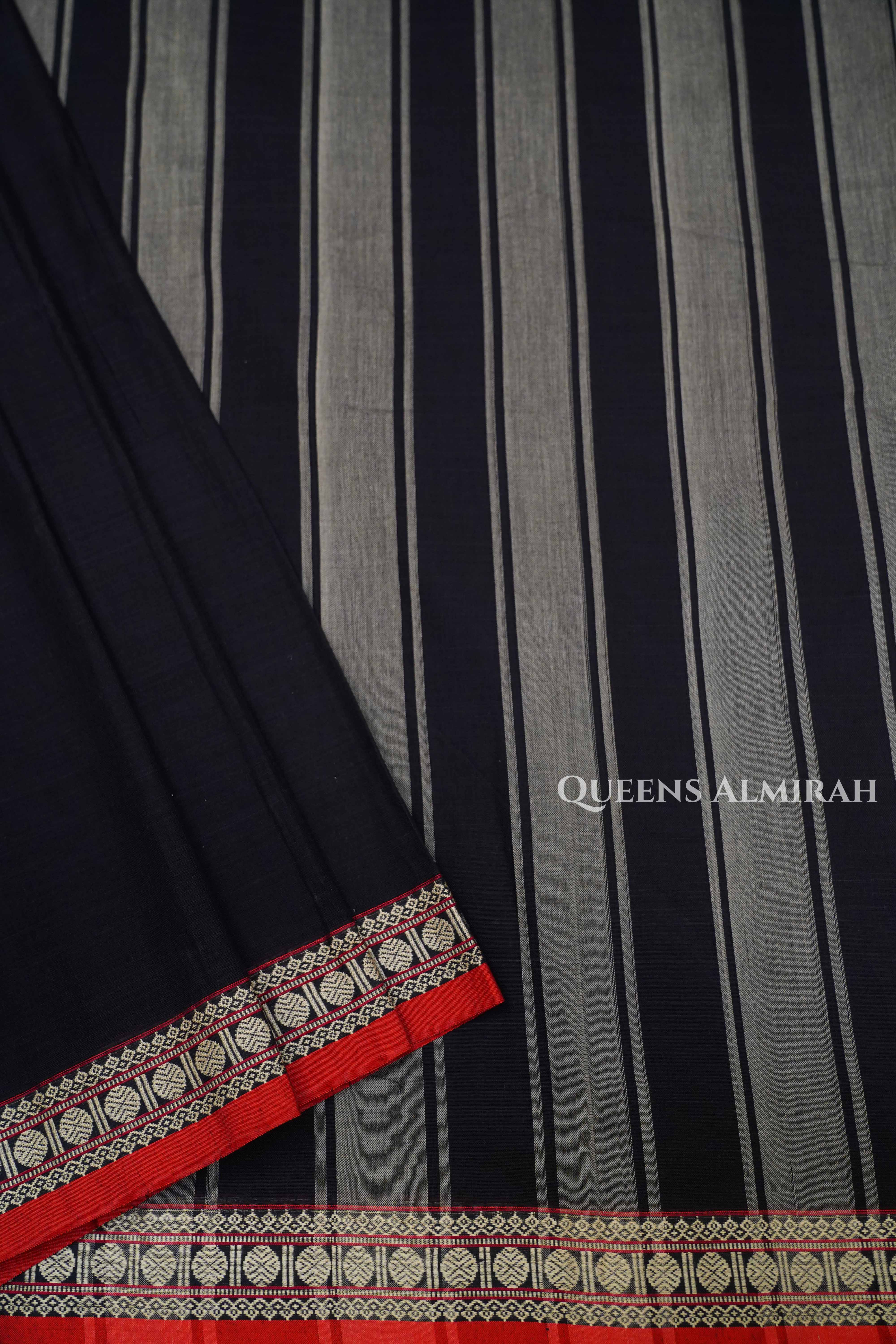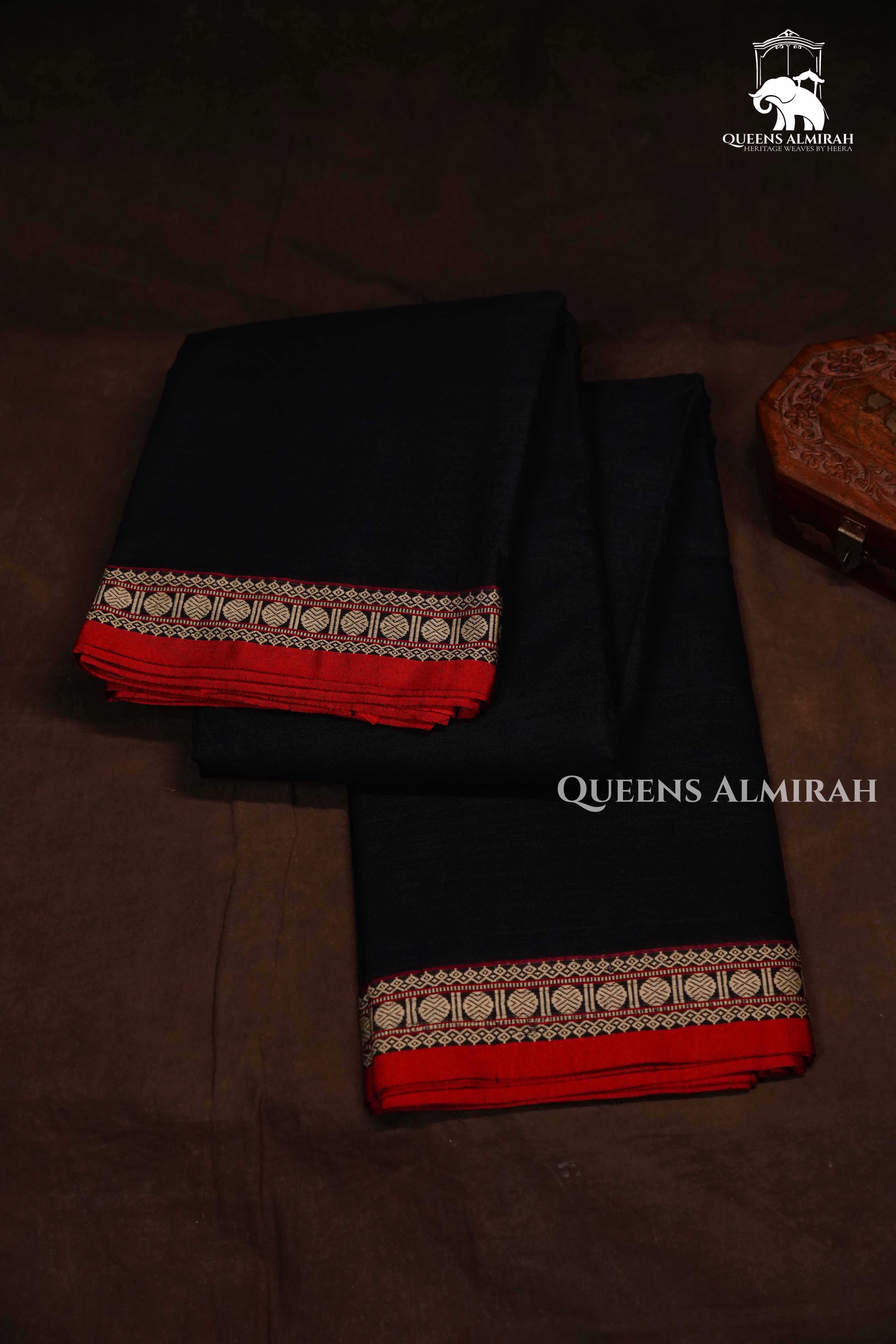 "Elegant black handwoven saree featuring a rich solid body and minimal golden zari border, perfect for weddings, festive occasions, and traditional celebrations."