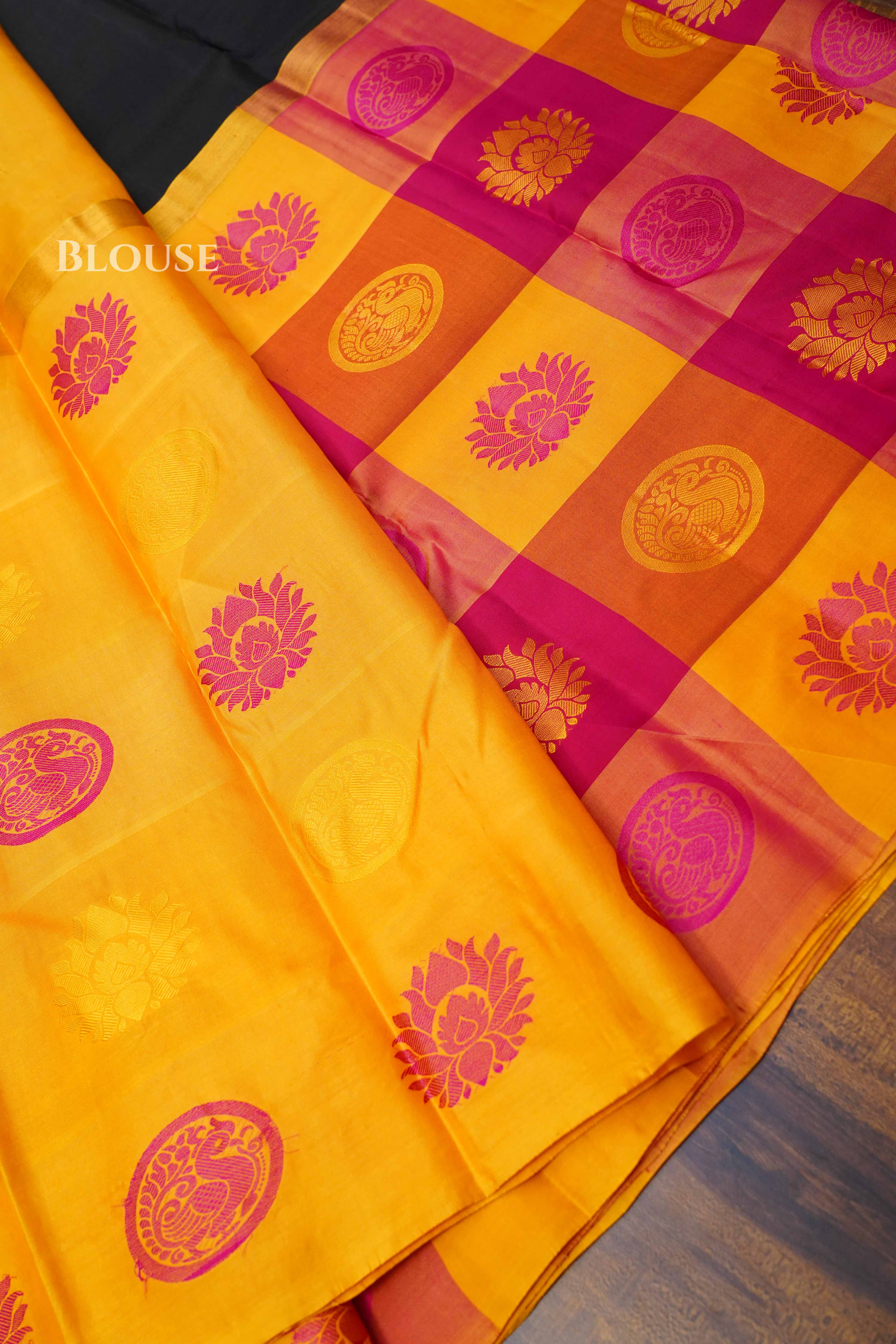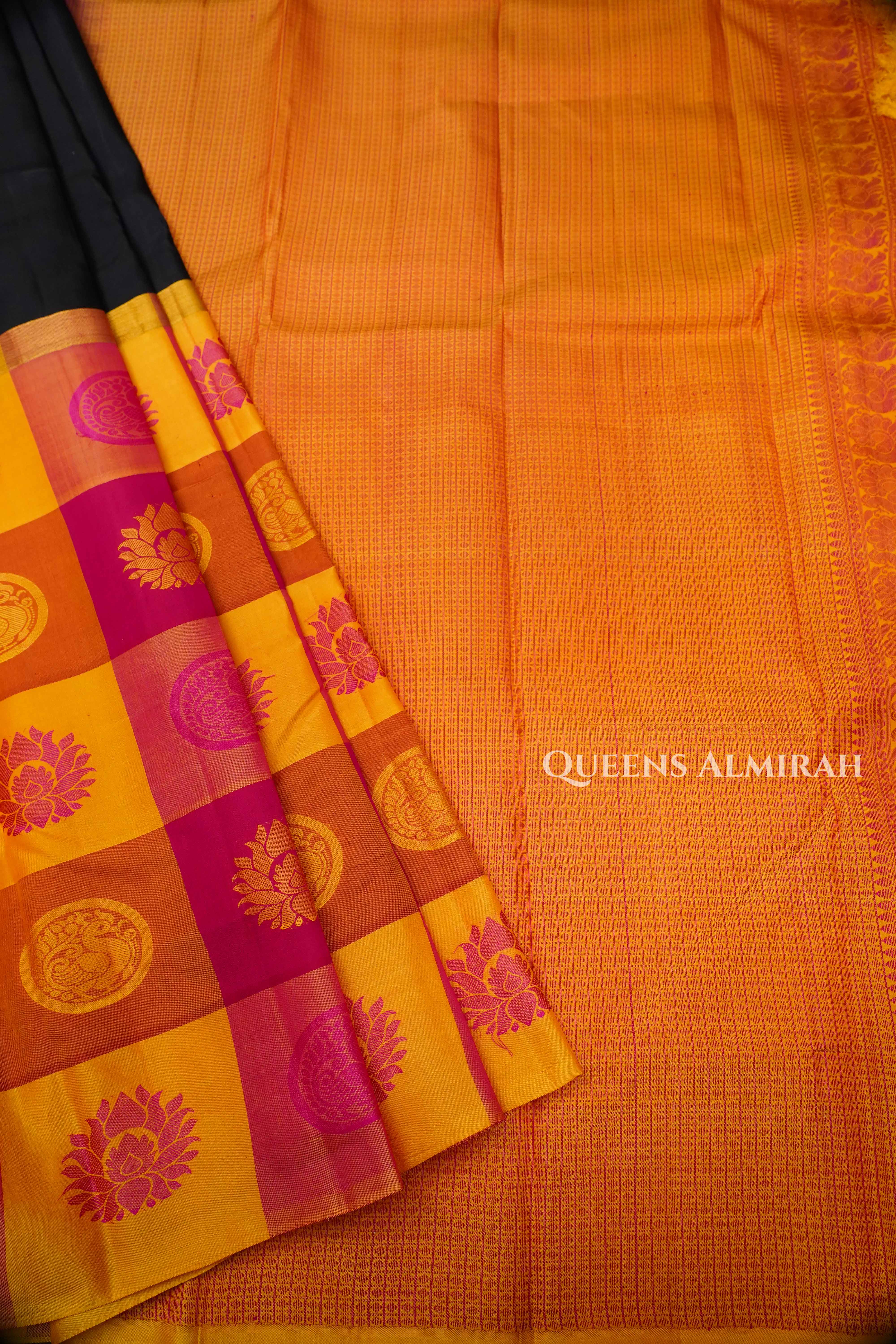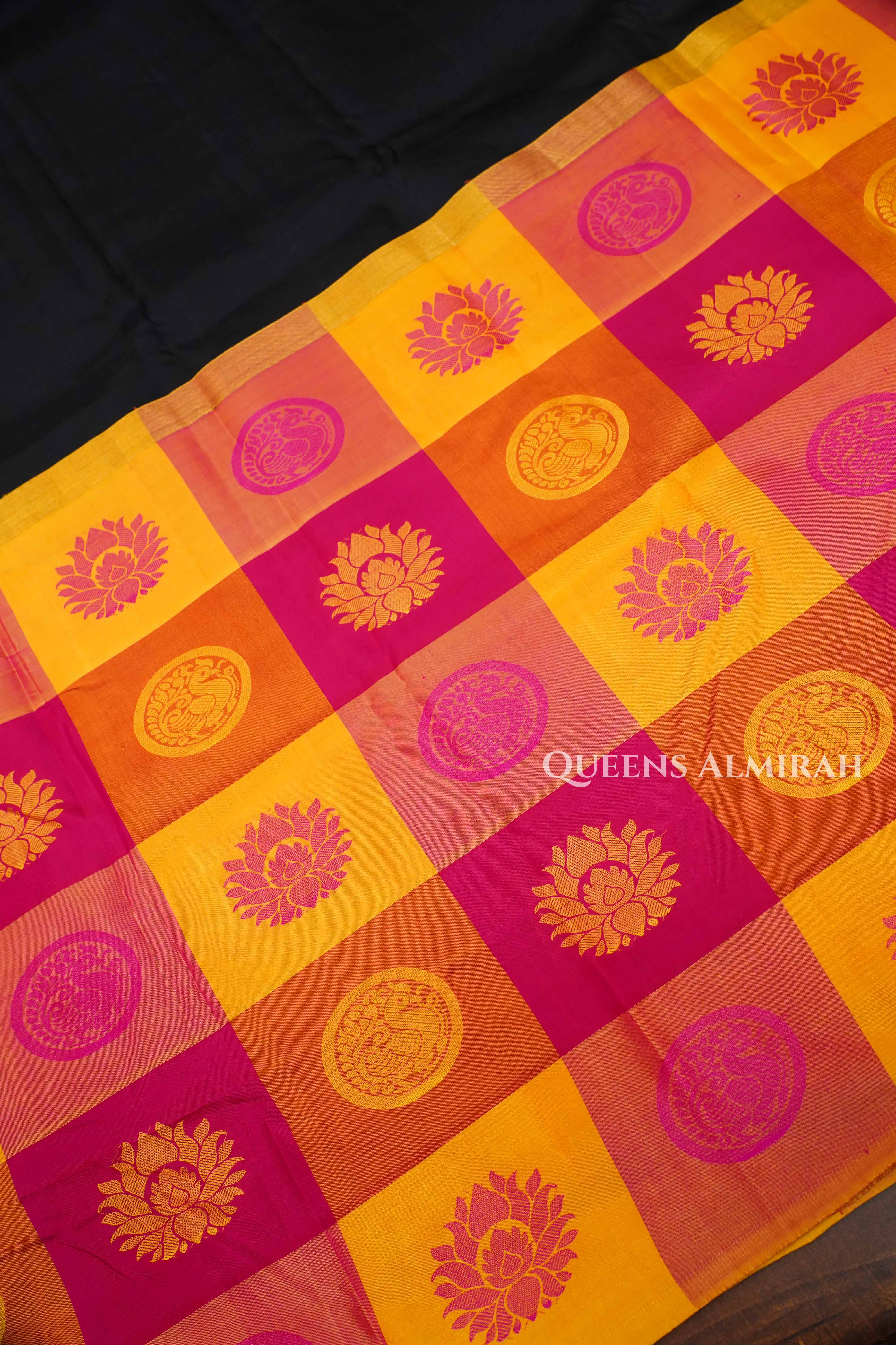 "Kuravanji silk saree in off-and-of black and shades of magenta, mustard, and rust, featuring traditional floral and paisley motifs with a striking black body. Perfect for weddings, festive occasions, and cultural events."