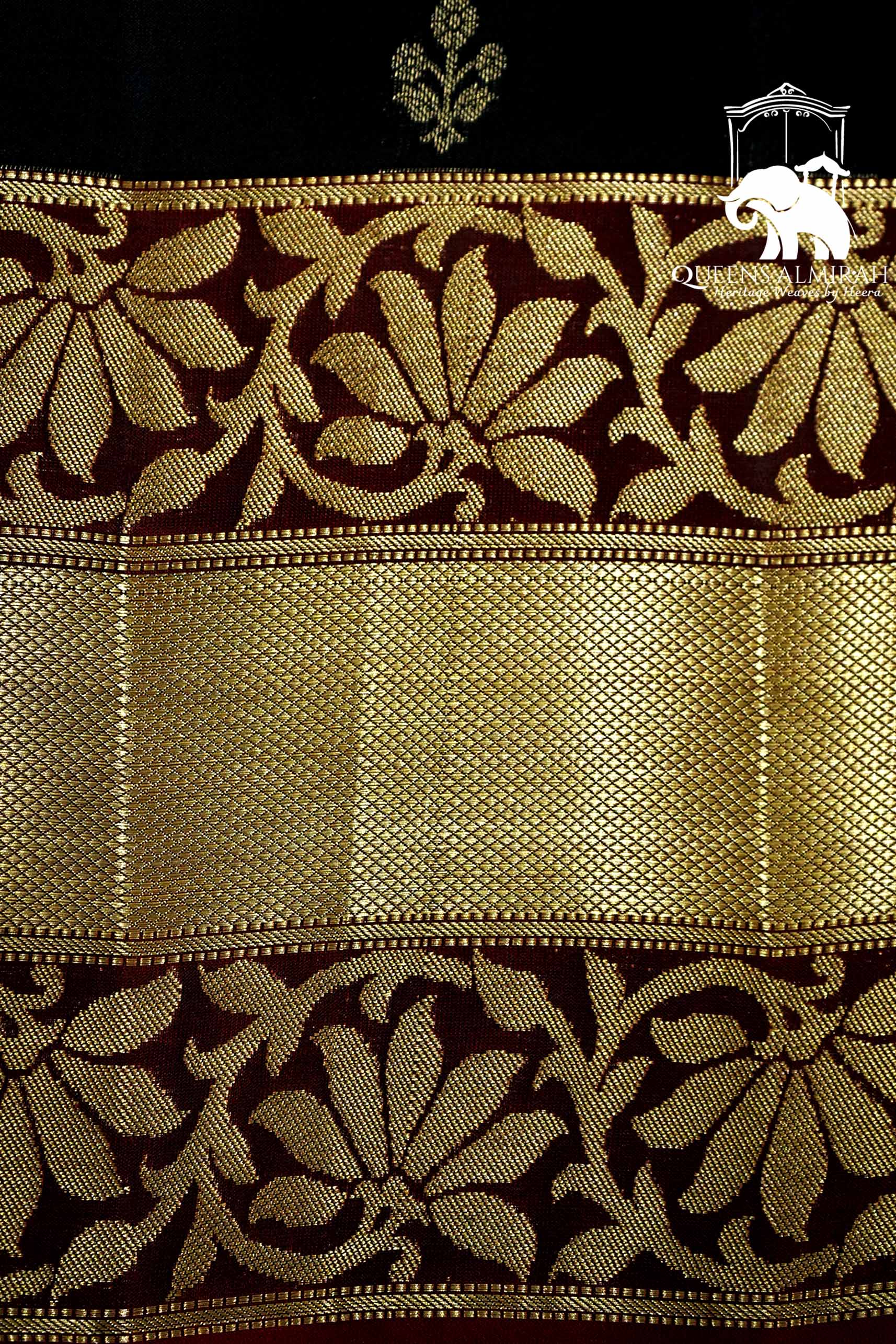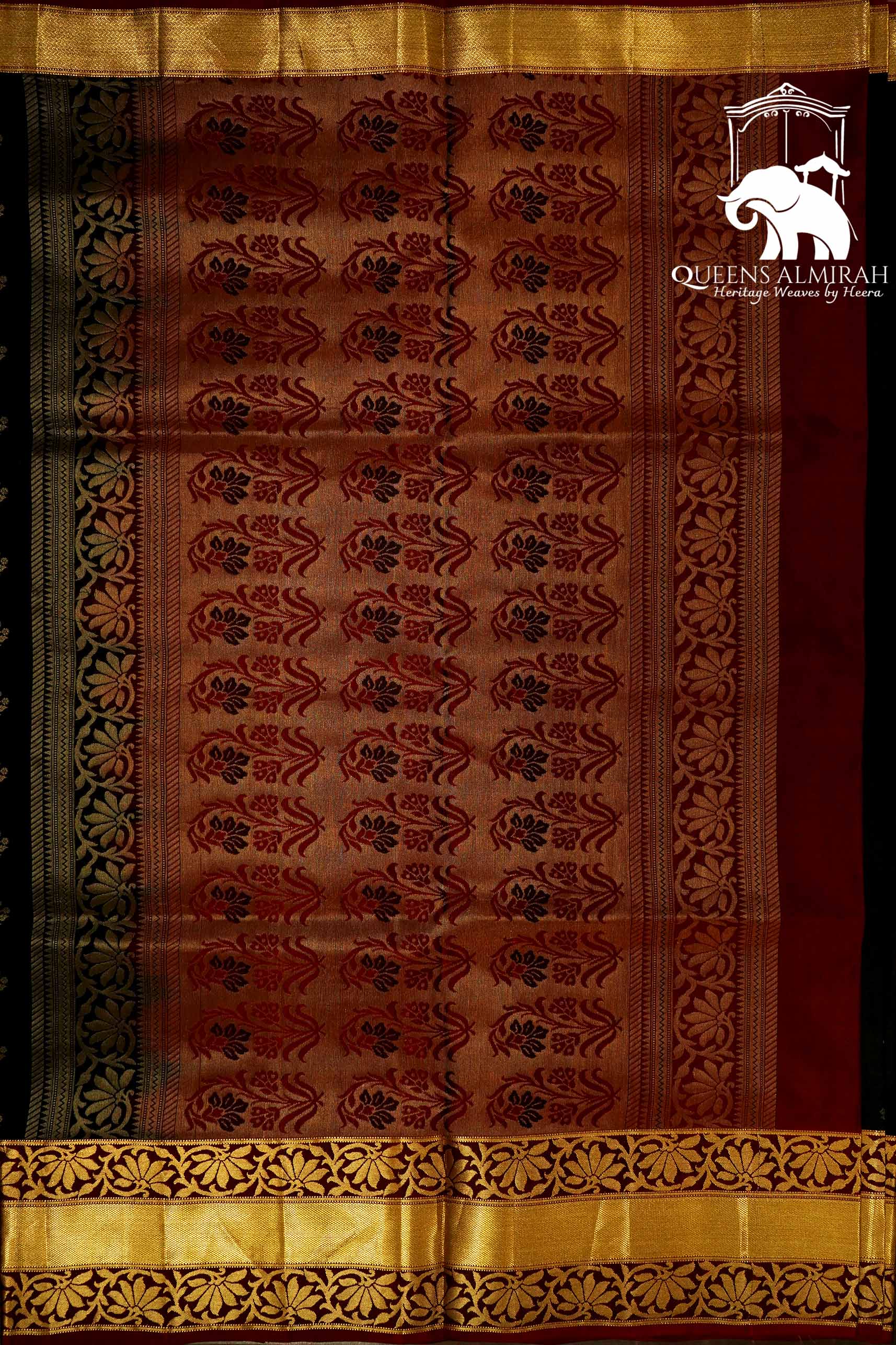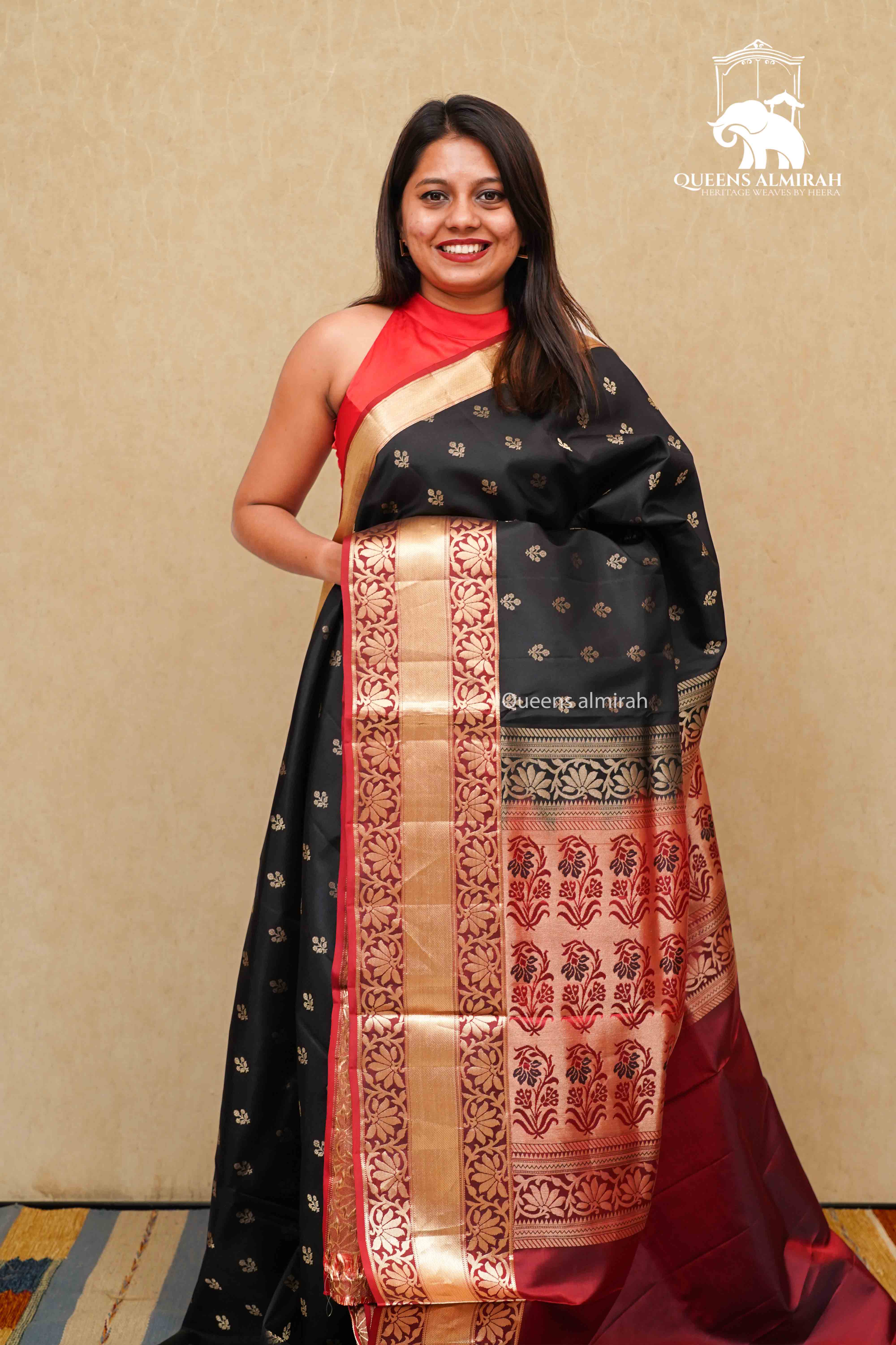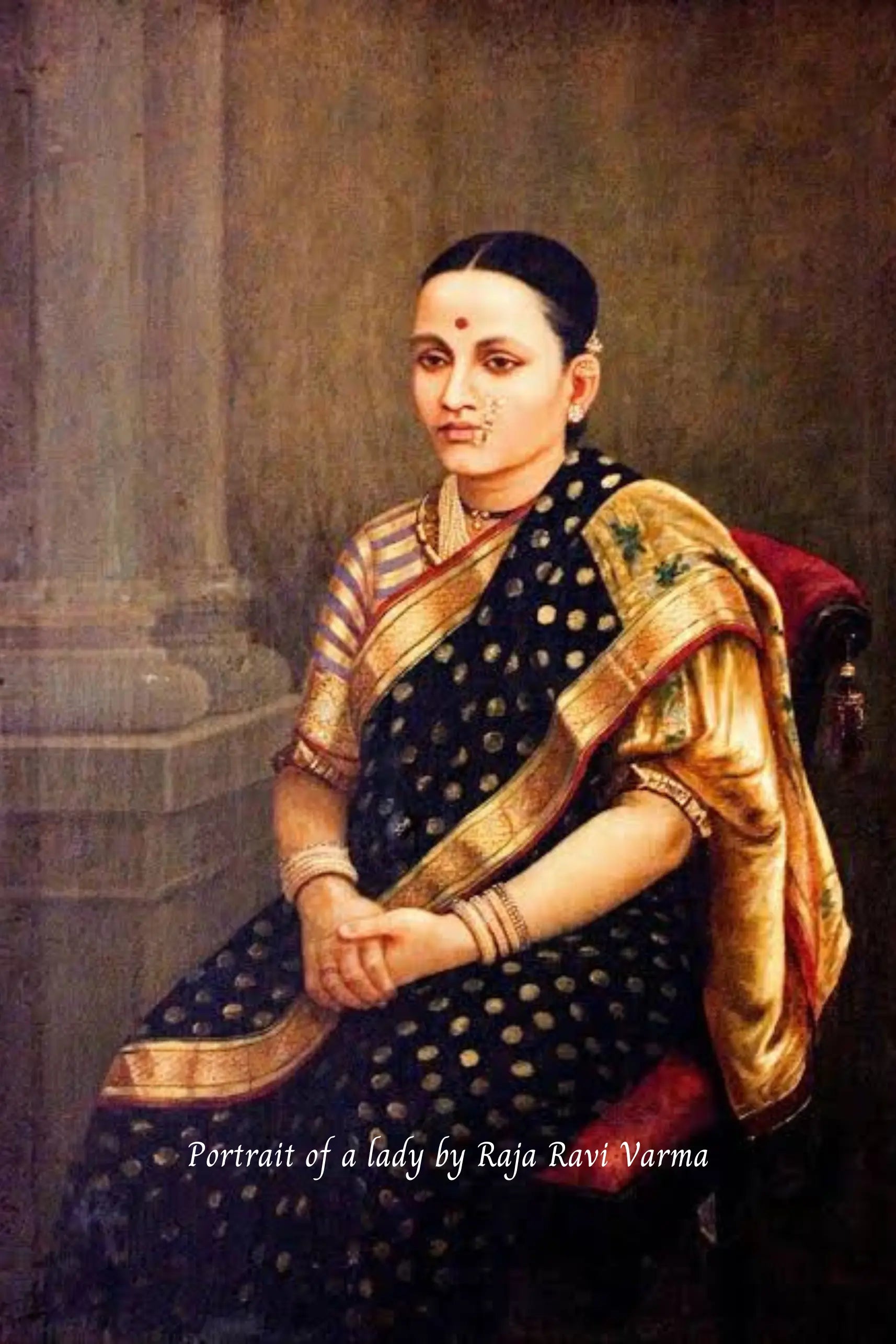 Inspired by Raja Ravi Varma's iconic "Portrait of a Lady", this timeless saree is crafted from premium soft silk. Featuring an elegant black background with a rich maroon border, it blends artistic heritage with modern sophistication, making it the perfect choice for special occasions.