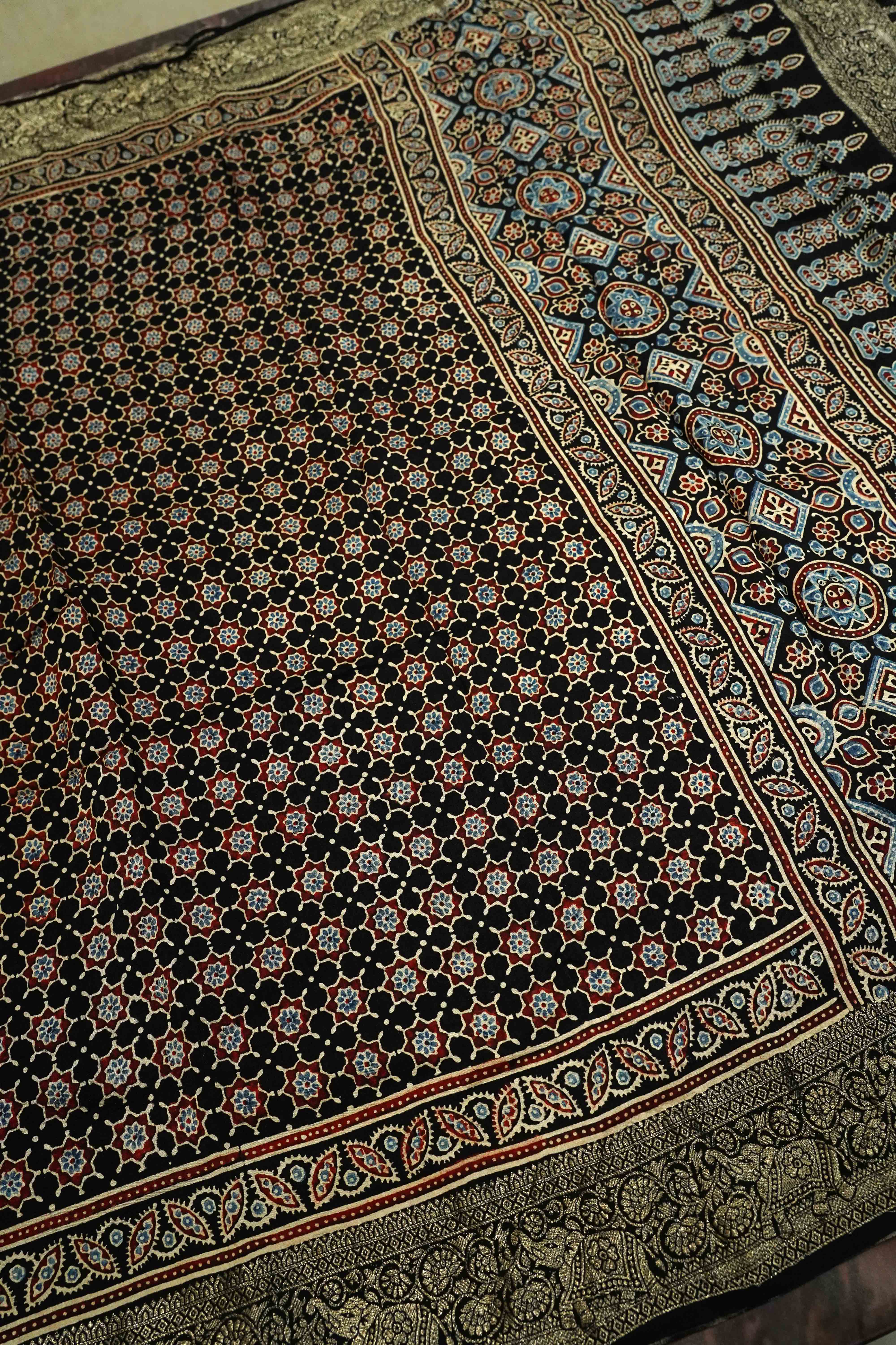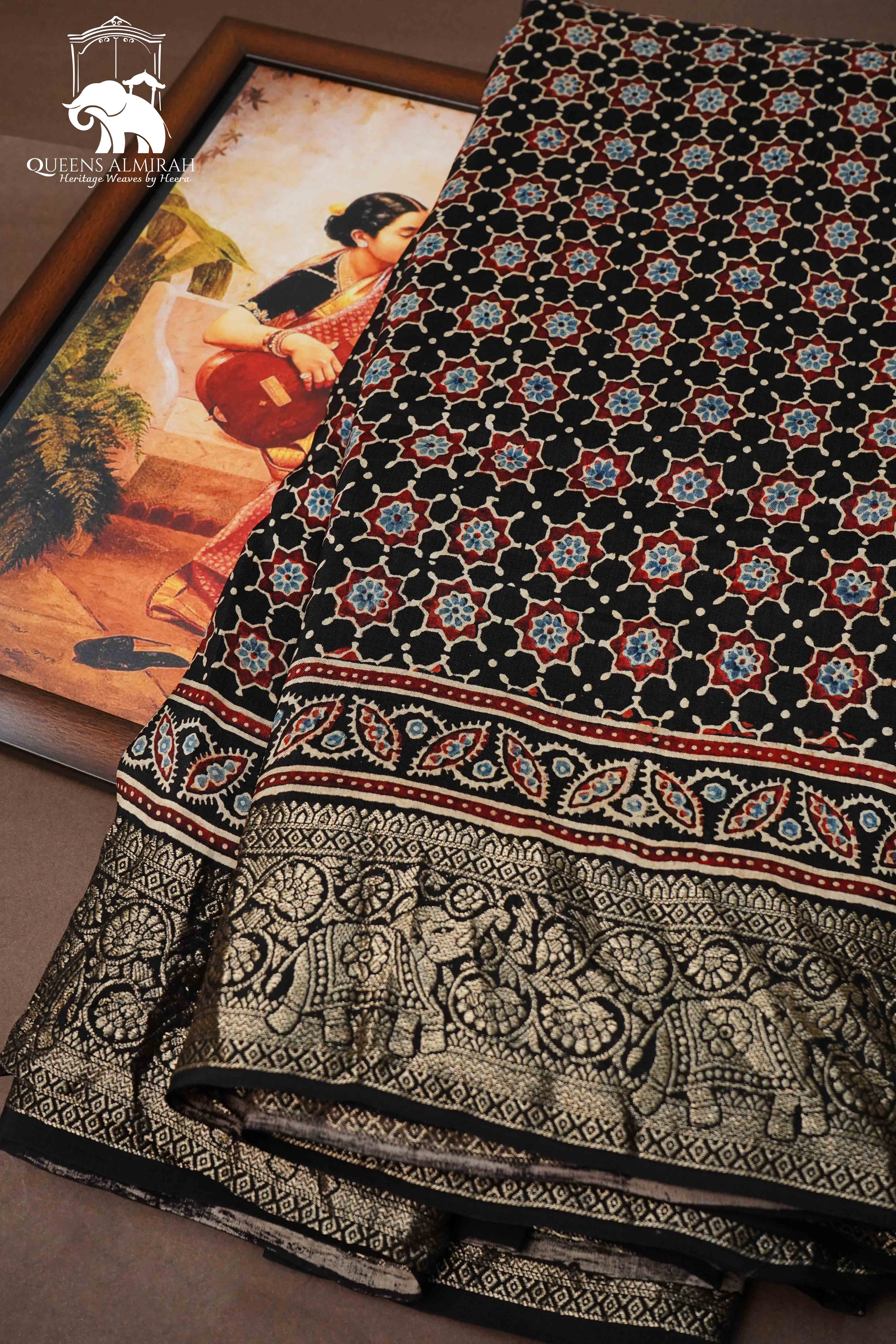 This exquisite BLACK WITH MULTICOLOR DOLA AJARAKH SILK SAREE is a stunning choice for any occasion. Made with natural dyes, it features a rich kanchi pallu and border with intricate brocade detailing. The authentic black print adds a touch of sophistication, making it a true statement piece for your wardrobe. Elevate your style with this elegant saree.