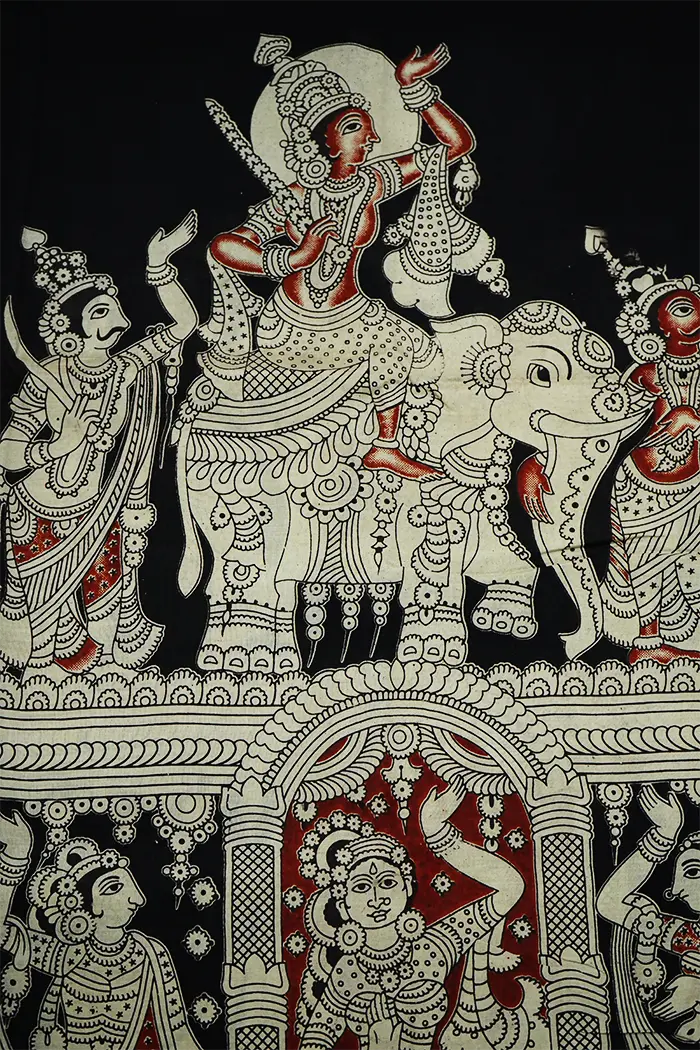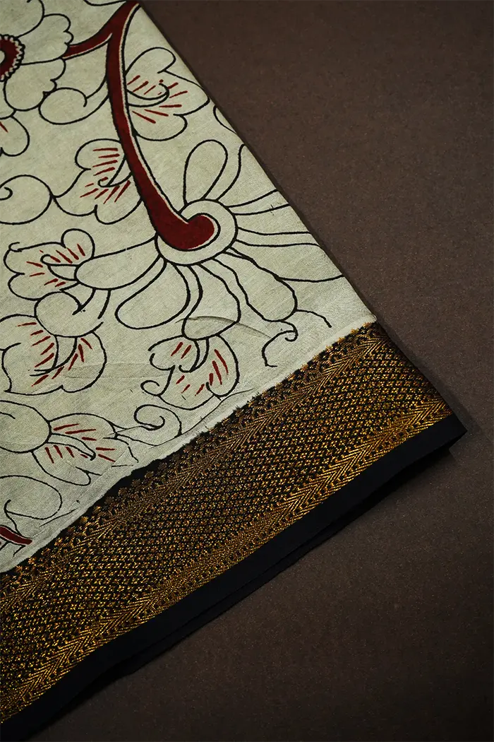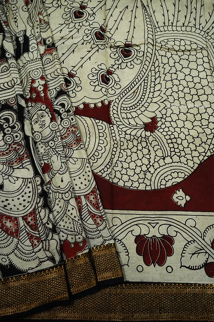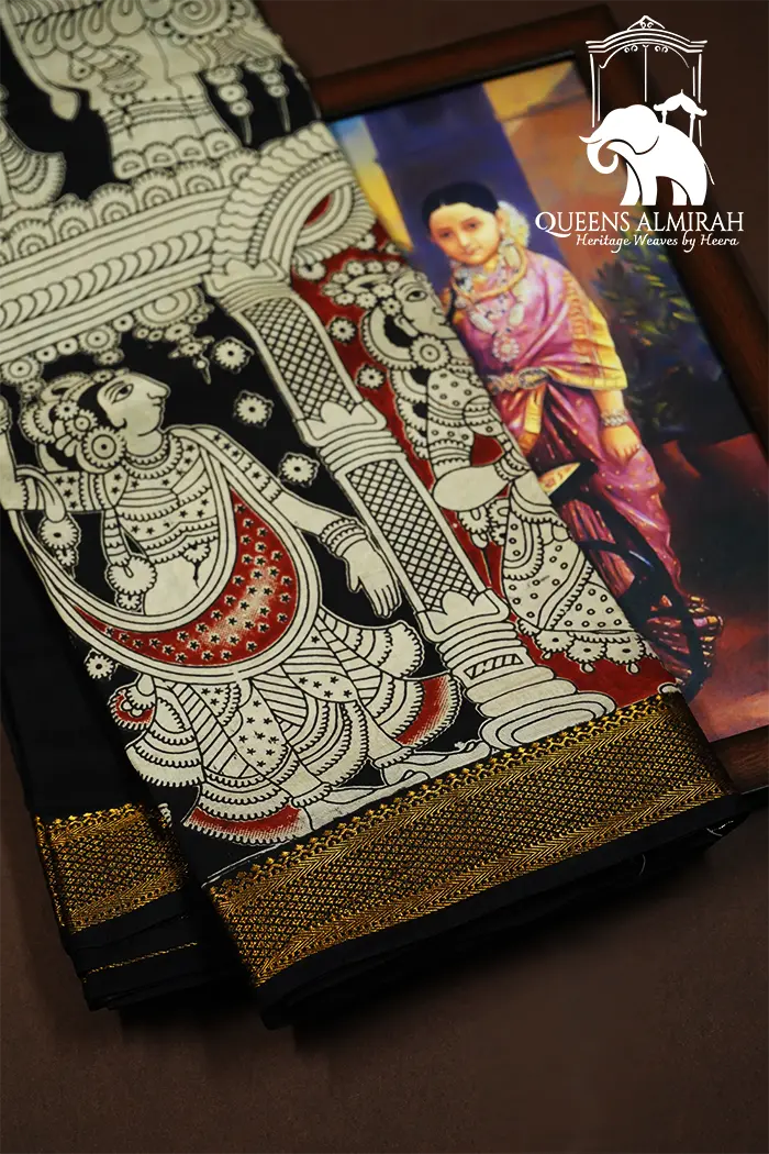 Discover elegance in our BLACK WITH RED GOLDEN COLOR BORDER MANGALGIRI SAREE. The intricate PEN WORK and stunning ELEPHANT DESIGN add a touch of sophistication. Featuring the cultural BHARATHA NATIYAM dance and a graceful lady, this saree is a symbol of tradition and finesse. Enjoy it with the attached blouse.