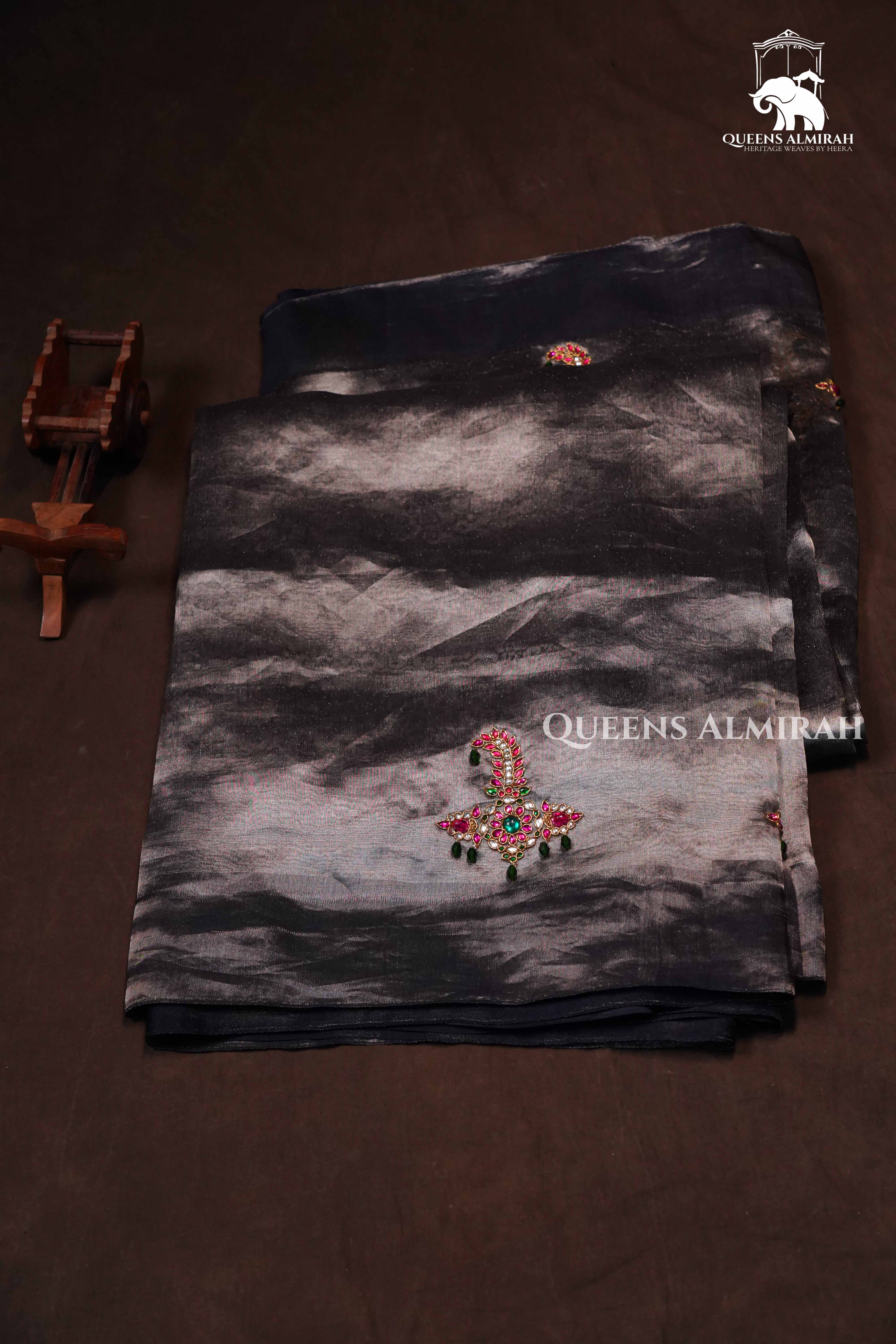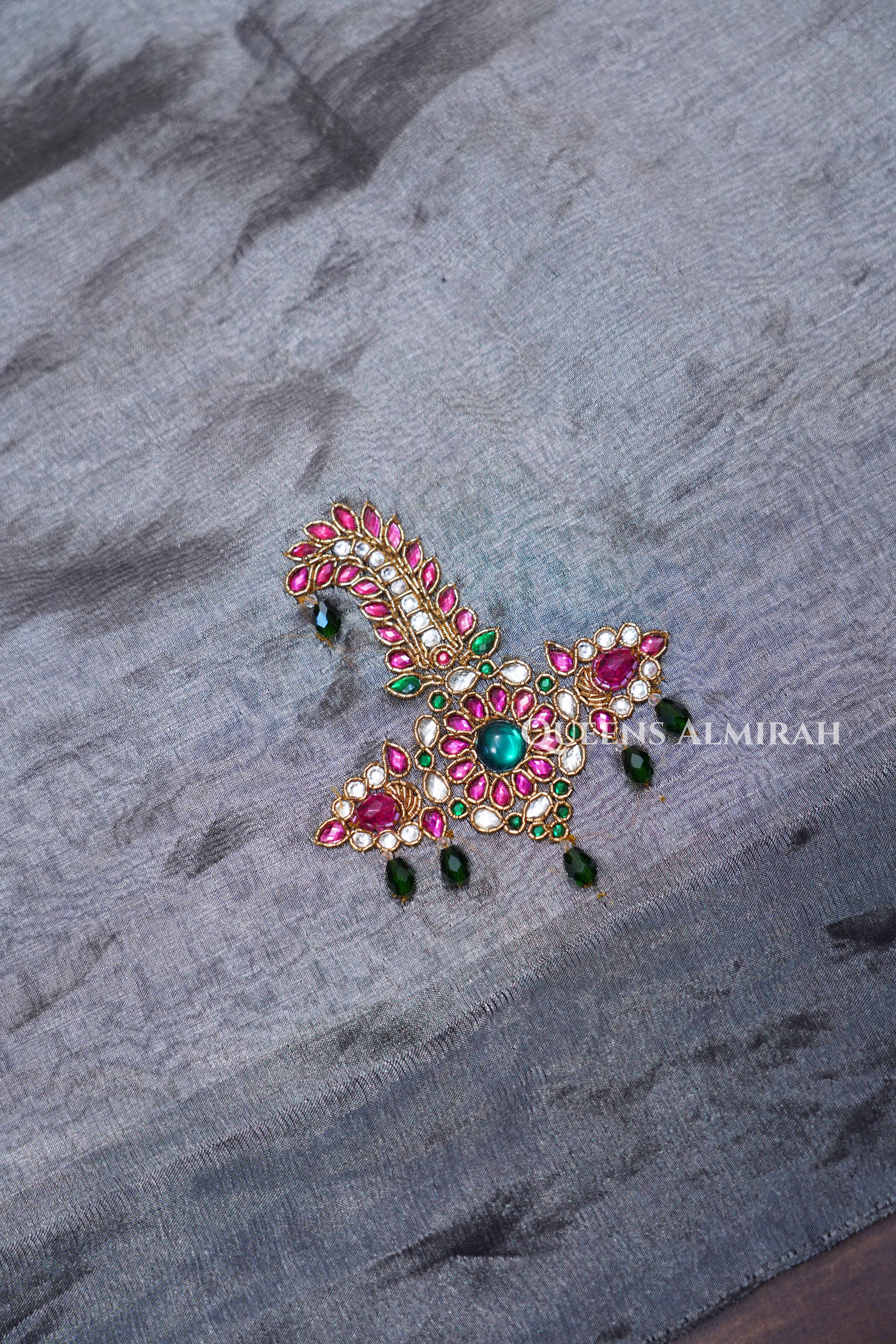 This exquisite Banarasi Tissue Saree showcases hand embroidery with kemp stone, ruby, and emerald work in intricate Sarpech motifs. The shimmering silver-grey base beautifully complements the rich jewel tones, creating a perfect blend of tradition and luxury. Ideal for festive occasions, receptions, or grand celebrations, this saree exudes timeless elegance and artisanal charm.