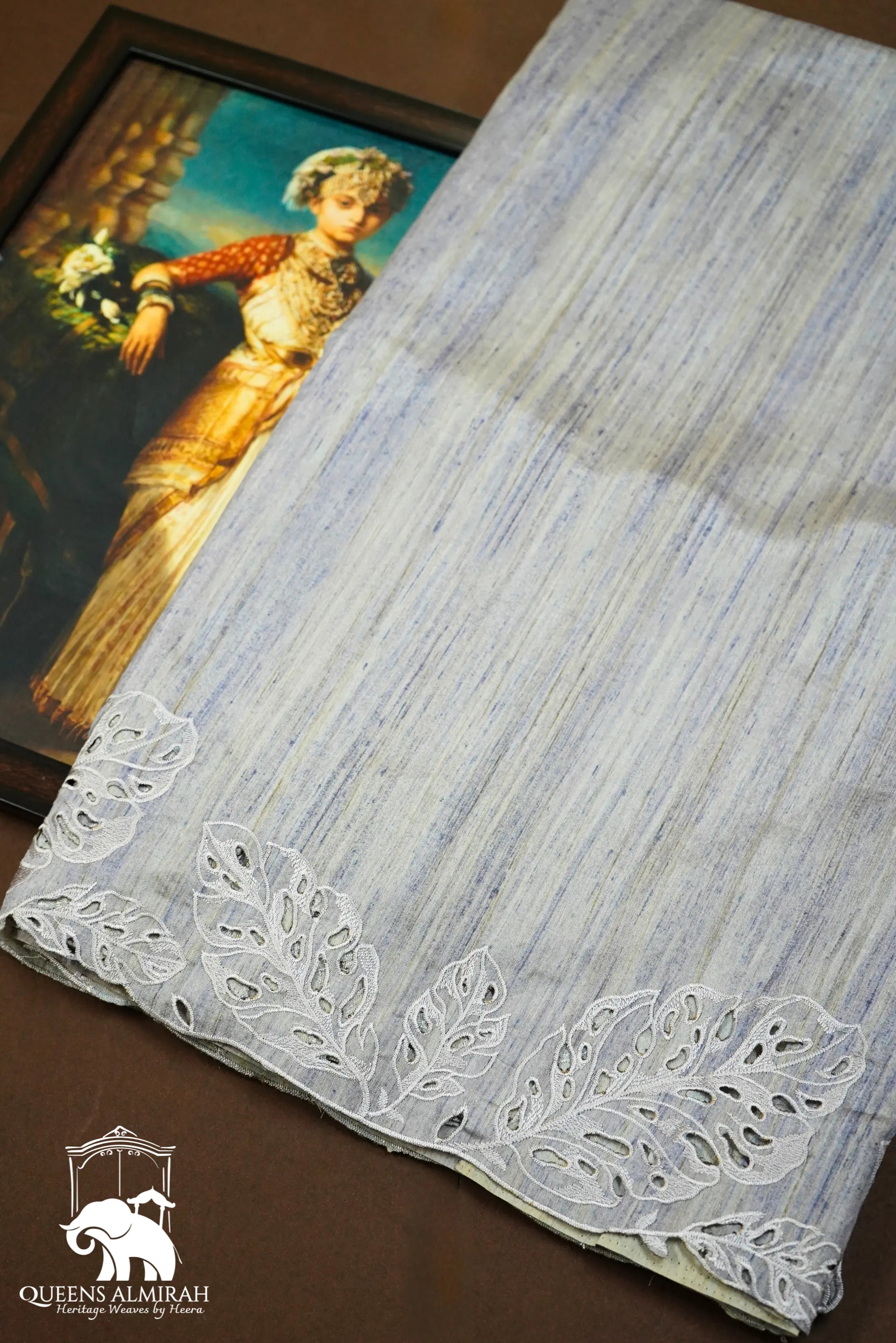 This BLACKCURRENT GREY SEMI-TUSSER SAREE features a beautiful cut work border with delicate leaf motifs, adding a touch of elegance to your wardrobe. Made from high-quality semi-tusser fabric, this saree is lightweight, comfortable to wear, and perfect for any occasion. Add a touch of sophistication and style with this stunning saree.
