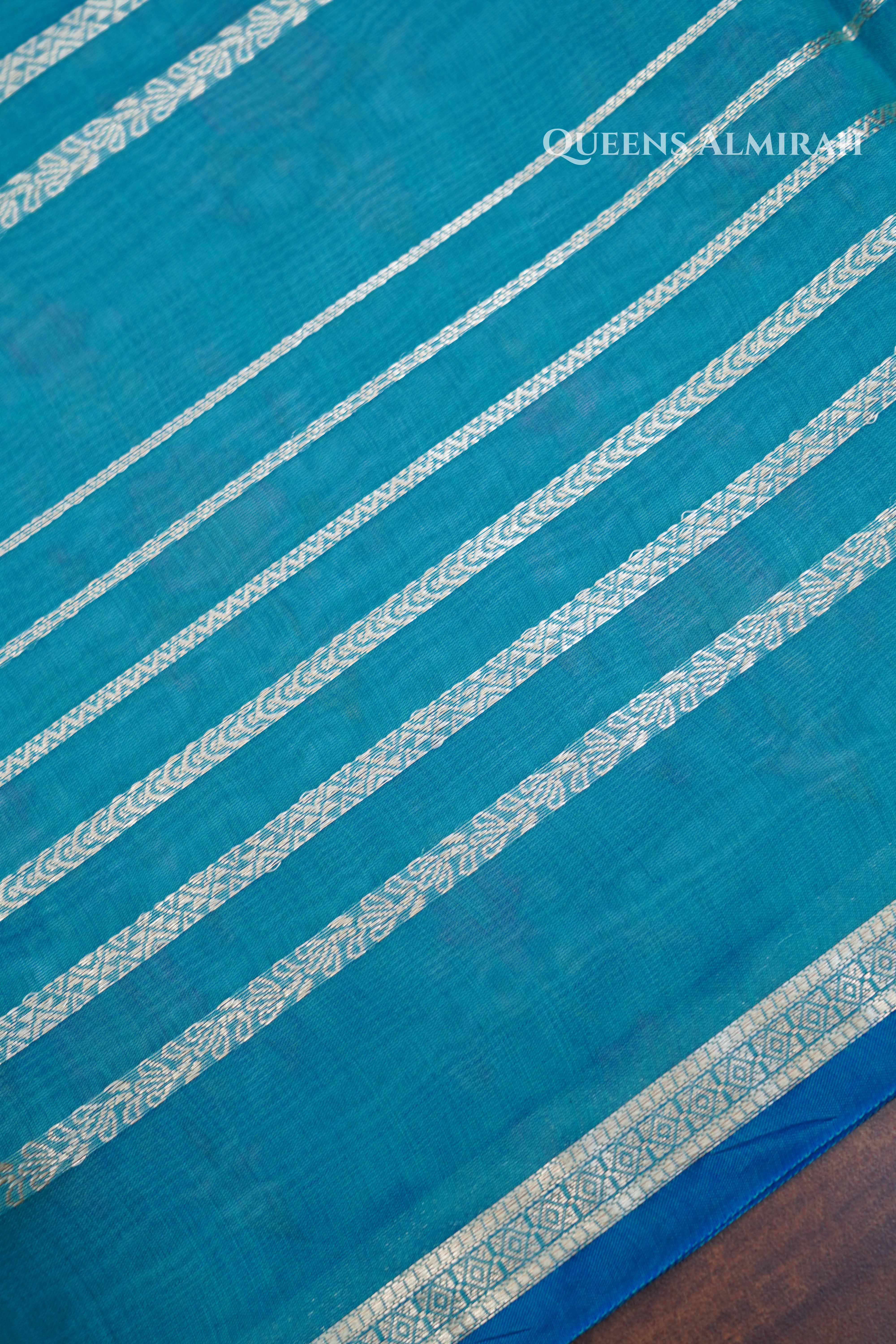 "An elegant Blue Chanderi silk cotton saree, featuring delicate golden zari stripes across the body and a beautifully woven floral pattern on the blouse. Lightweight yet classy, this saree strikes the perfect balance between comfort and sophistication, making it ideal for festive gatherings, traditional occasions, and evening celebrations.