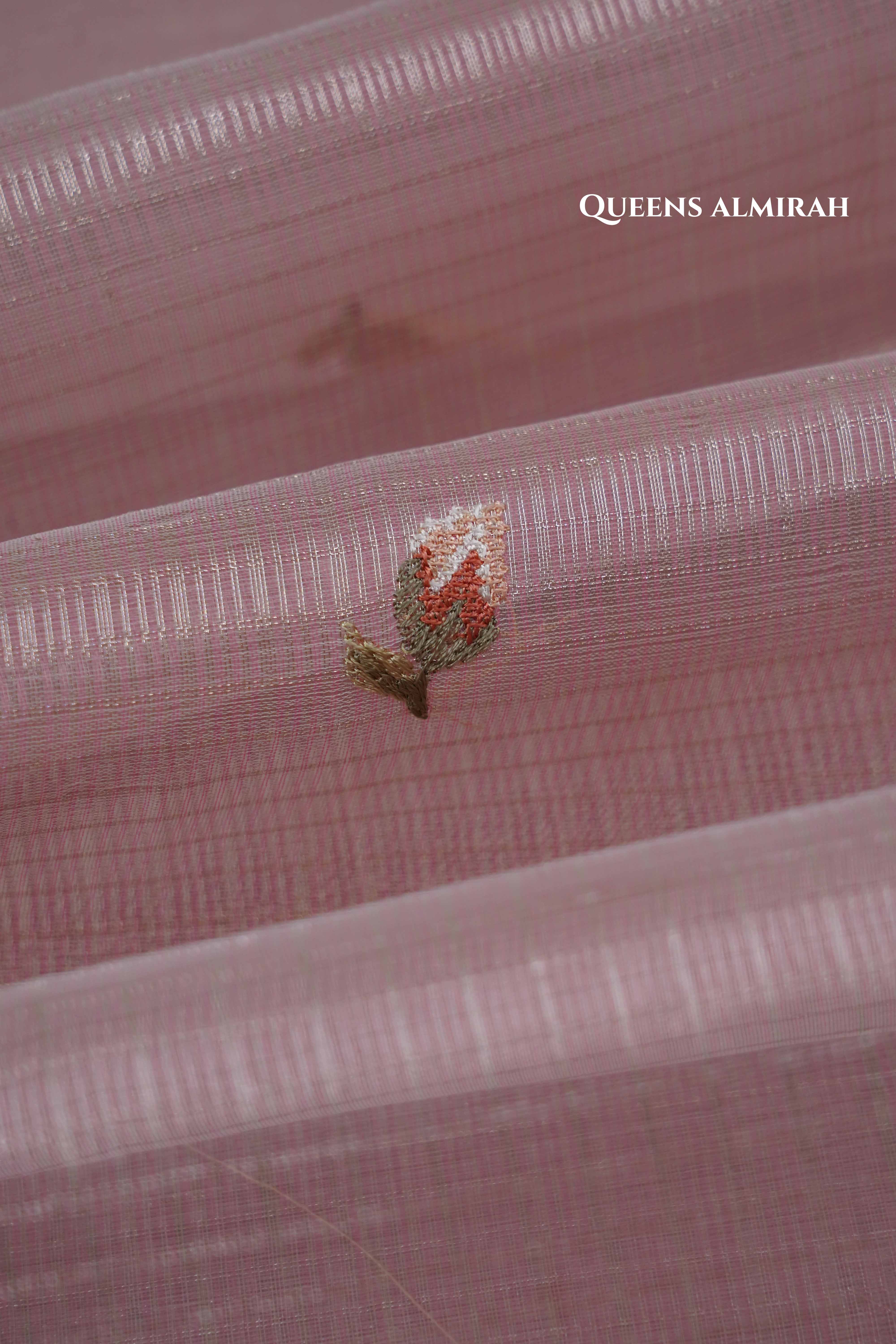 A dreamy blush pink semi organza silk saree adorned with intricate floral threadwork in pastel tones. Enhanced with a delicate zari border, this lightweight drape brings together grace and comfort — perfect for festive gatherings, elegant celebrations, or timeless day events.