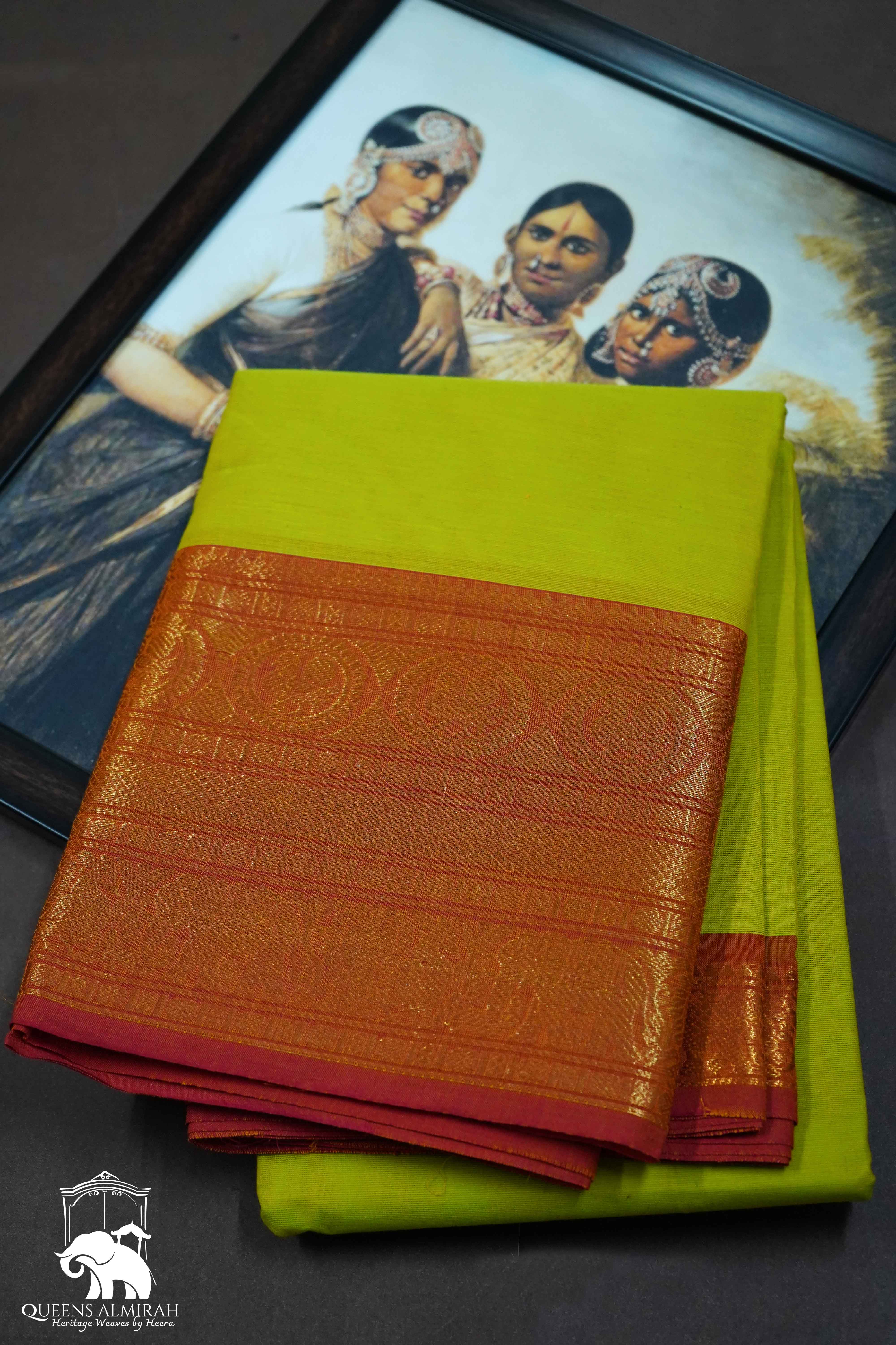 This BRIGHT OLIIVE saree features a contrasting BURNT RED design and a stunning golden color border. Made from high-quality KANCHI COTTON, this saree will add a touch of elegance to any occasion. Perfect for those who love a bold and sophisticated look.