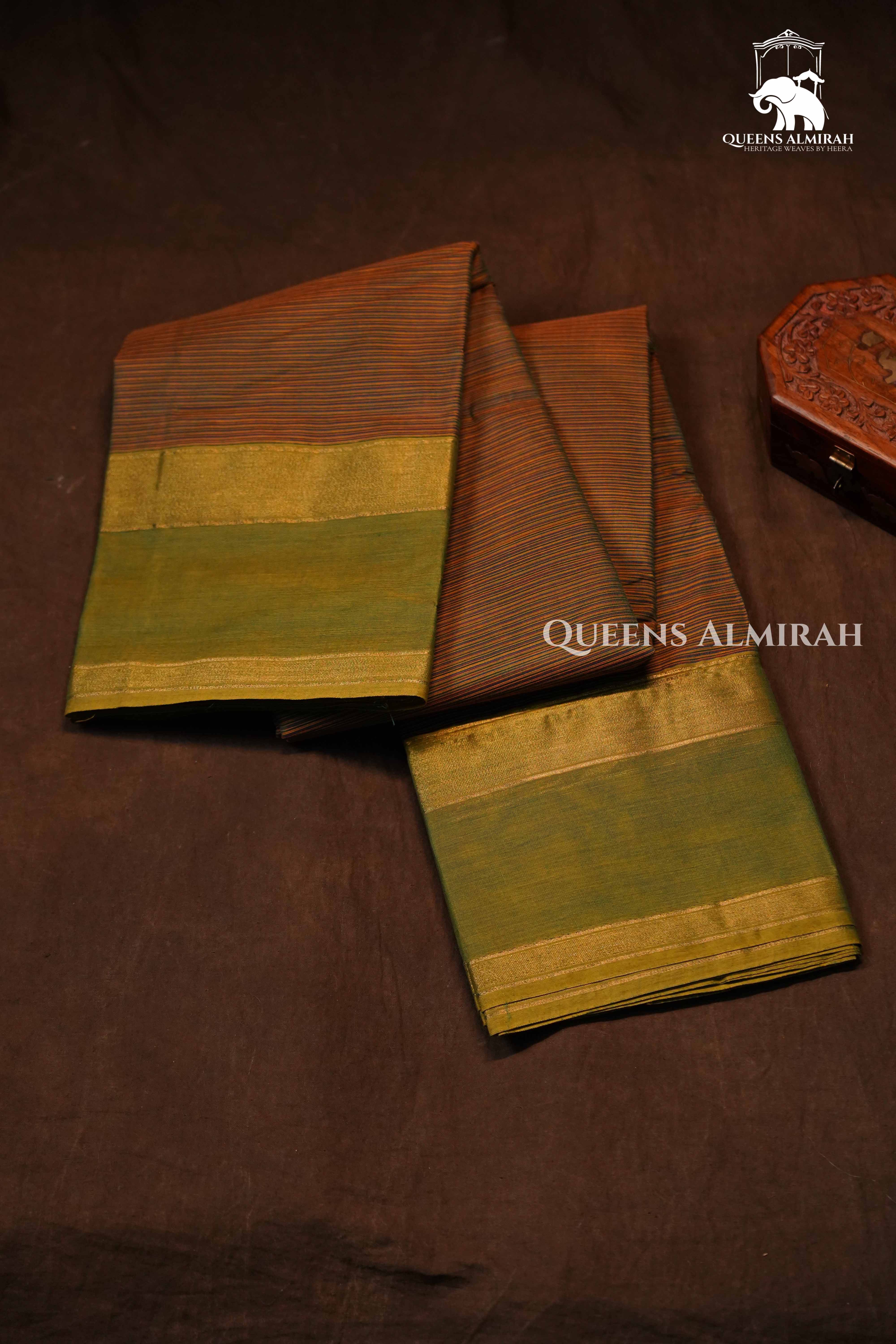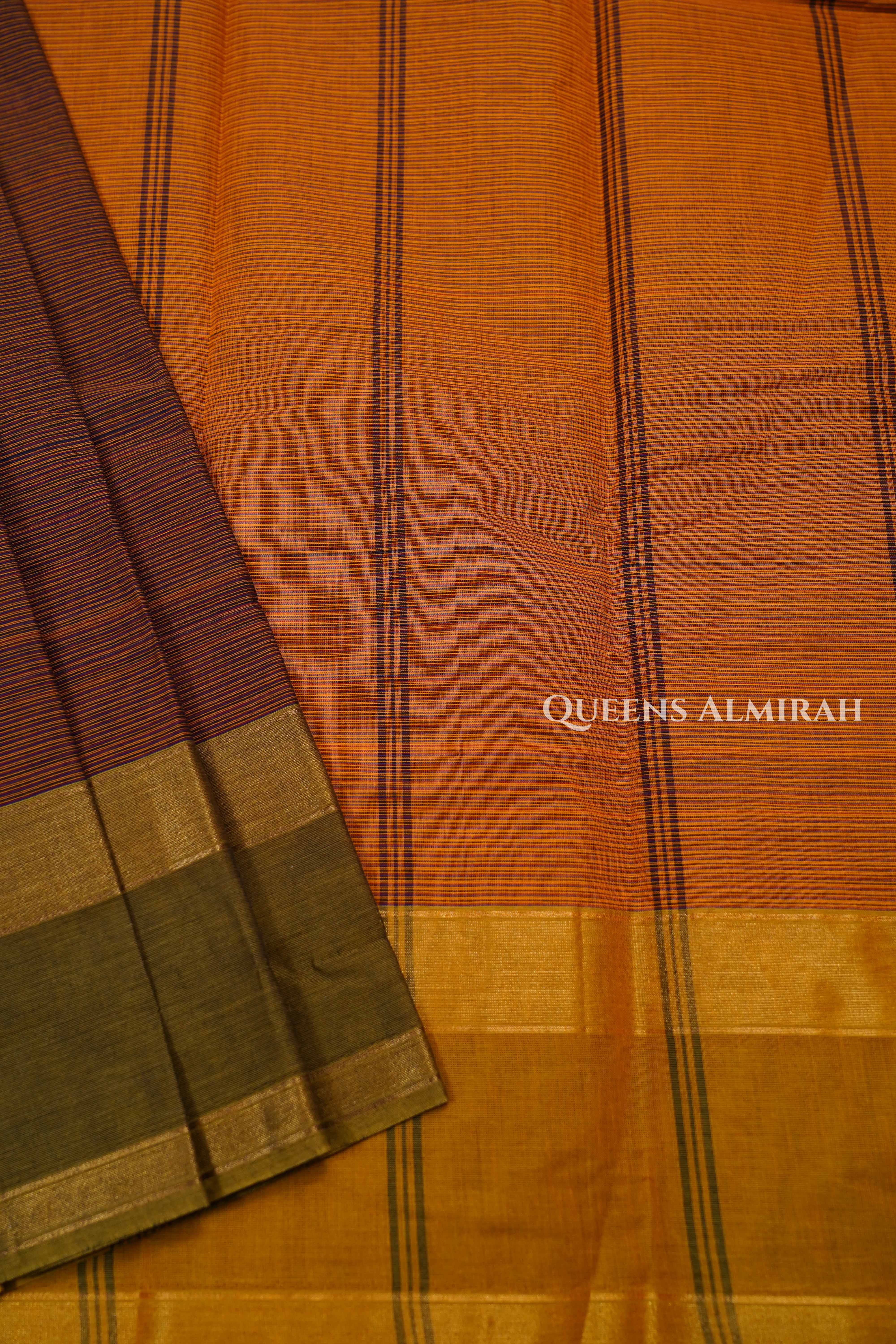 This elegant Chettinad cotton saree comes in a rich brown base adorned with fine pinstripes, exuding timeless charm. The muted olive green borders add a subtle yet graceful contrast, enhancing its earthy appeal. Handwoven with traditional craftsmanship, this breathable and lightweight saree is perfect for everyday elegance, casual gatherings, and cultural events.