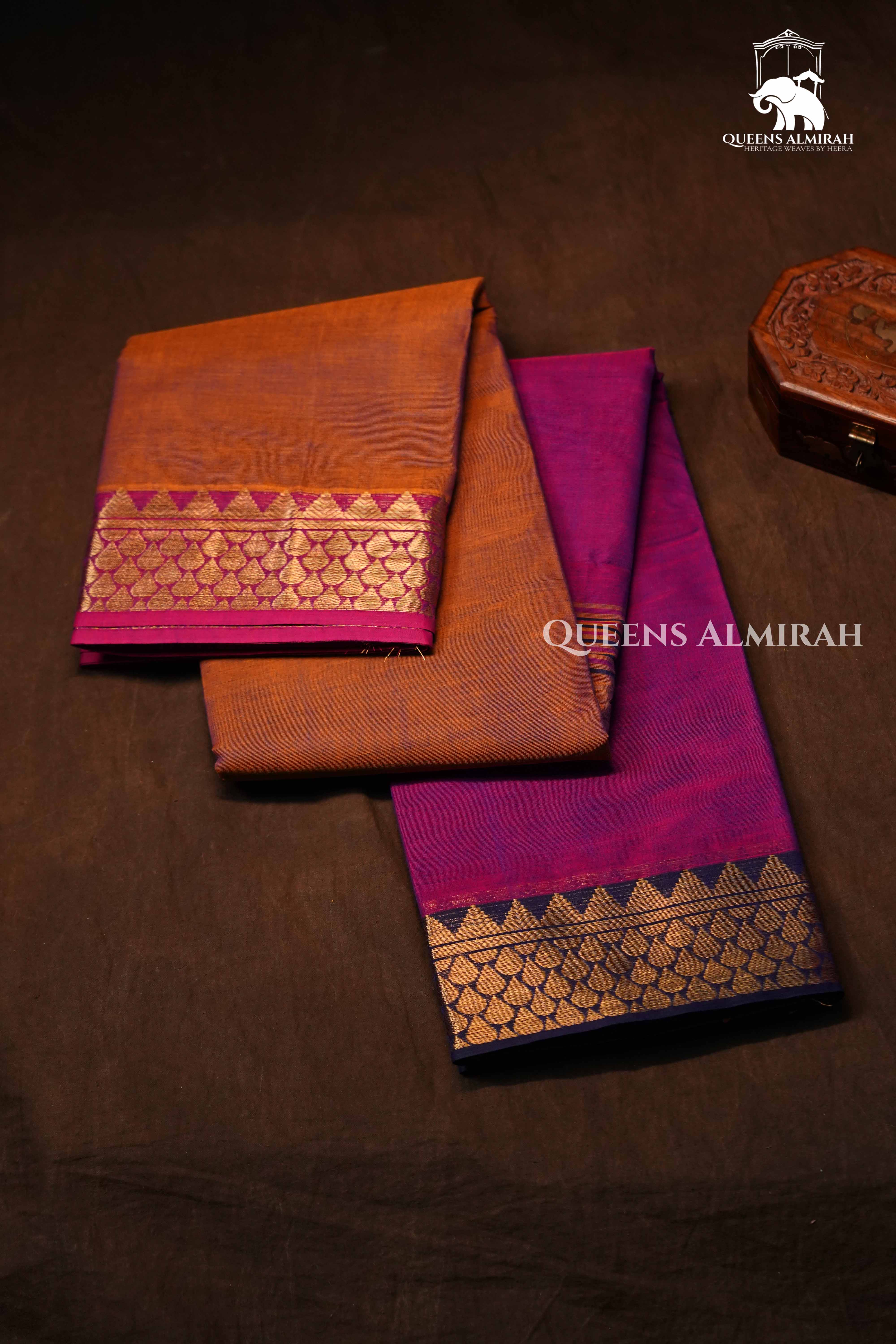This elegant Chettinad cotton saree features a rich copper brown body beautifully paired with a vibrant magenta pallu. The borders are crafted in the traditional Ganga Jamuna style, showcasing contrasting dual tones on either side. Adorned with intricate golden coin butta motifs, this saree radiates heritage charm and sophistication. Perfect for festive occasions, temple visits, and cultural celebrations, it embodies timeless Chettinad craftsmanship.