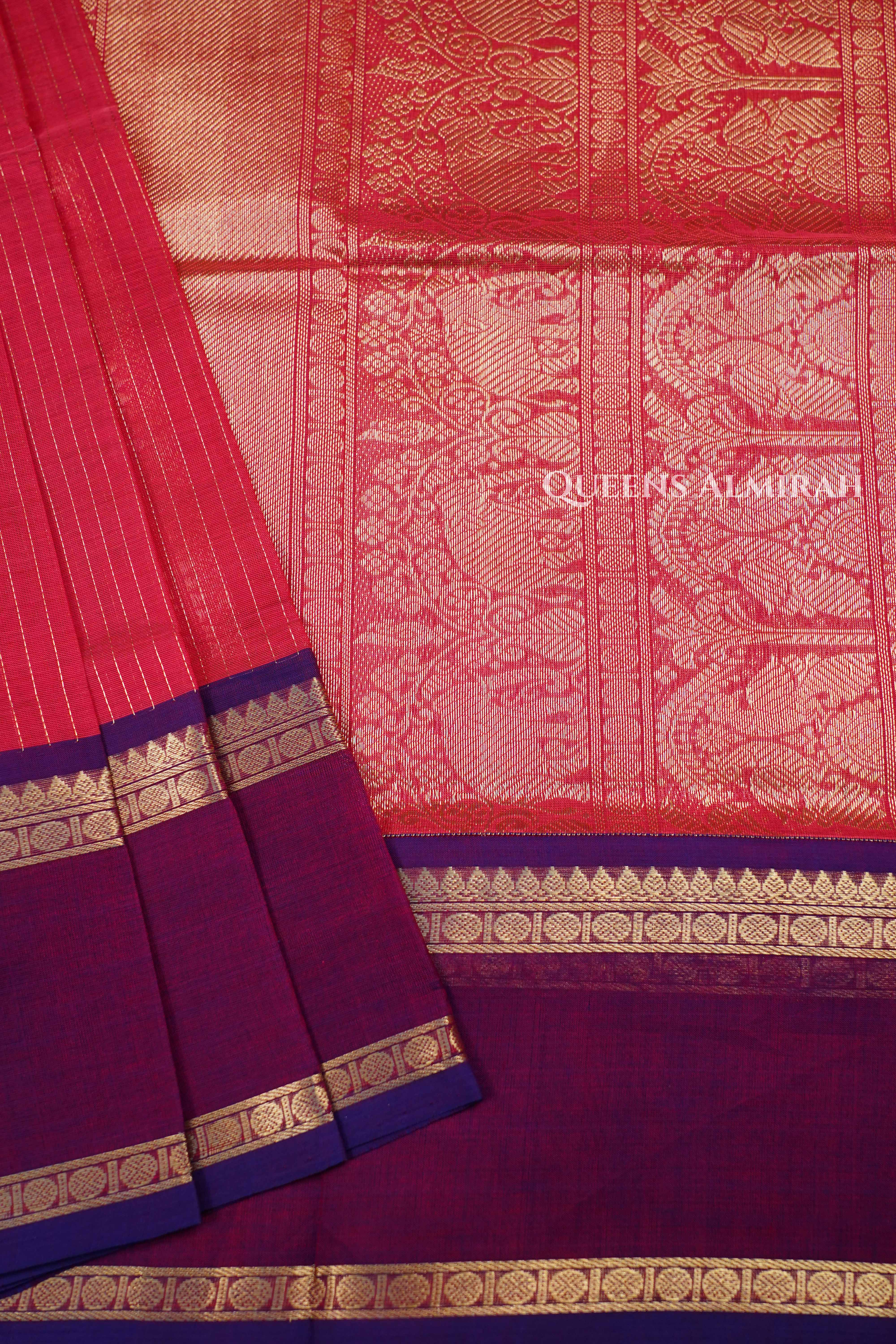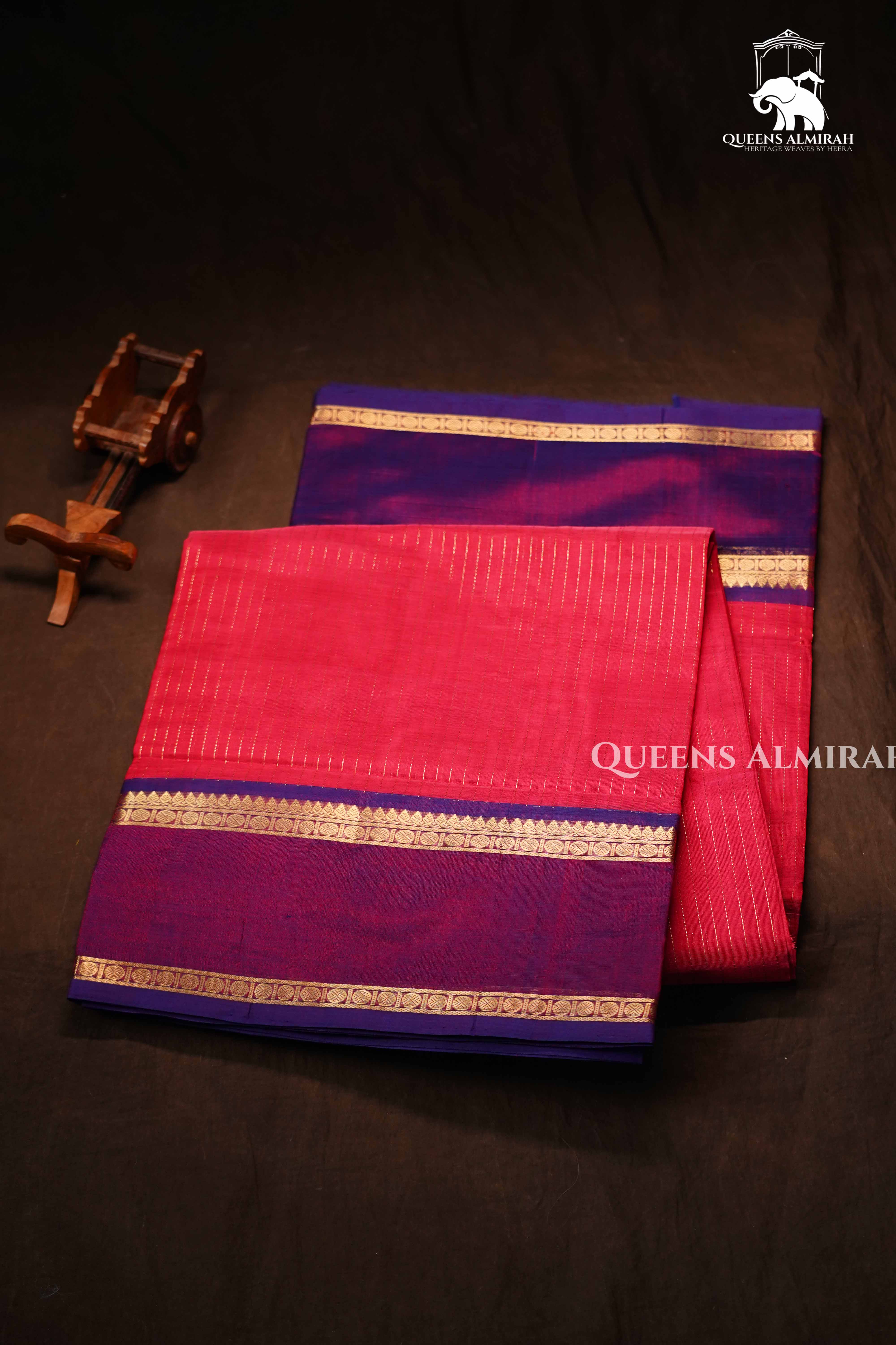 Add a royal touch to your festive look with this Pink and Purple Silk Saree featuring Elegant Golden Zari Borders. The saree flaunts a vibrant pink body adorned with subtle golden stripes, paired with a rich purple border and pallu. The ornate golden zari detailing with circular motifs enhances its traditional charm, making it ideal for weddings, festive occasions, and cultural celebrations. Crafted with precision, this saree combines luxury, heritage, and elegance.