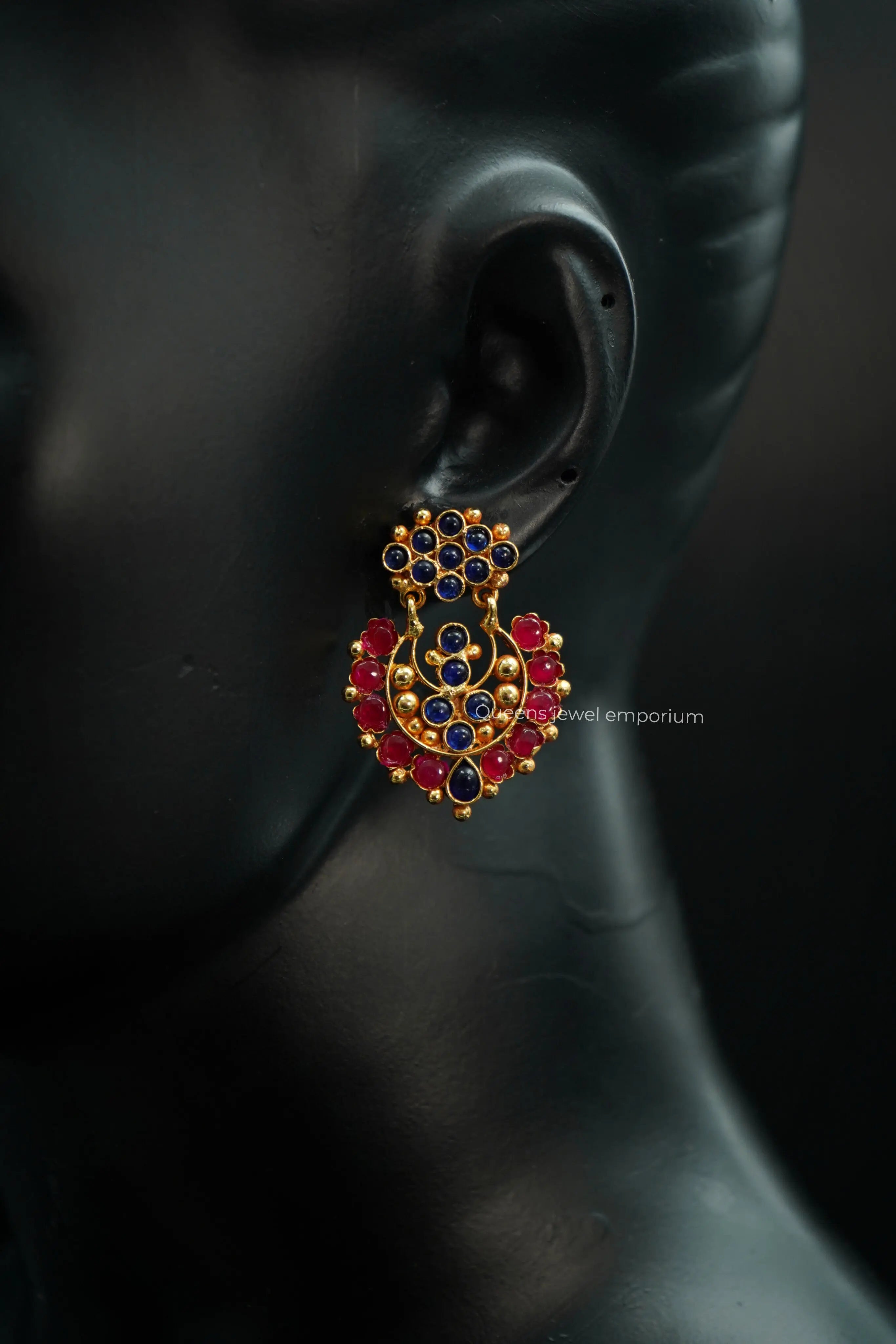 The CHANDINI CHANDBALI earrings are a classic Indian jewelry style with origins dating back to the Mughal empire. These elaborate and intricate earrings are renowned for their delicate filigree, adorned with precious gemstones and incorporating various design elements.