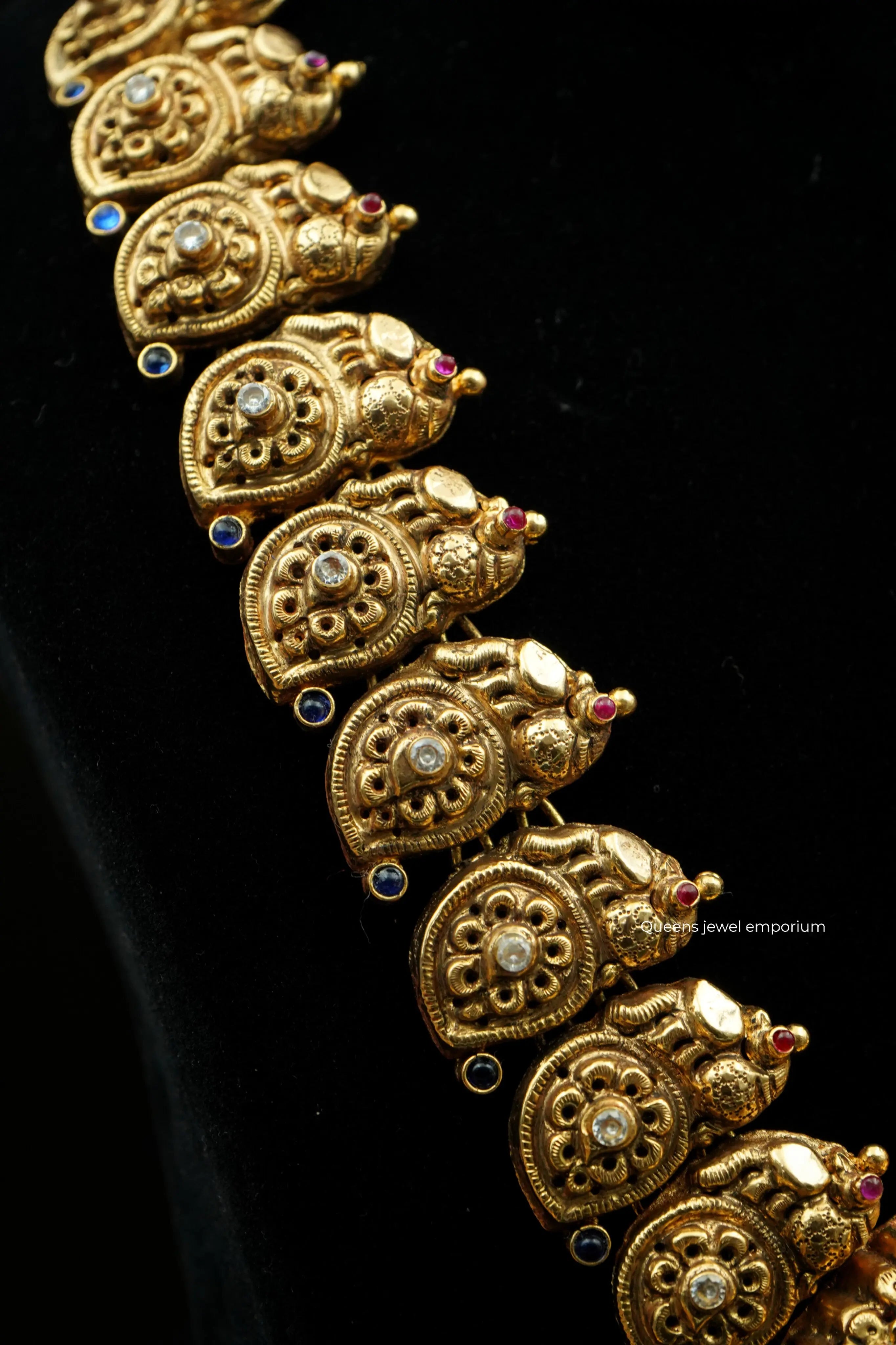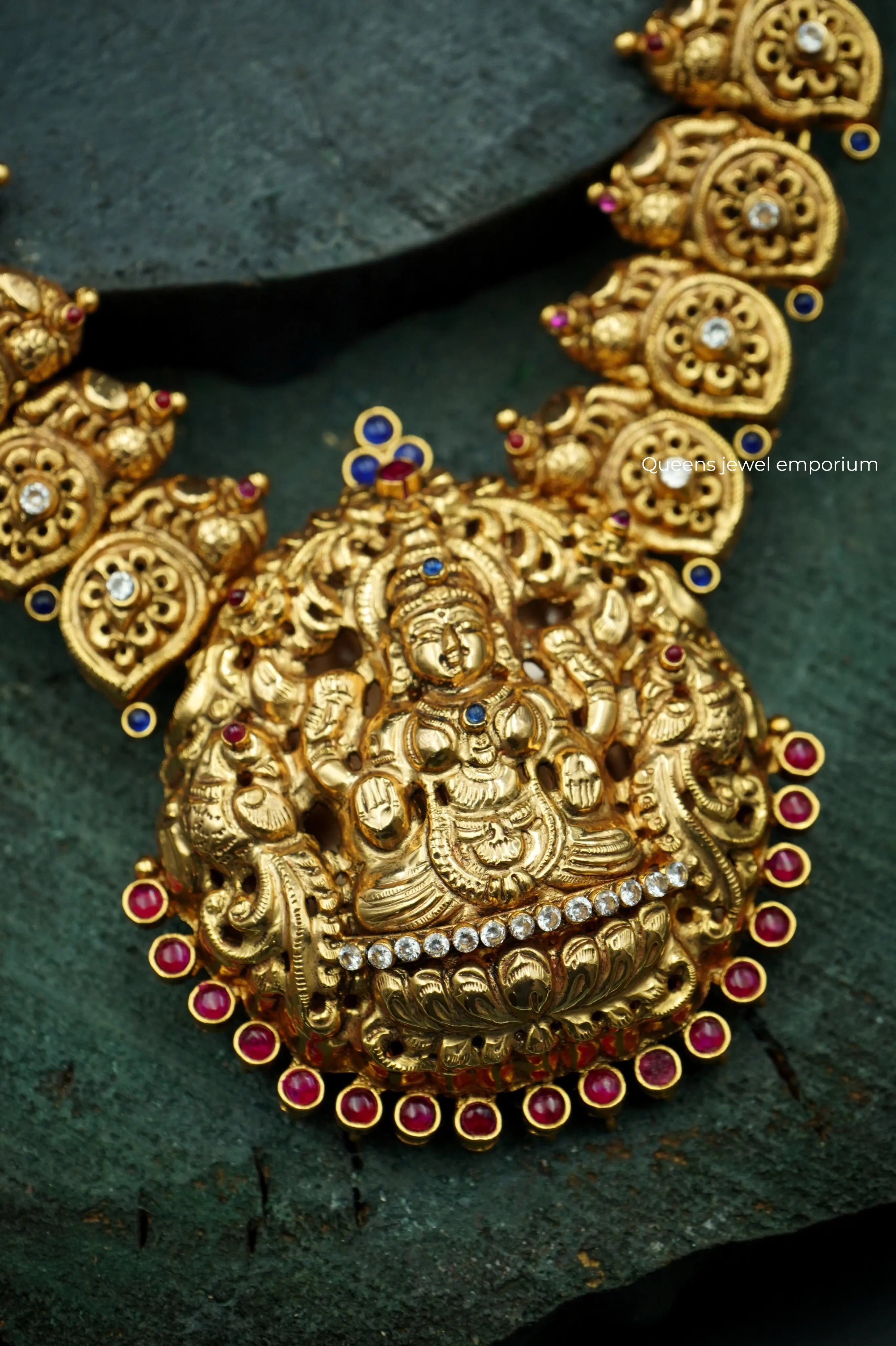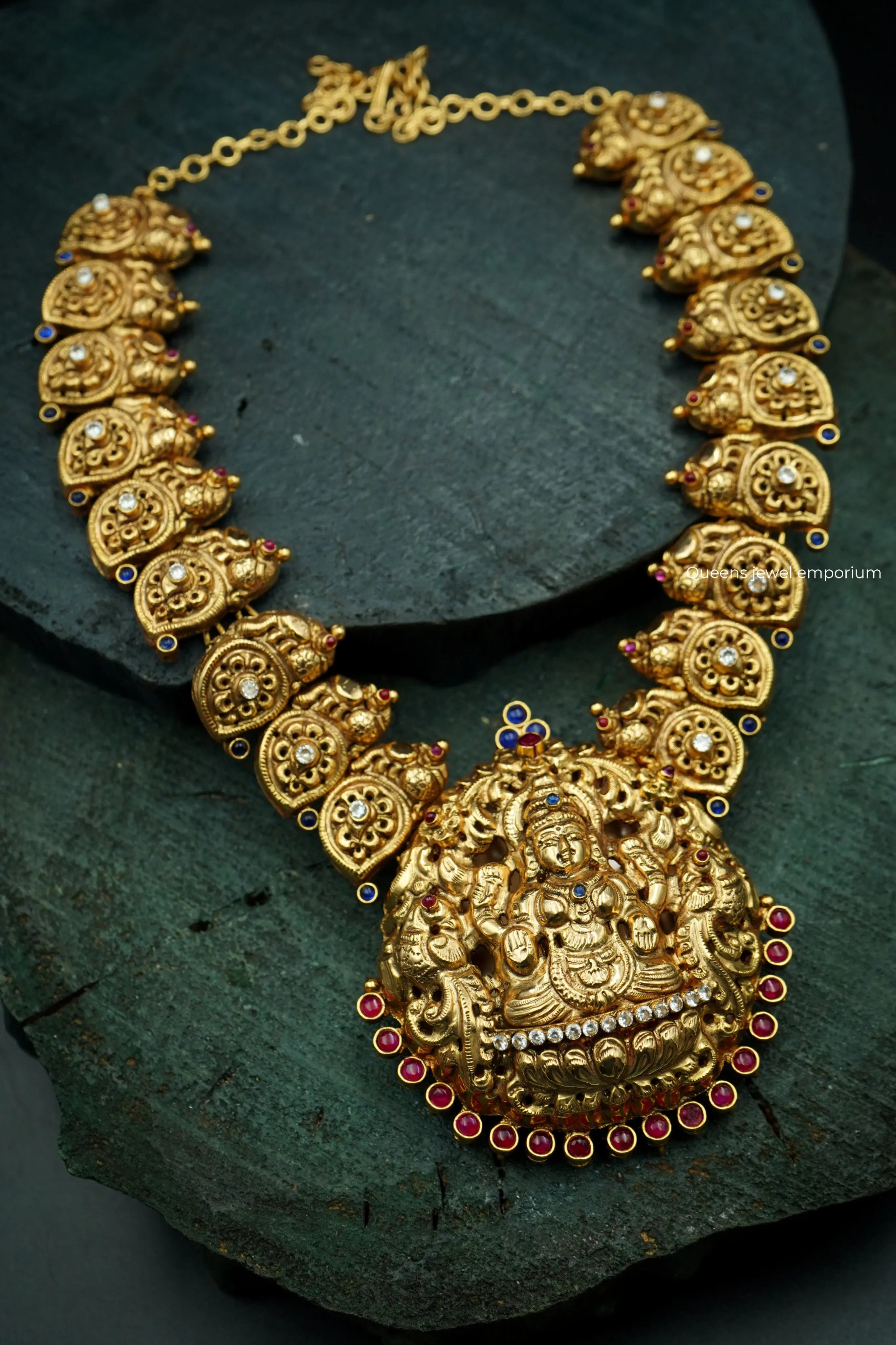 This beautifully handcrafted ChandraRupa Mid Haram necklace features a stunning Nagas Work Lakshmi Pendant adorned with blue Kemp stones. The intricate flower design, along with gold plating and silver alloy, makes it the perfect accessory for a wedding or special occasion. Elevate your look with this unique and elegant piece.