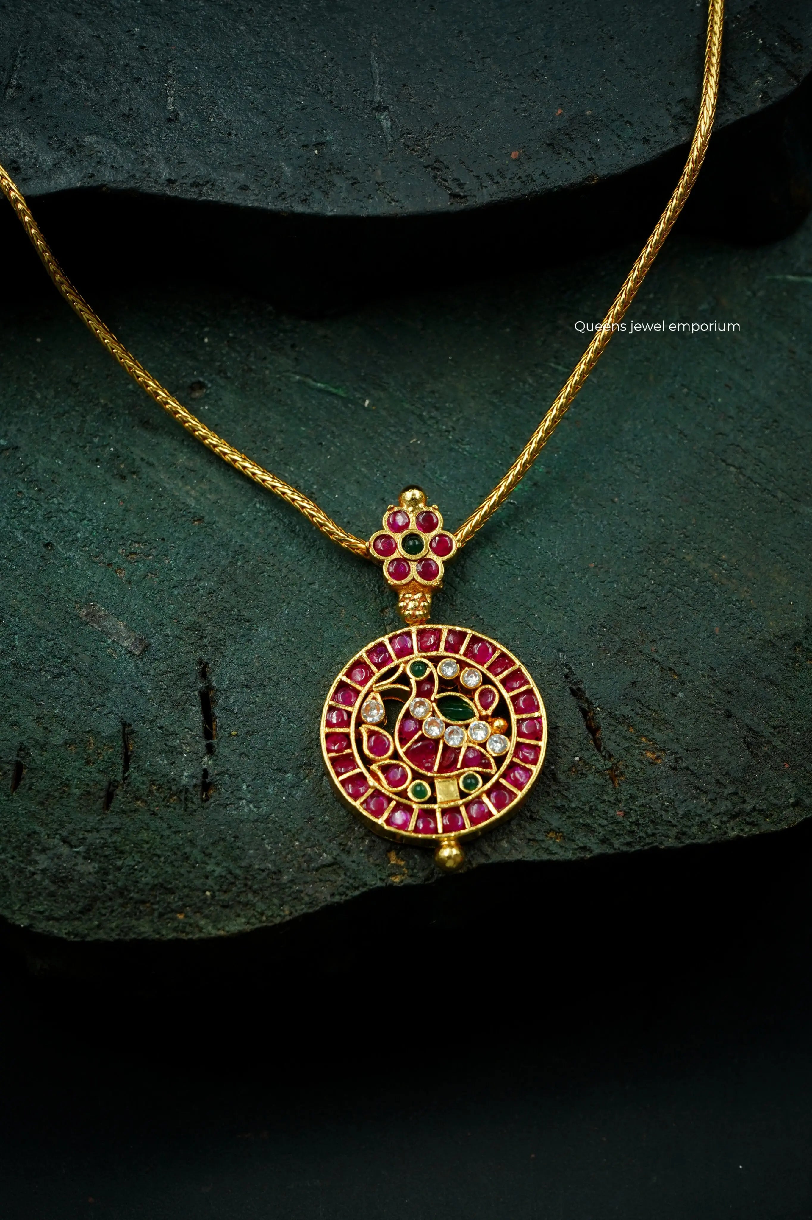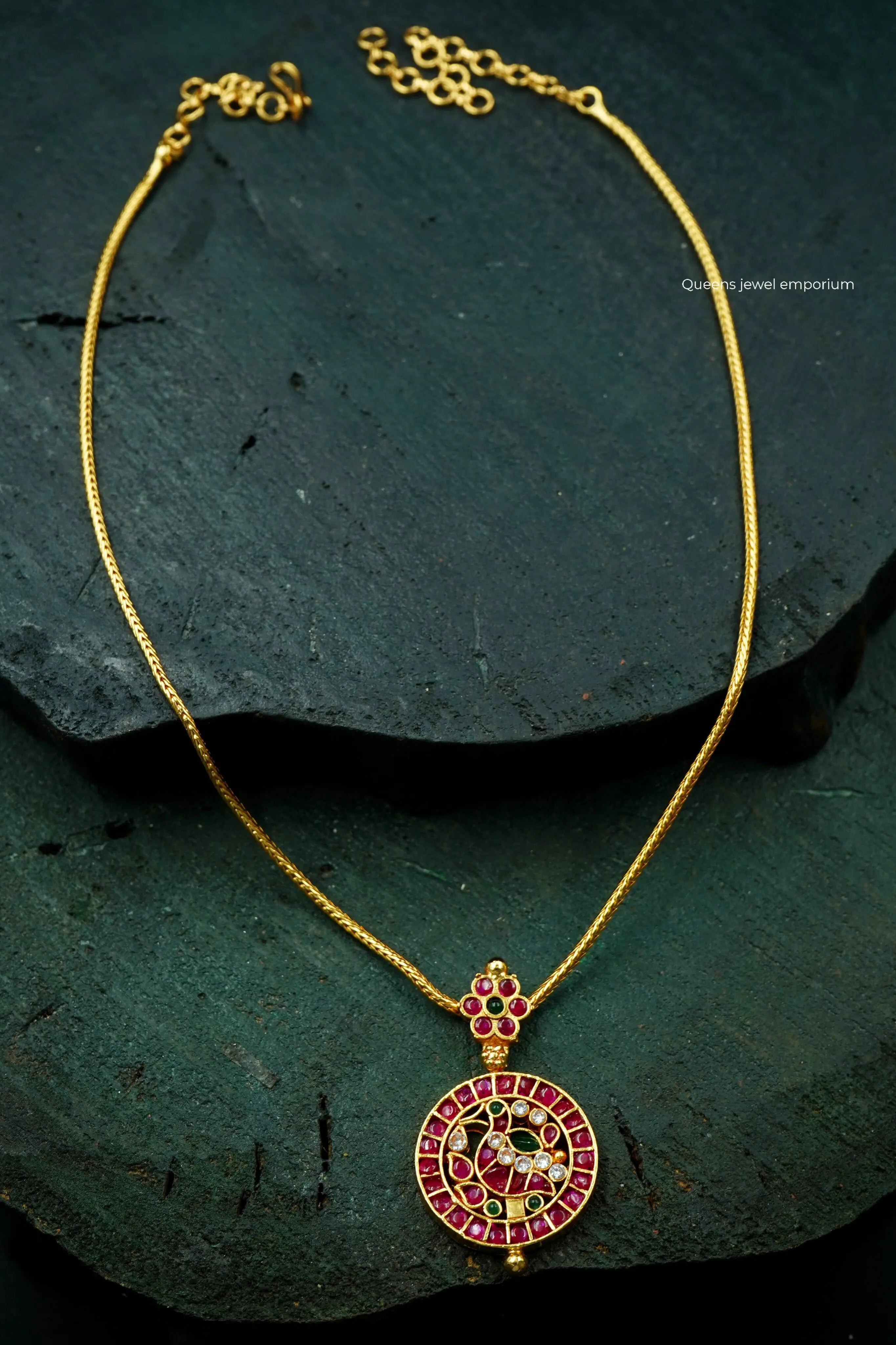 Expertly crafted in 24CT gold-plated silver alloy, the CHARITHA NECKLACE showcases a unique chakra design and an elegant annapakshi in the center. Made using the thick gold sheet forming technique, this necklace exudes quality and luxury. With its minimal yet eye-catching design, it is the perfect accessory for simple outfits. Elevate your style with this one-of-a-kind jewelry piece.