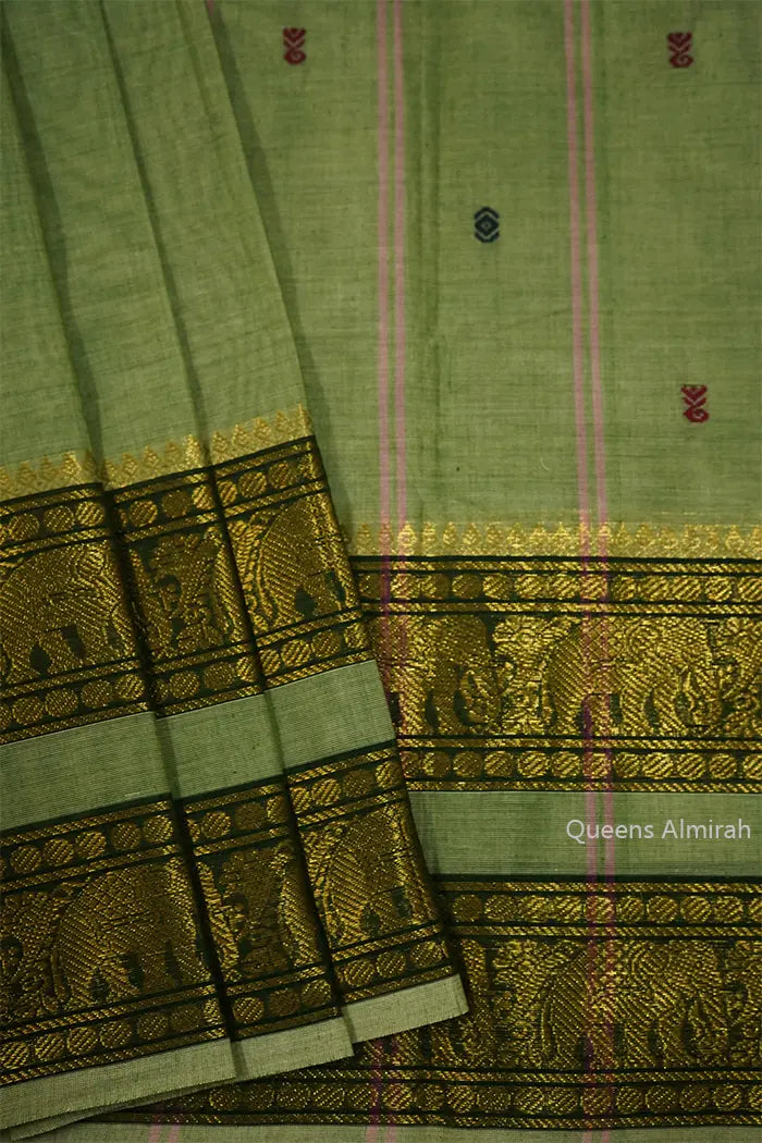 Discover the luxurious comfort and elegance of our Chelsea Cucumber with Olive Green Kanchi Cotton Saree. Made with very soft and rich silk, this saree offers a neat and easy-to-wear option for any occasion. Experience the comfort and sophistication of this traditional garment.