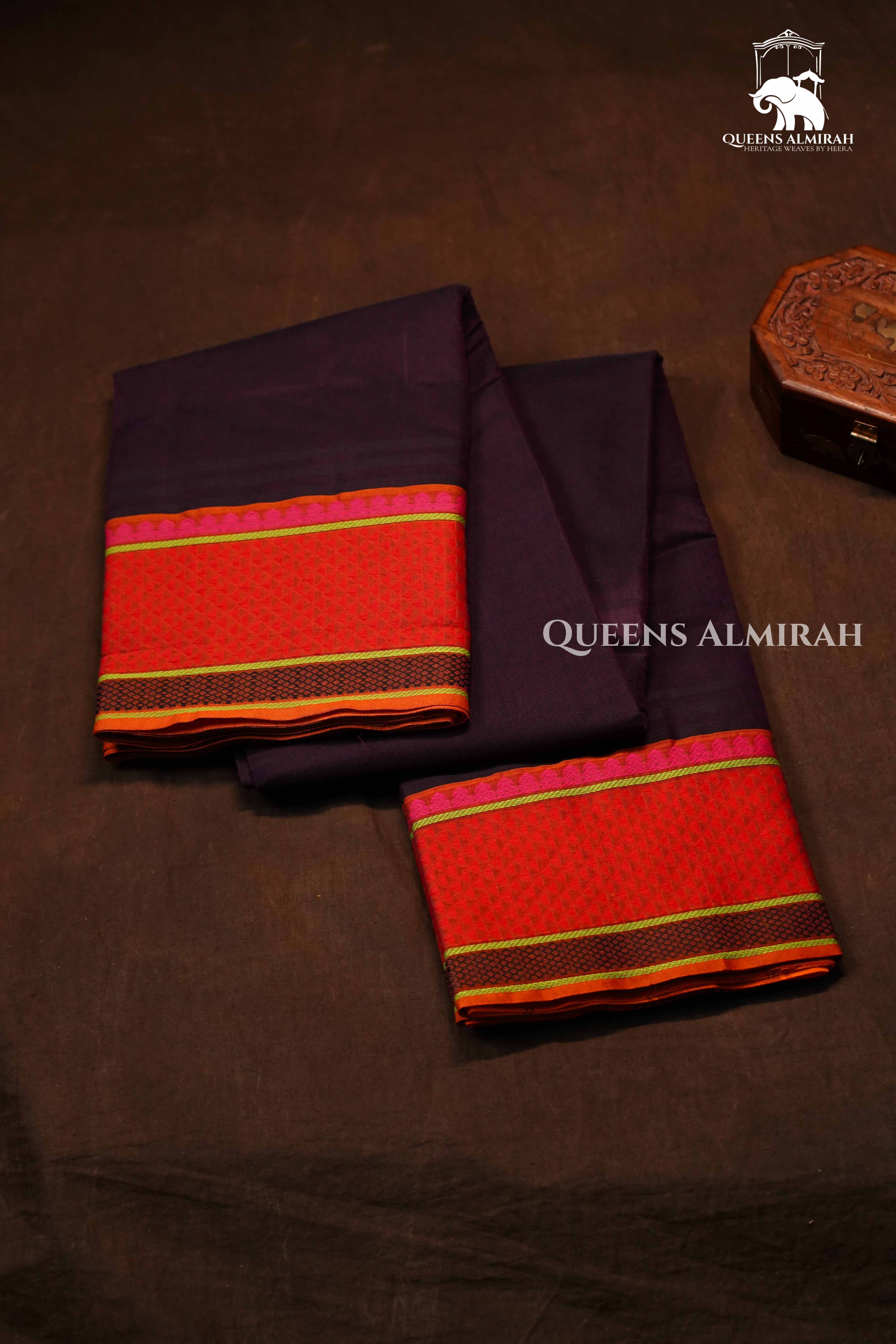 This Chettinad cotton saree comes in a rich dusky purple shade, complemented by a vibrant contrast border in orange and pink with intricate diamond weaving. The bold color combination paired with traditional craftsmanship makes it a perfect choice for festive occasions and cultural celebrations.