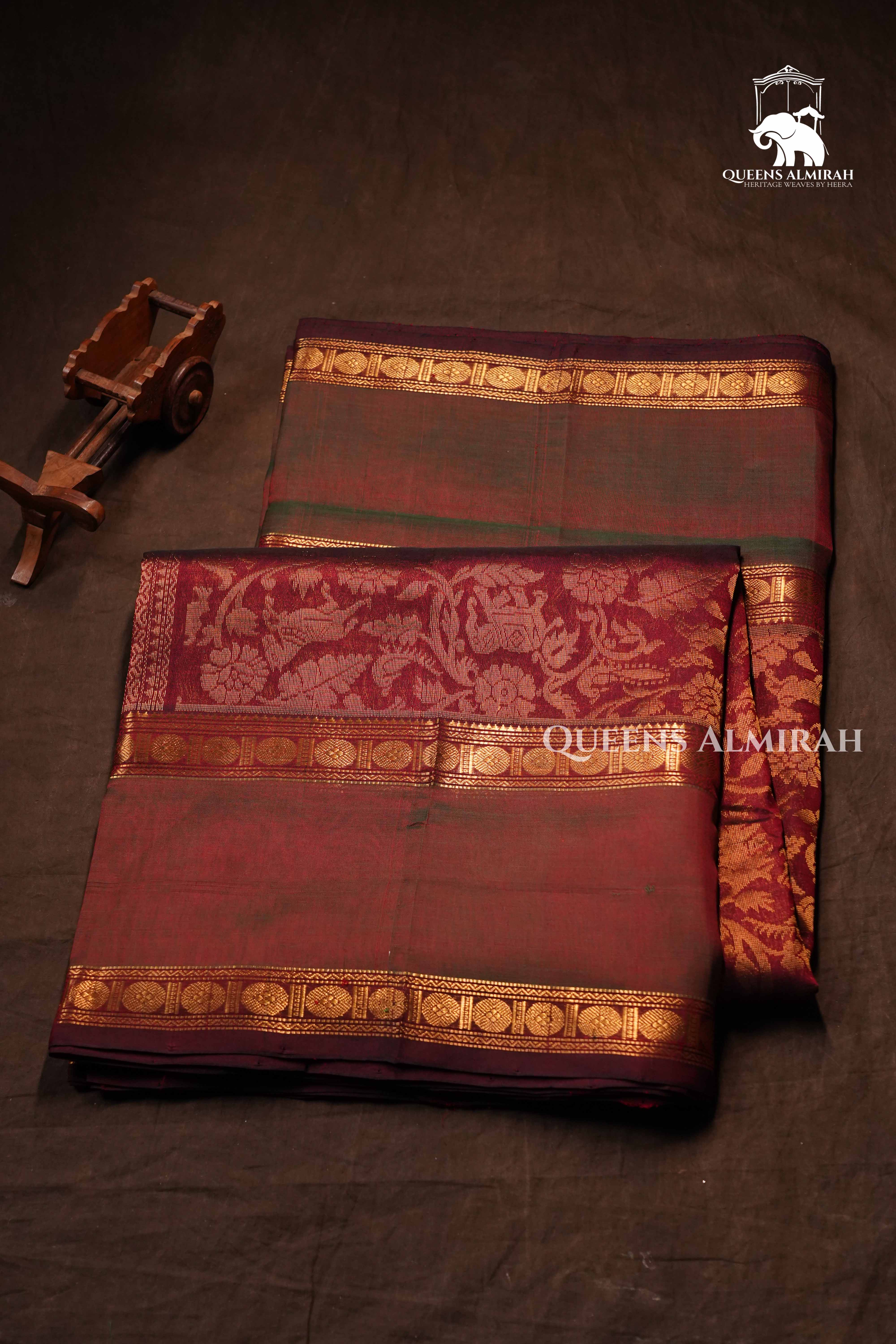 Enhance your festive and traditional wardrobe with this exquisite Kanchi Silk Cotton Saree featuring a stunning blend of royal Chocolate Brown and warm orange hues. The saree is beautifully adorned with intricate zari motifs, floral weaving, and classic gold borders that add a luxurious touch. Perfect for weddings, functions, and special occasions, this lightweight drape offers both comfort and timeless elegance. A must-have addition for any saree lover looking for grace and sophistication.
