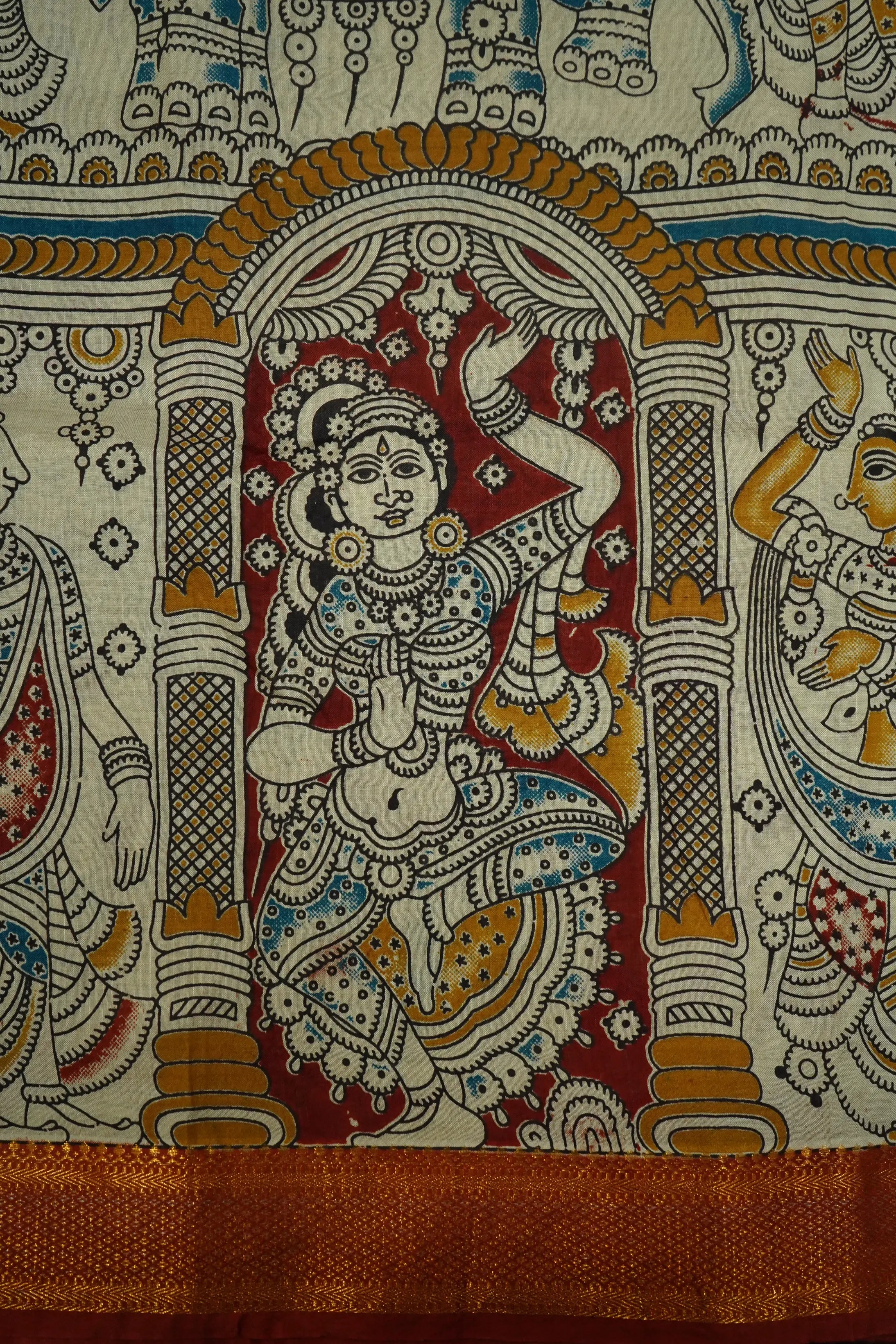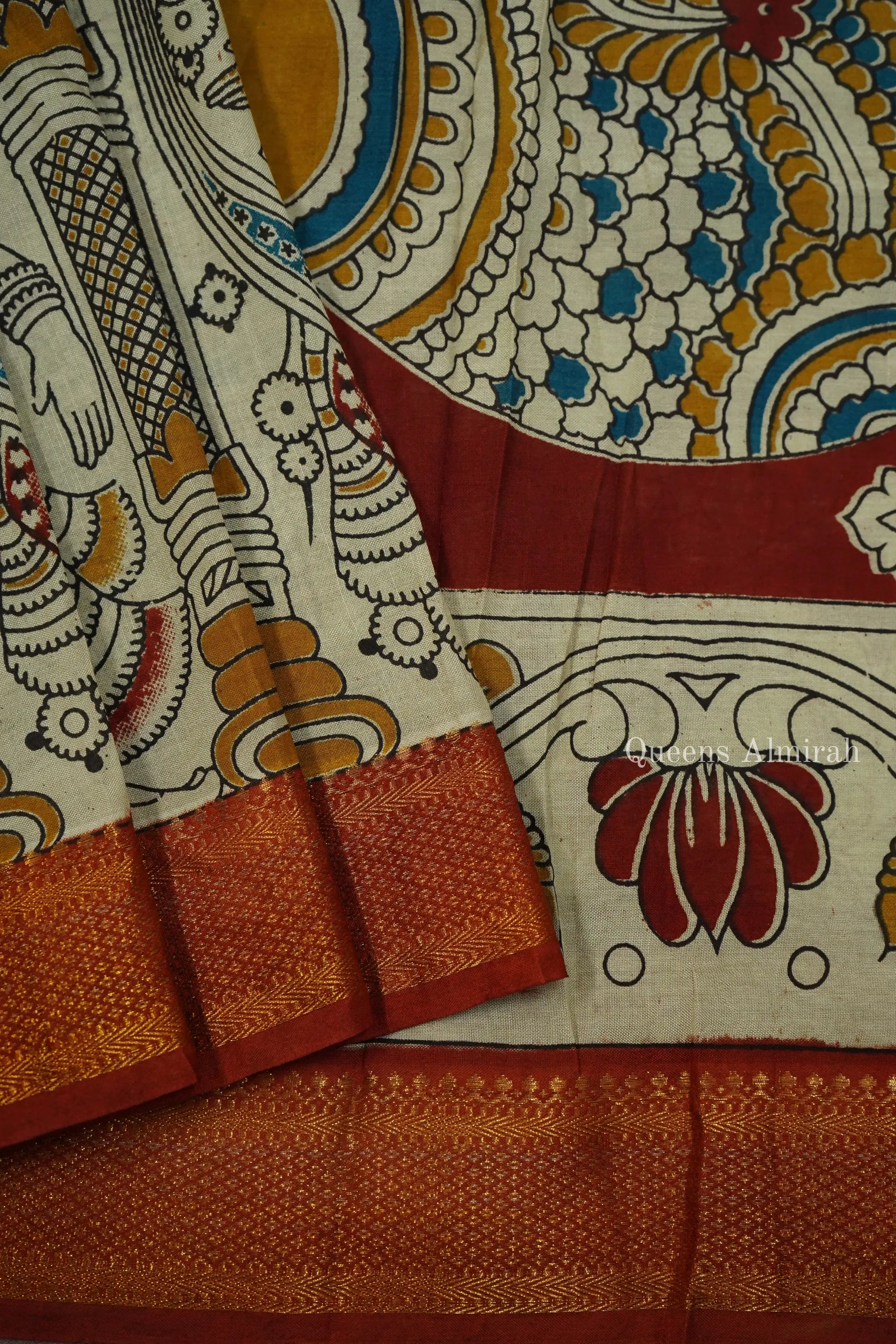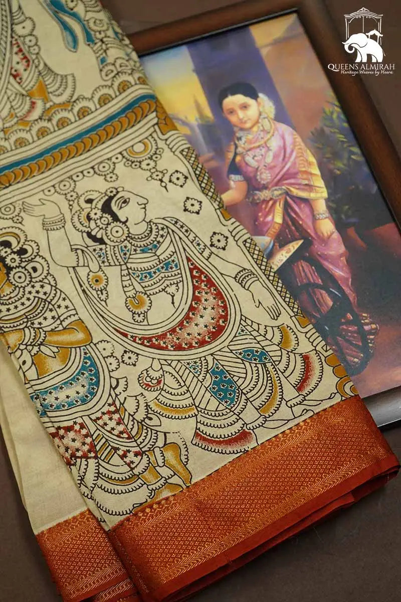 Expertly handcrafted, this COTTON SEED MANGALGIRI SAREE is designed to elevate your style. Made with soft, lightweight cotton, it boasts a rich contrast design, complete with traditional Kalamkari detailing. The attached blouse adds convenience to its beauty. Experience the perfect blend of timeless elegance and comfort.