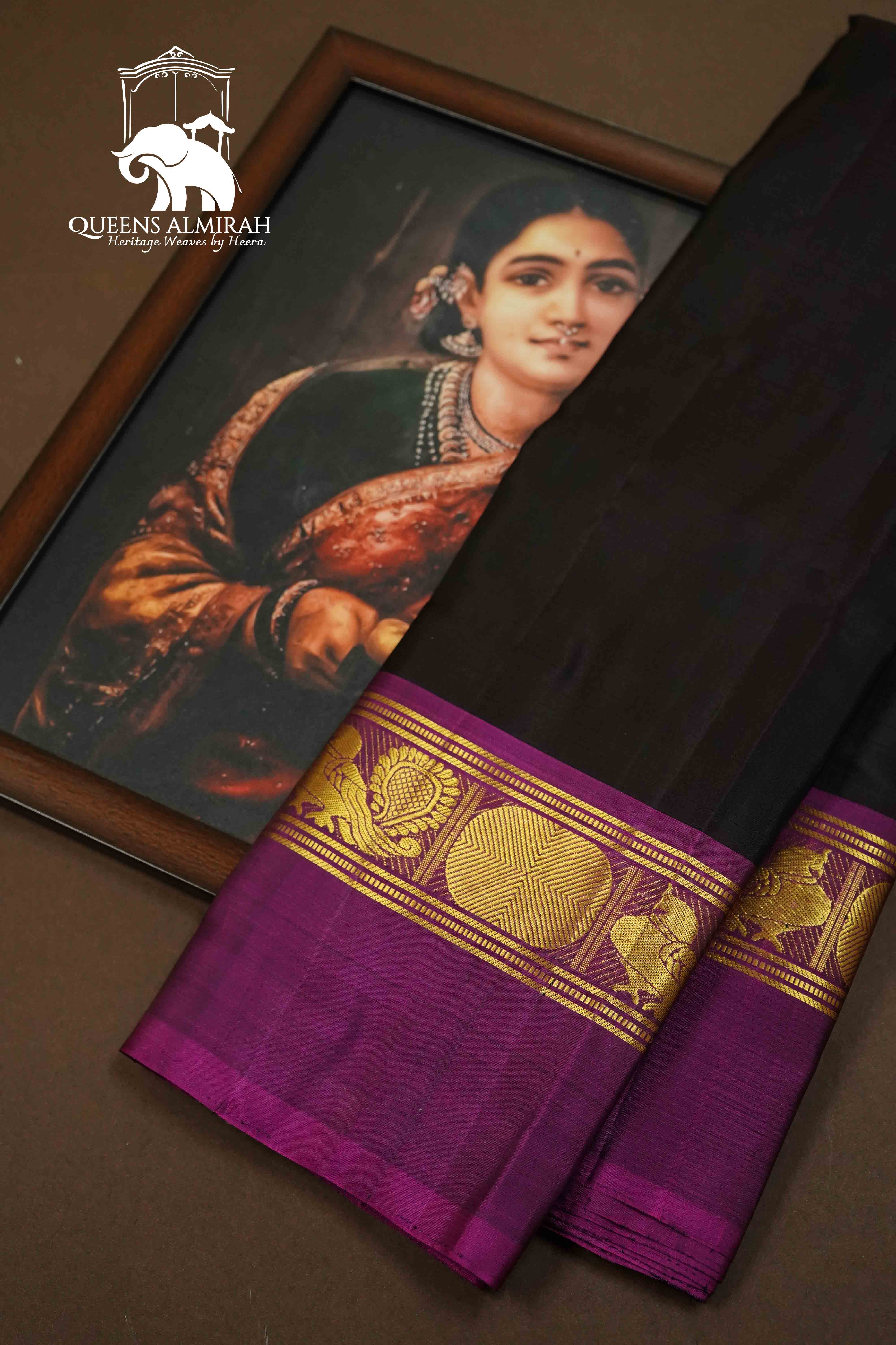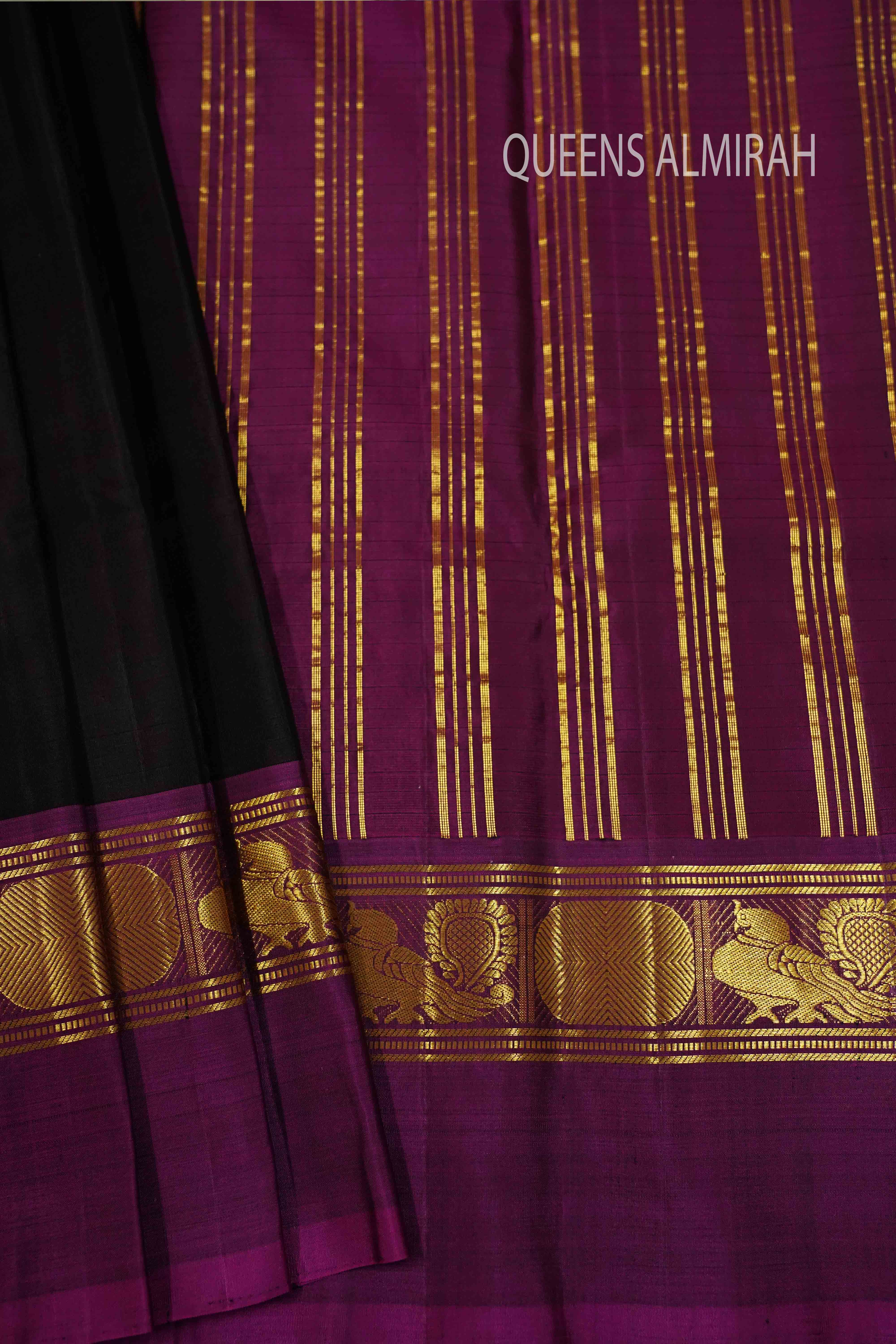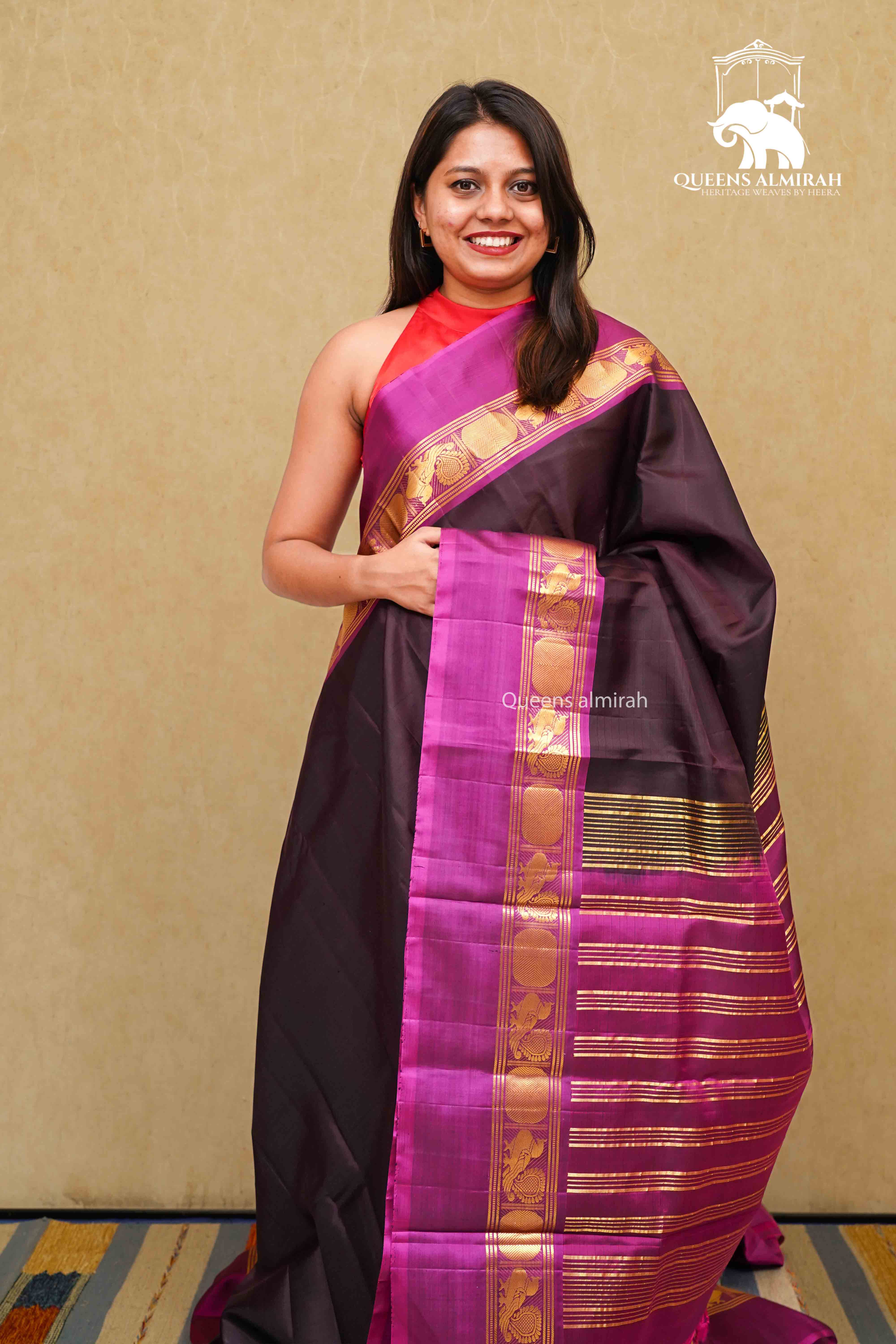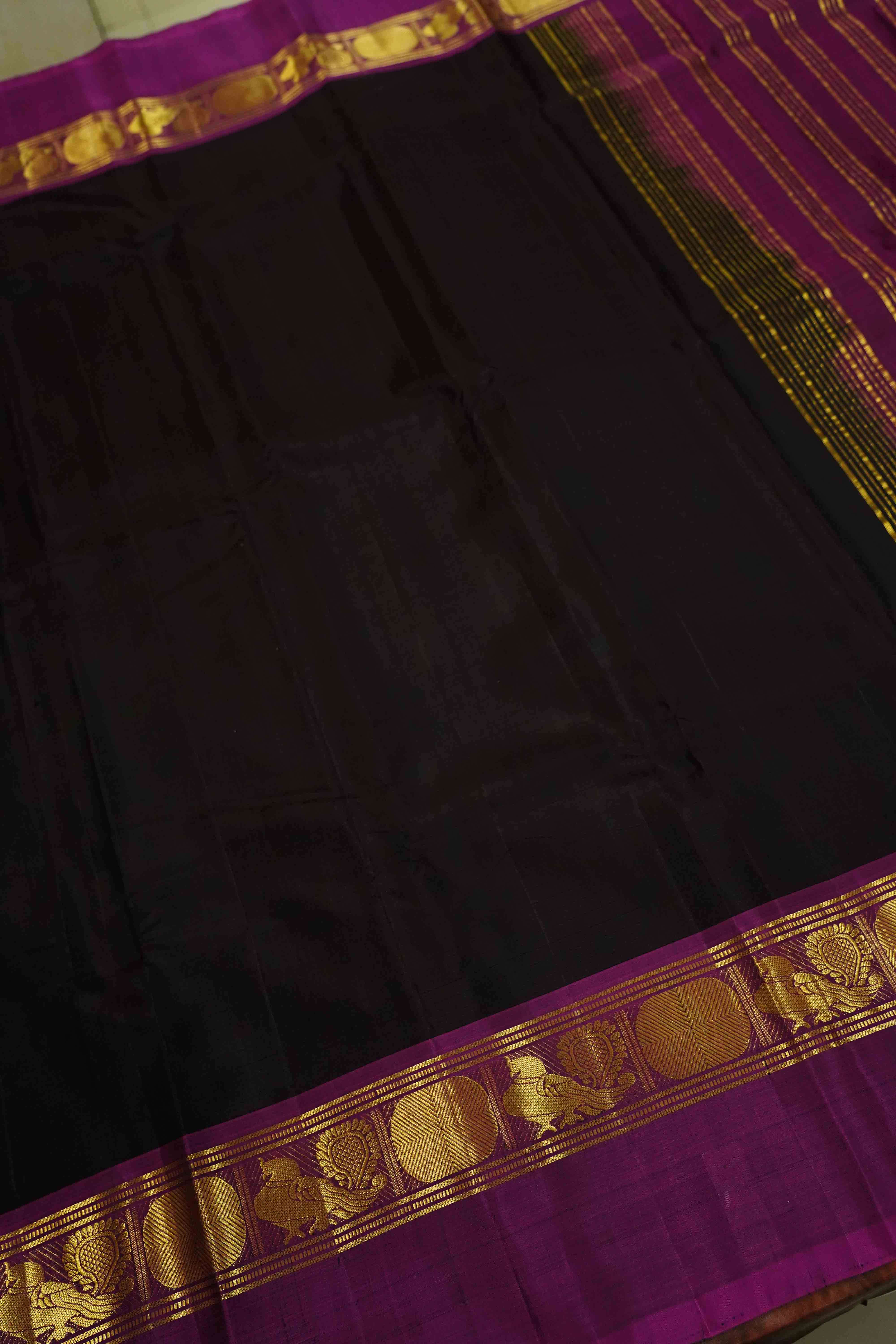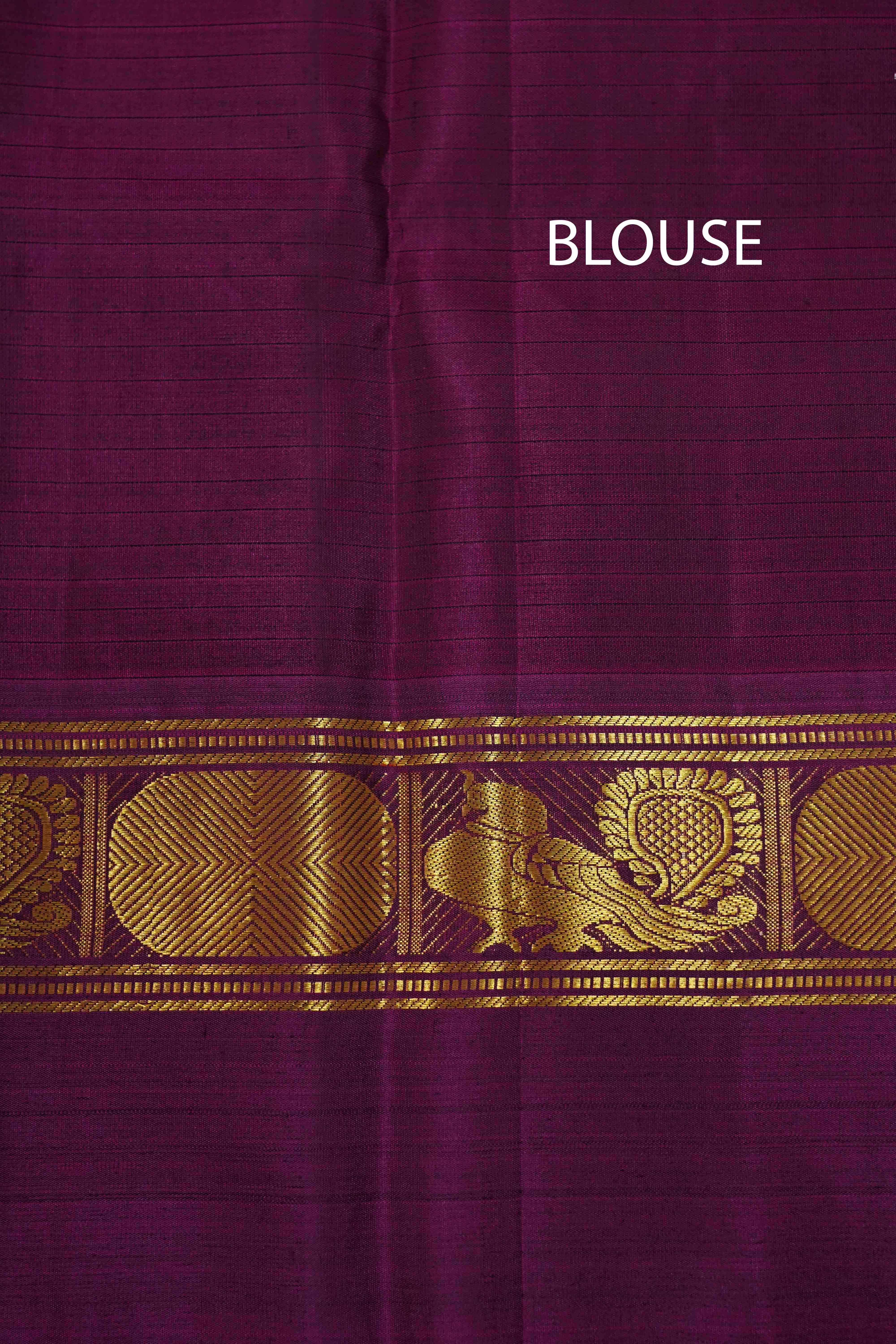This luxurious DARK CHOCOLATE WITH PURPLE JAM PURE KANCHIVARAM SILK SAREE boasts a golden border with intricate peacock and Rudraksham designs, adding to its rich and elegant look. Made from high-quality silk, this saree is perfect for special occasions and sure to impress. Elevate your wardrobe with this stunning piece.
