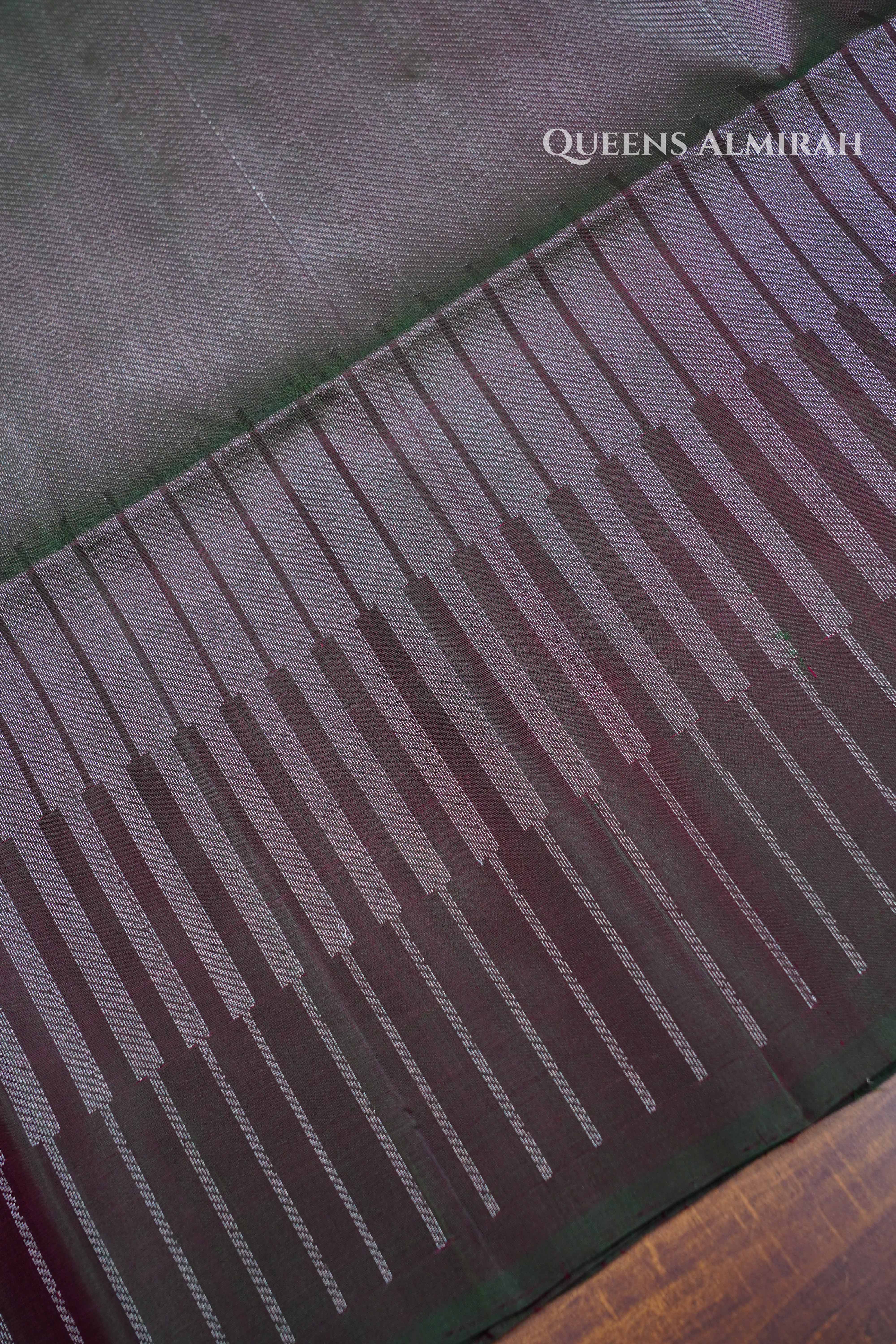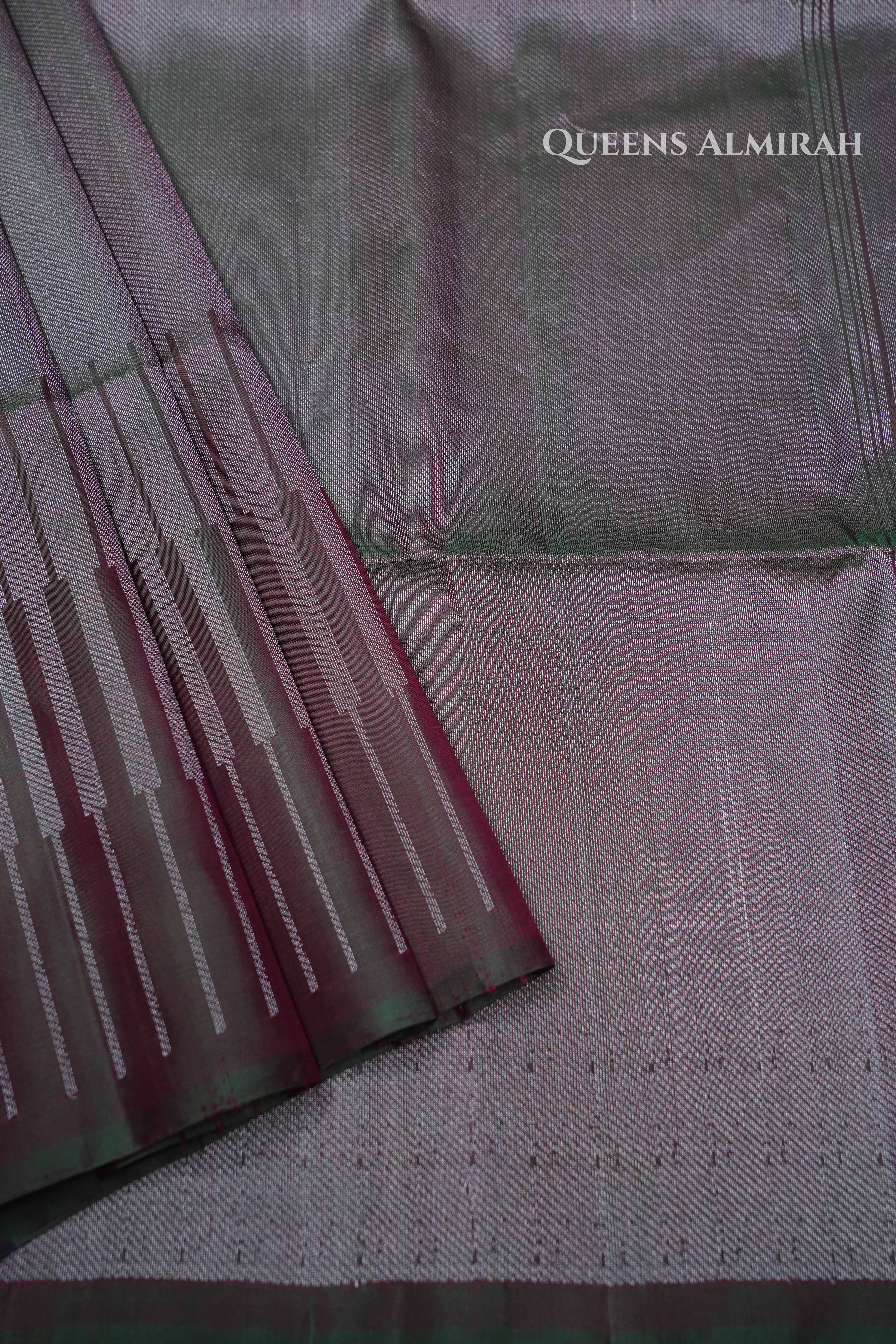 "A striking Dark Grape Brown Soft Silk Saree adorned with sleek silver zari stripes across the body. Elegant and lightweight, it’s perfect for festive gatherings, weddings, and celebrations — a timeless drape from Queens Almirah.