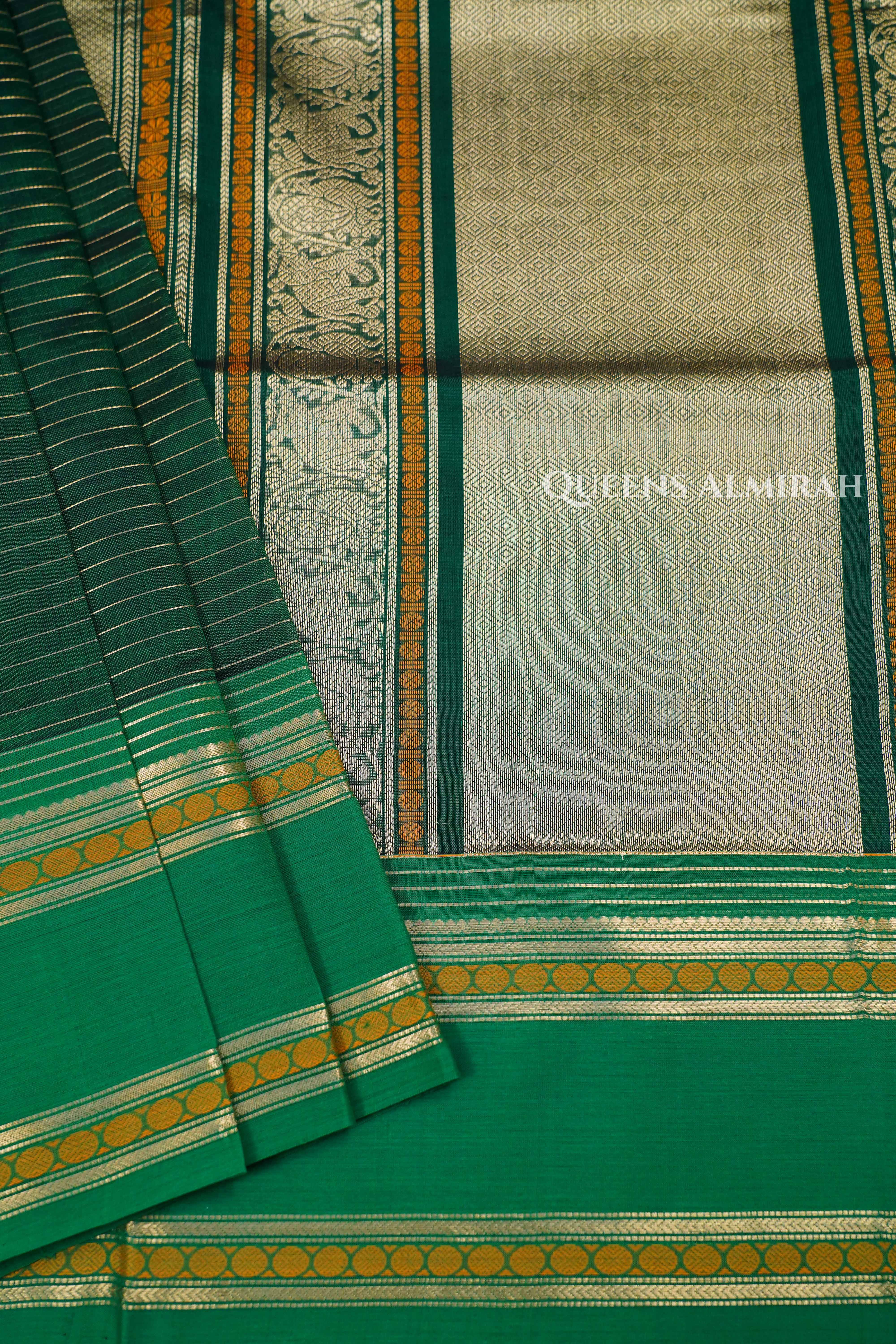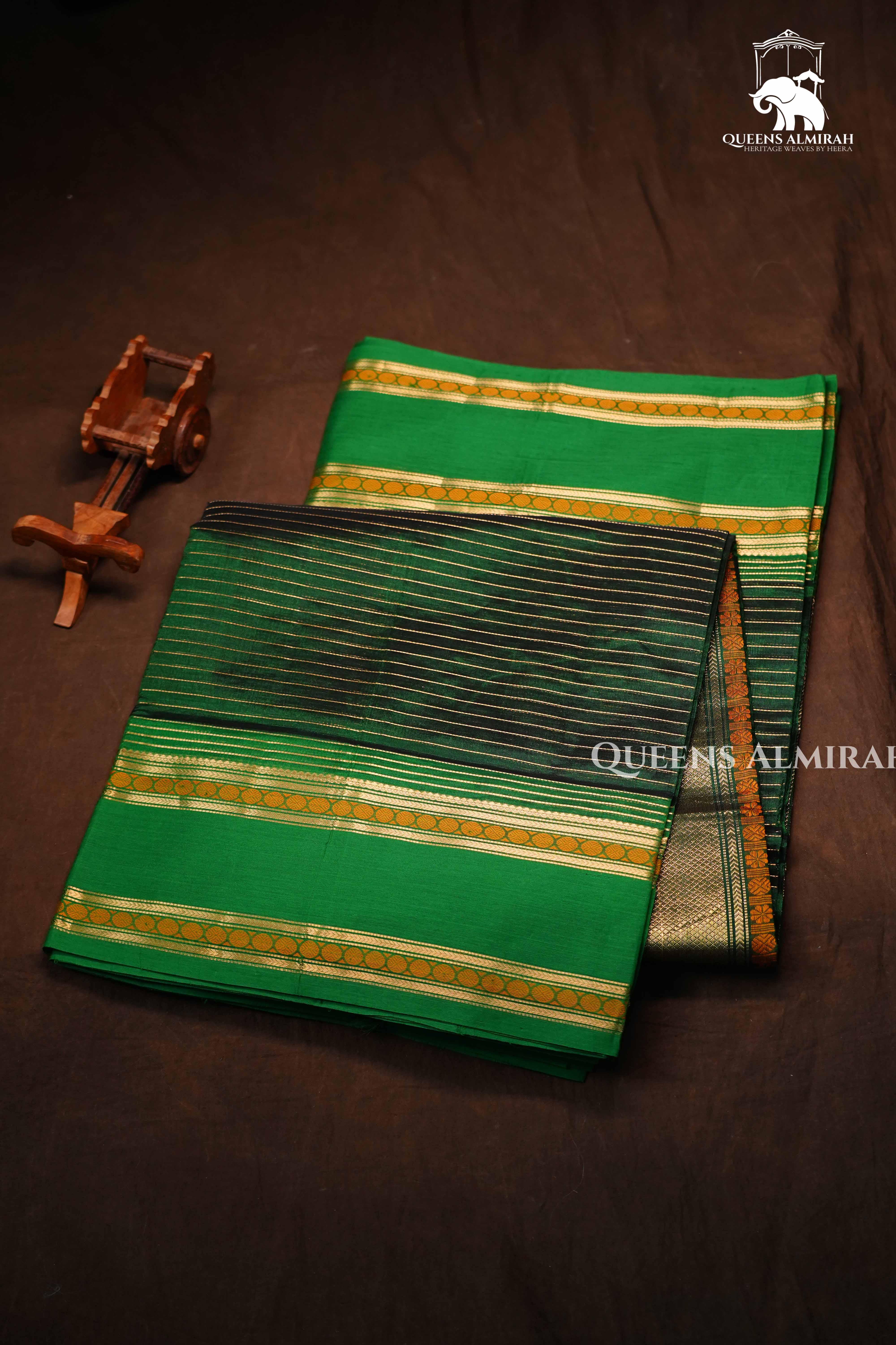 Bring home the essence of tradition with this Green silk cotton Saree featuring Golden Zari Borders. The body is designed in a rich parrot green shade, beautifully complemented by a striking black pallu with delicate golden stripes. The broad golden zari borders with circular motifs enhance its grandeur, making it the perfect attire for festivals, temple visits, and traditional functions. Crafted with fine silk and intricate weaving, this saree ensures luxury, durability, and timeless elegance.