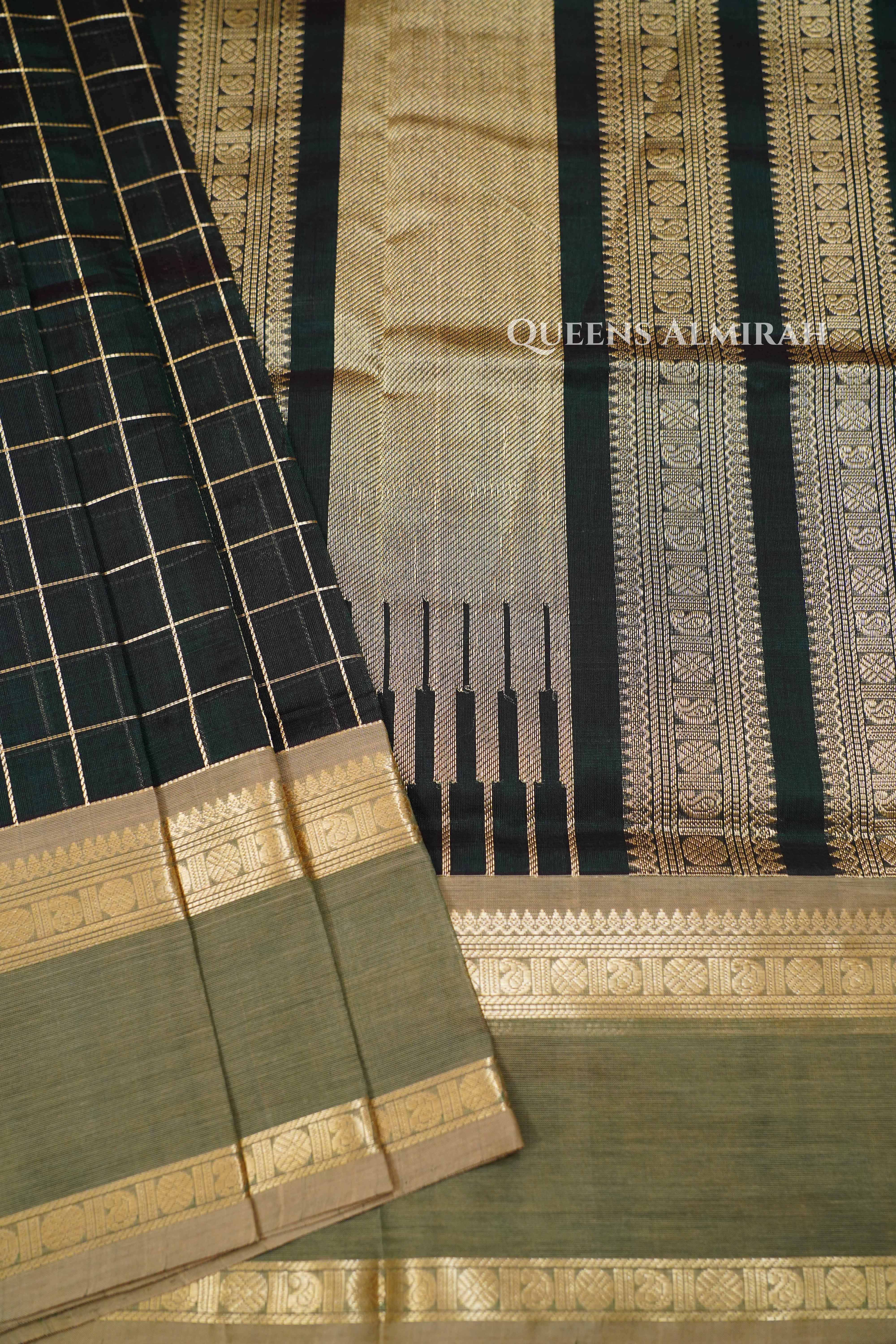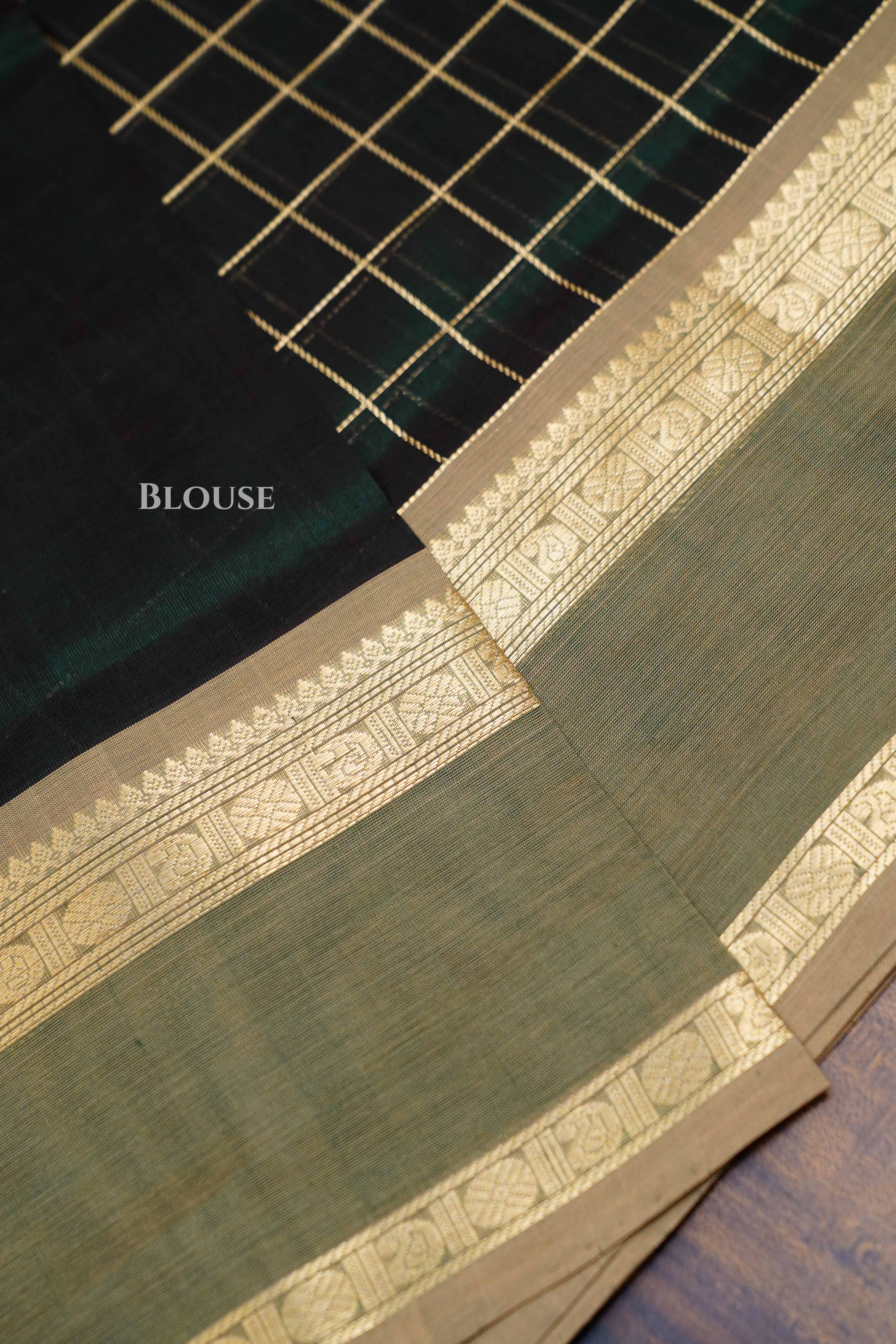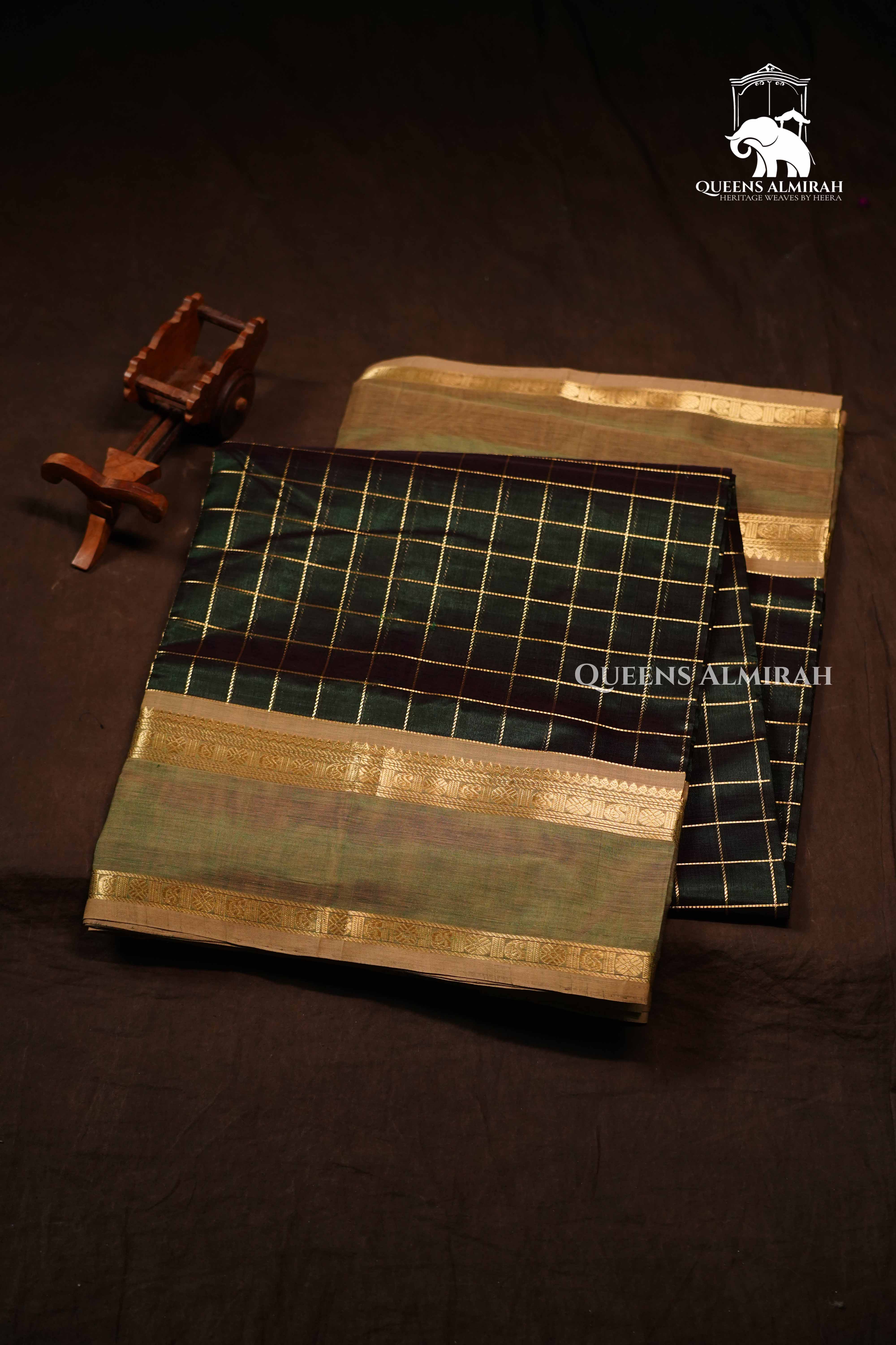 “An elegant dark green Chettinad silk cotton saree featuring classic golden checks and a rich zari border, blending traditional charm with timeless grace.”