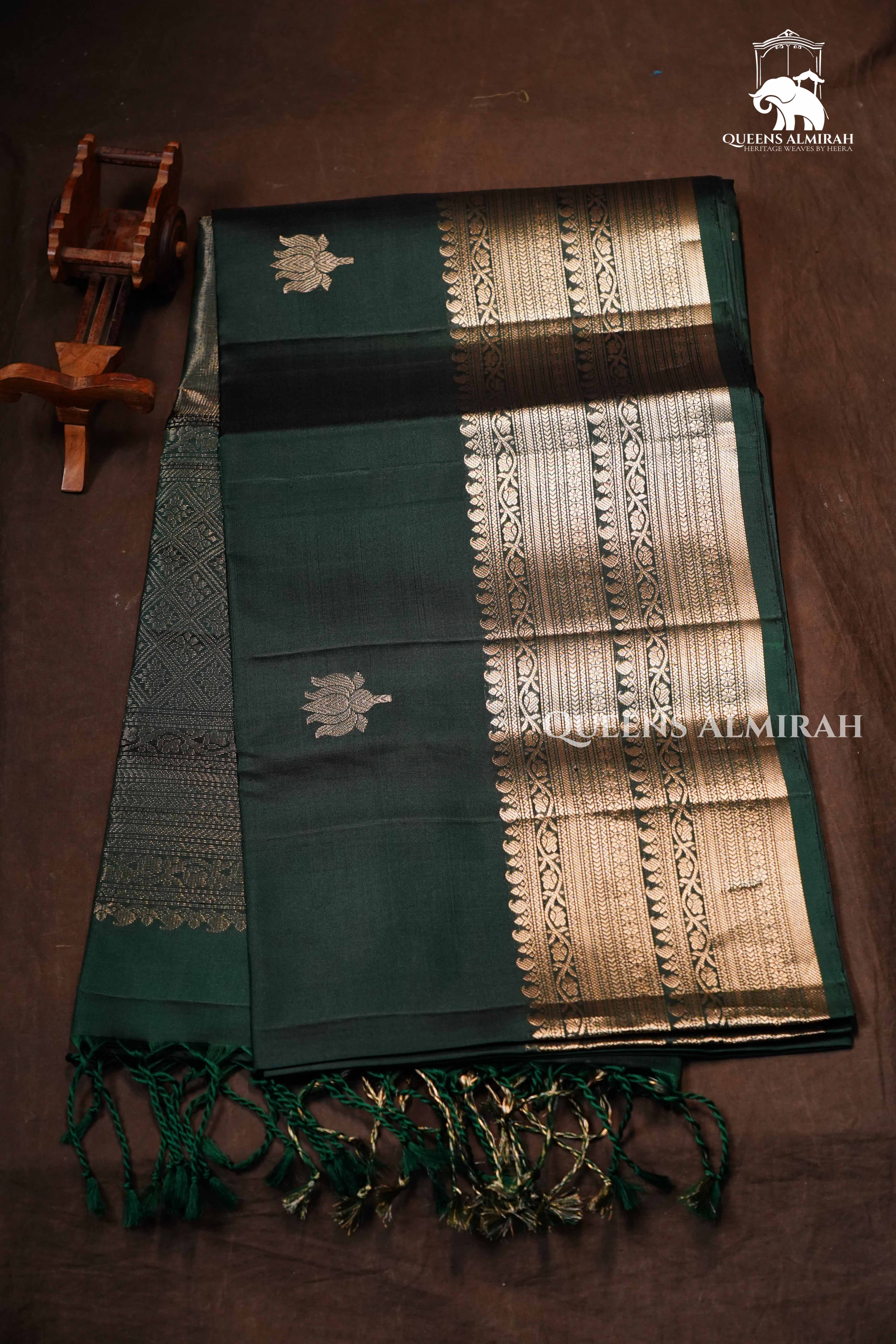 This exquisite Dark Green Soft Silk Saree radiates grace and sophistication. The rich green body is adorned with delicate silver lotus motifs, creating a refined charm. Its broad silver zari border and intricately woven pallu add a regal touch, making it perfect for weddings, festive occasions, and cultural celebrations. Lightweight yet luxurious, this drape beautifully blends tradition with timeless elegance.