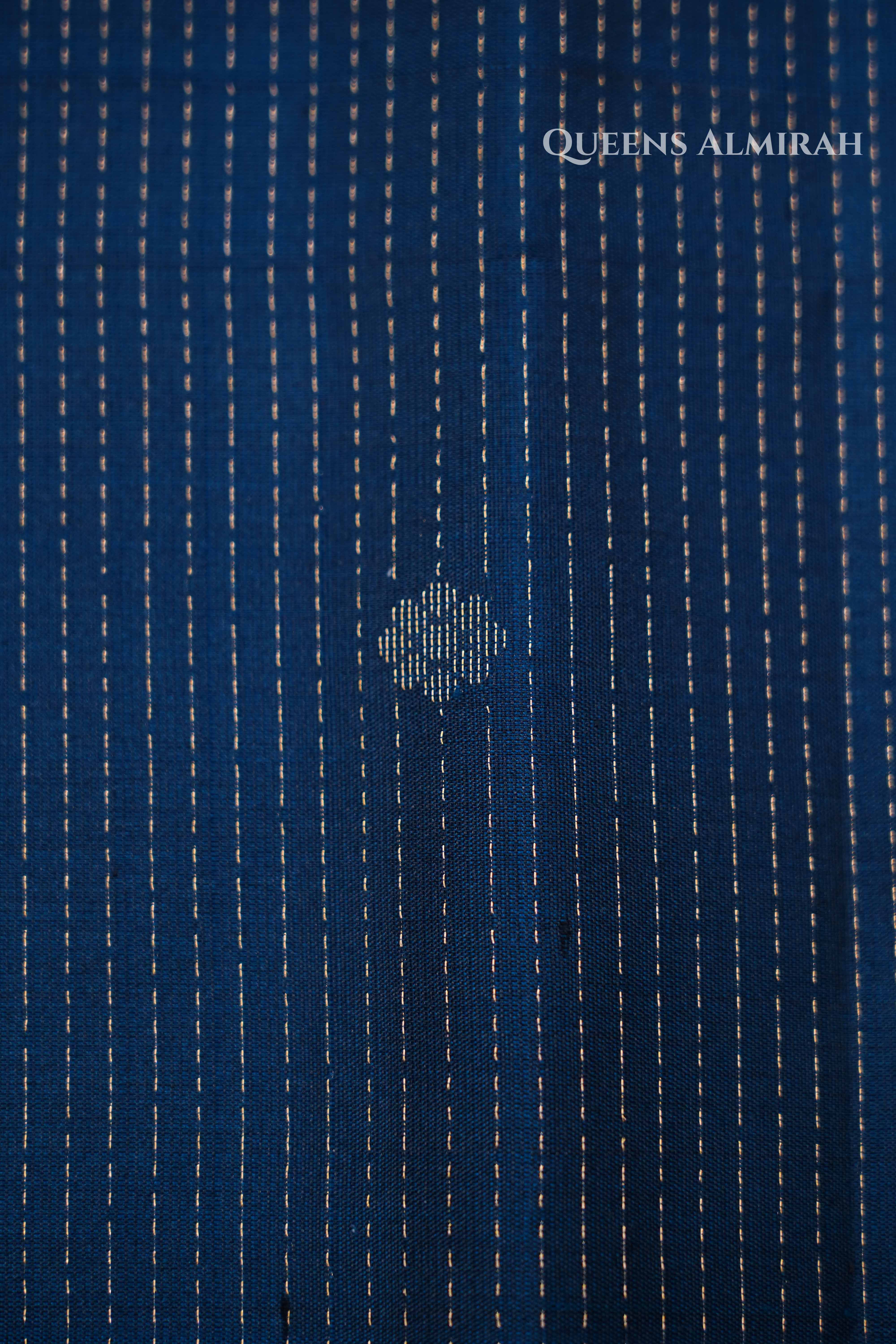 Steel Blue Kanchi Soft Silk Saree – A regal Vaira Oosi style drape, adorned with delicate flower buttas across the body. The highlight is its grand golden pallu, richly woven with illai and kodi motifs, adding a traditional touch of opulence. Paired with an attached simple blouse, this saree blends elegance with heritage, making it a timeless pick for weddings, festive occasions, and cultural celebrations.