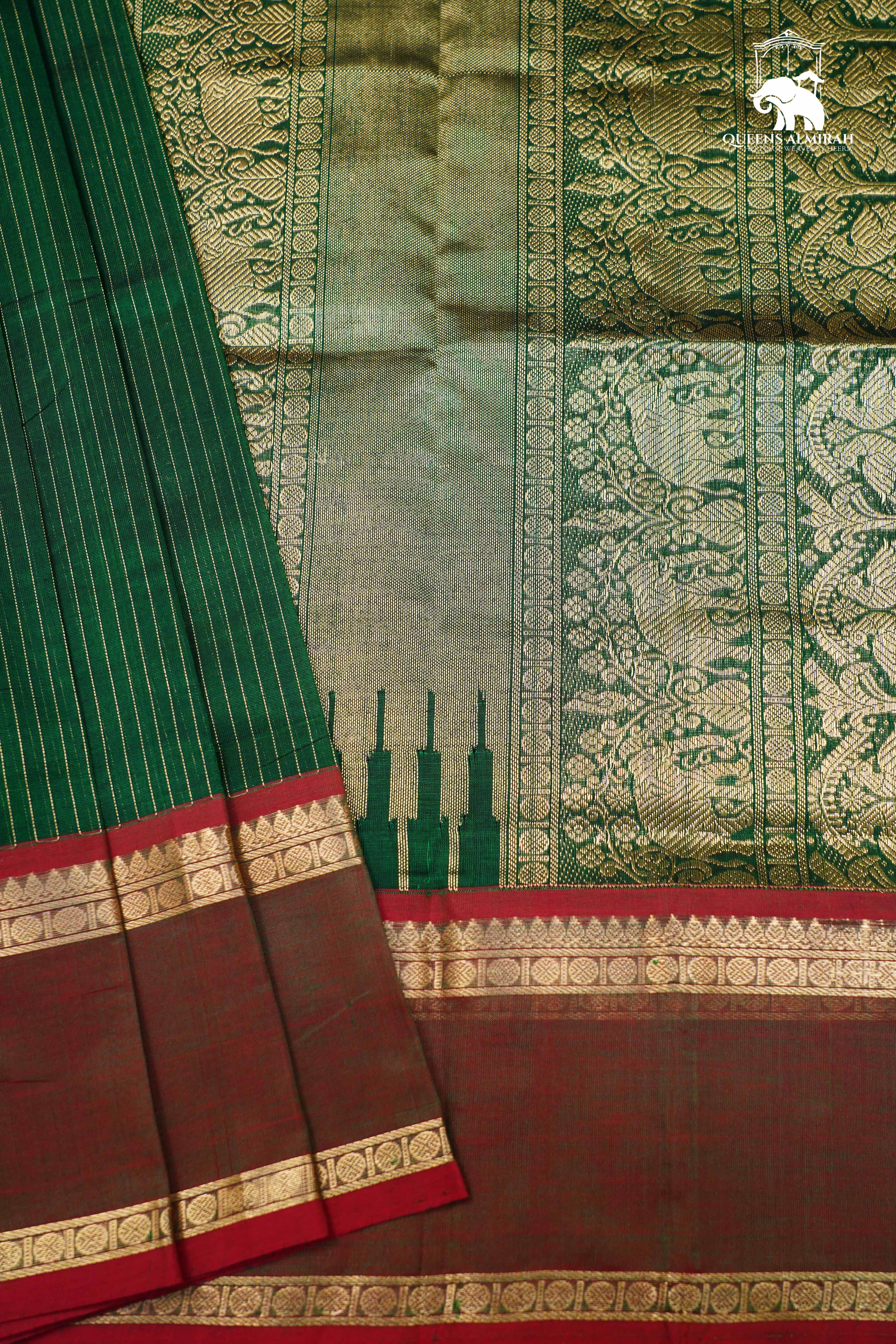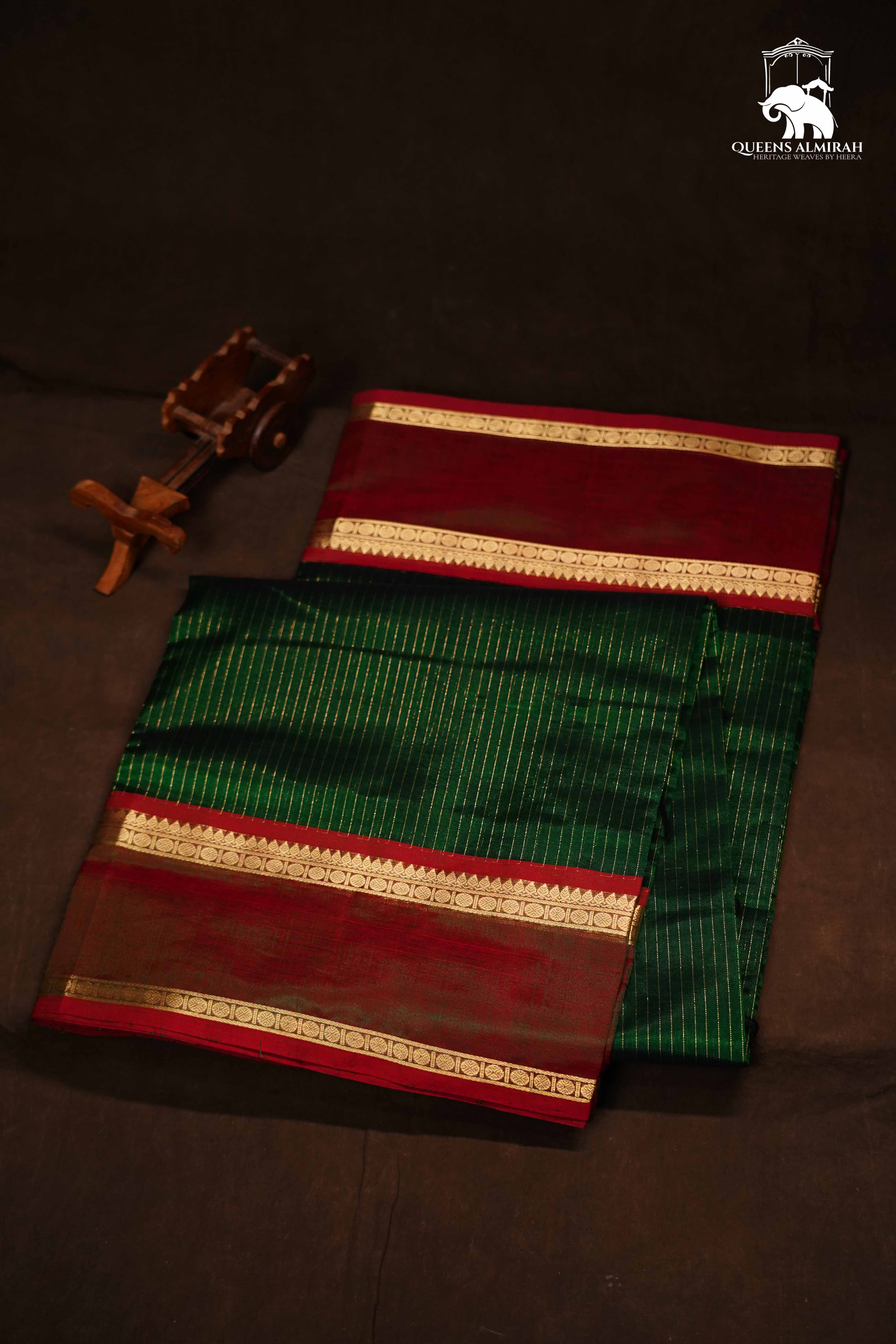 Step into timeless beauty with this Classic Dark Green Silk cotton Saree adorned with Fine Golden Stripes and Rich Maroon Borders. The contrasting maroon pallu showcases opulent zari work with intricate motifs, giving it a regal finish. Perfect for traditional occasions, temple ceremonies, and weddings, this masterpiece speaks elegance in every drape.
