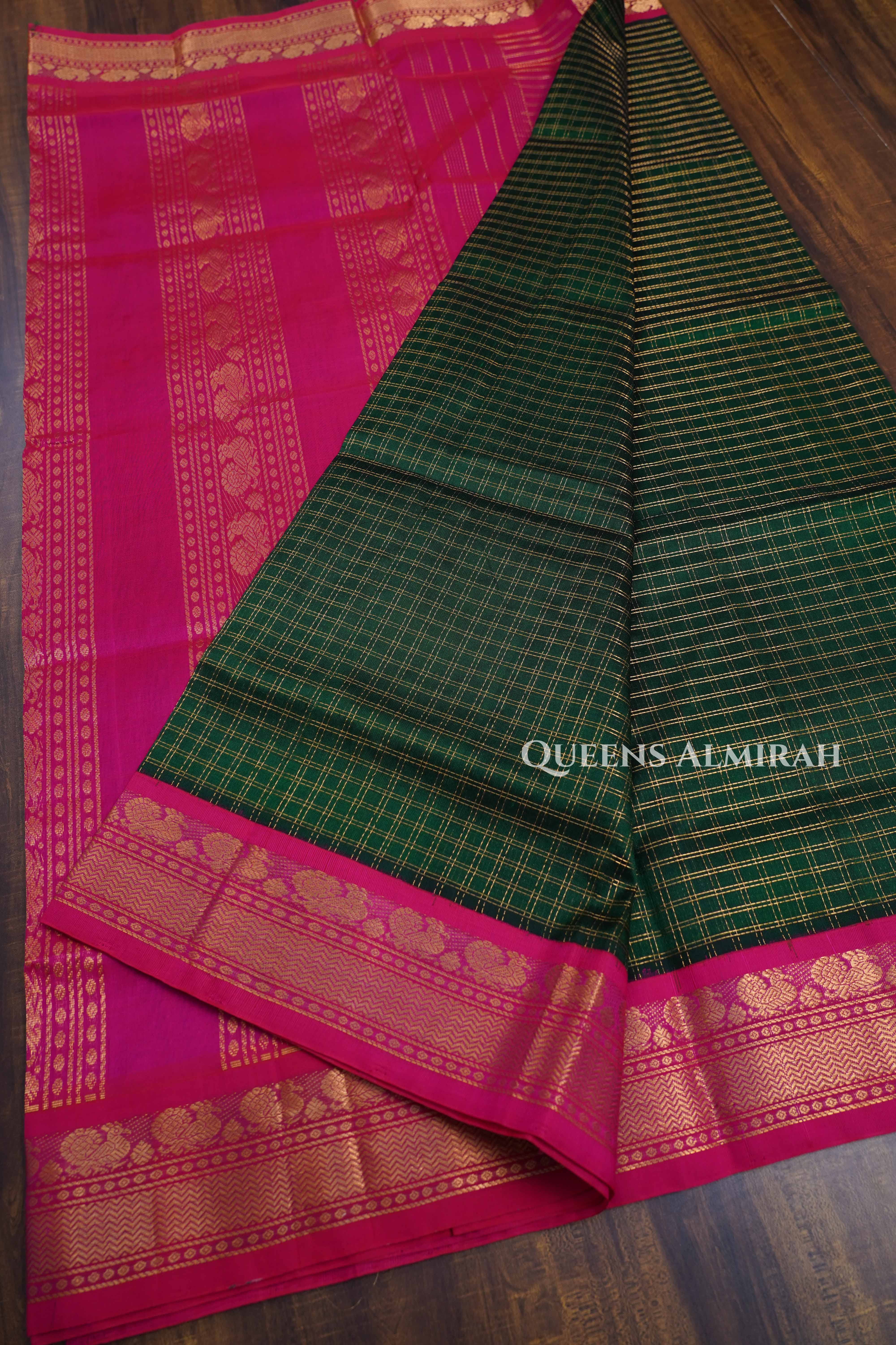 Elegant Kanchi Silk Cotton Saree in soft Dark Green and Magenta Pink hues, adorned with rich golden zari stripes. Perfect blend of traditional craftsmanship and modern grace — ideal for festive and special occasions.