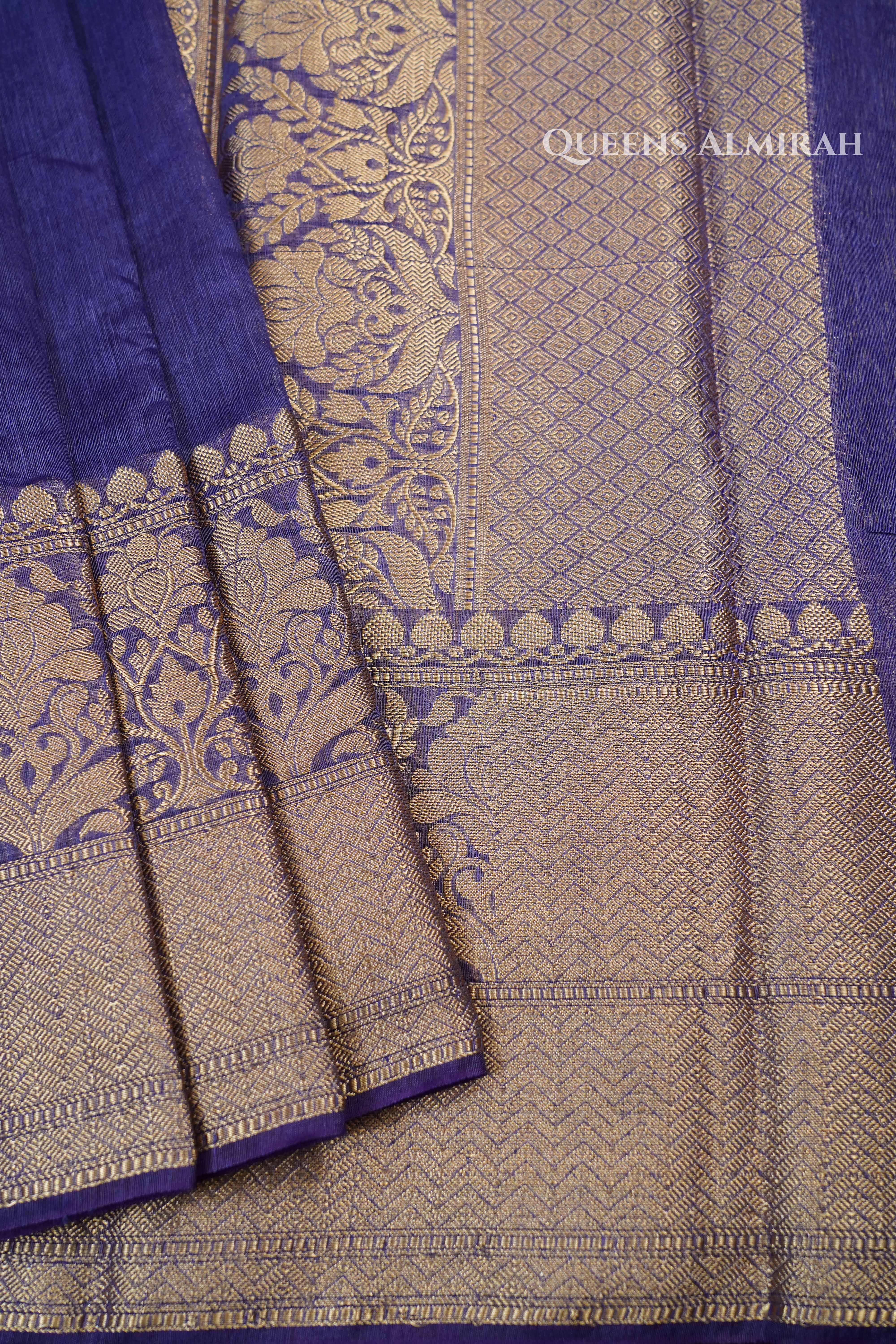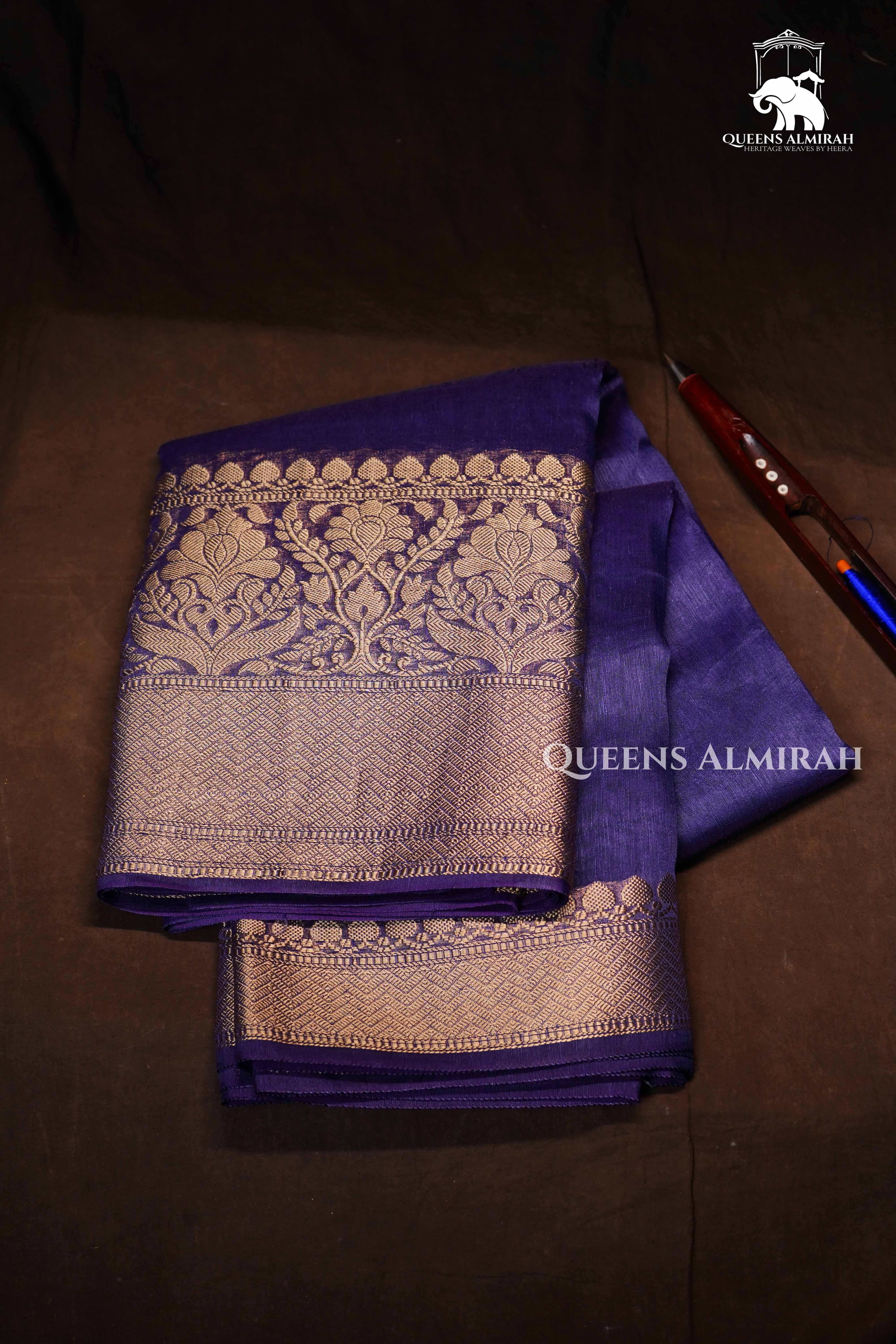 Drape yourself in the timeless charm of this Dark Indigo Banarasi Linen Saree, beautifully detailed with antique gold zari motifs and a regal border. The deep, rich hue enhances the intricacy of the weave, making it a perfect pick for festive gatherings or sophisticated evening wear. Lightweight yet grand, it brings heritage and elegance together effortlessly.