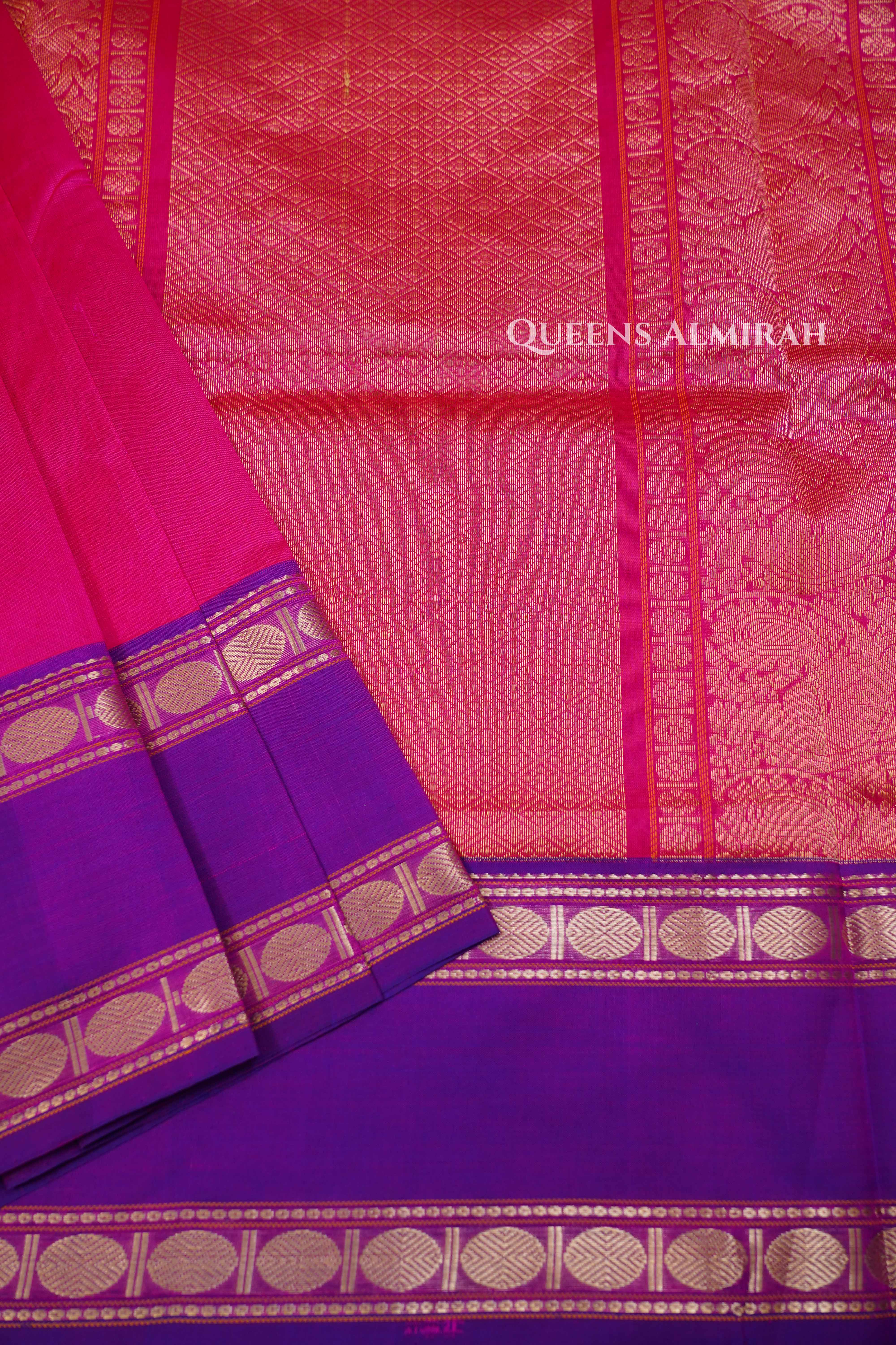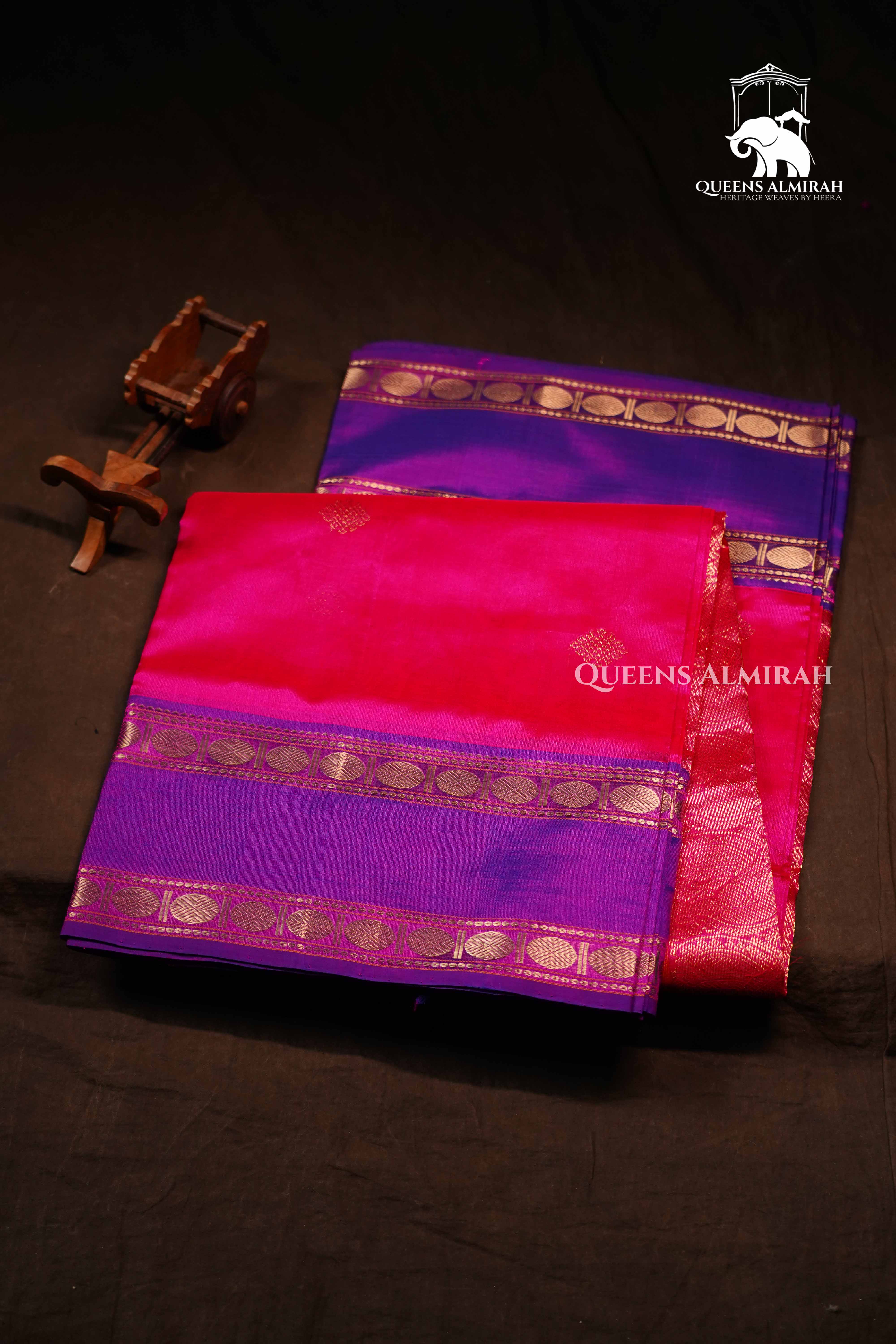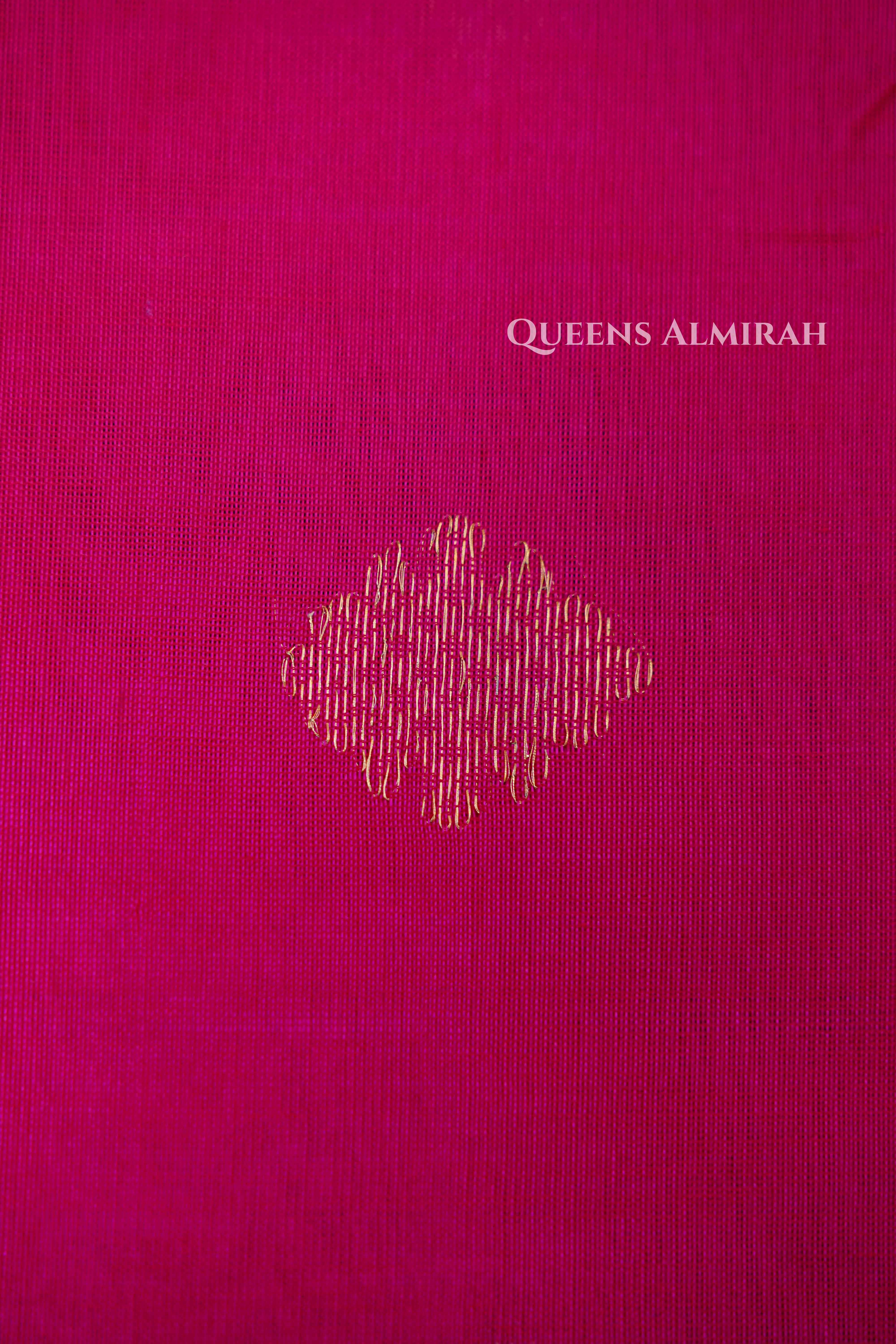 A stunning weave that brings together the richness of royal blue and magenta, highlighted with elegant golden zari borders and motifs. The body features a graceful contrast of hues with delicate woven buttas, while the pallu shines with intricate zari work, making it a perfect blend of tradition and charm. Lightweight yet luxurious, this silk cotton saree is ideal for festive occasions, weddings, and cultural celebrations.