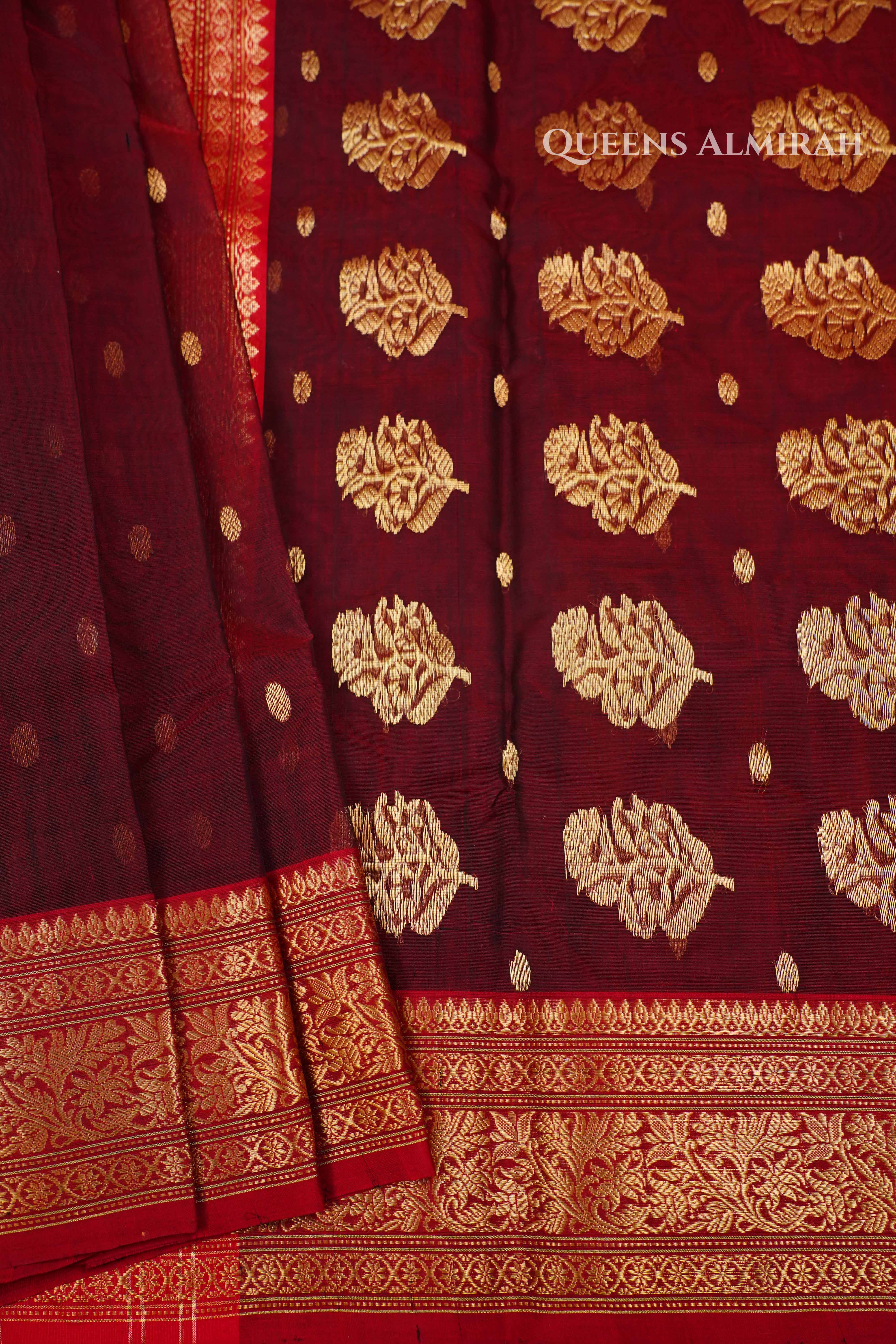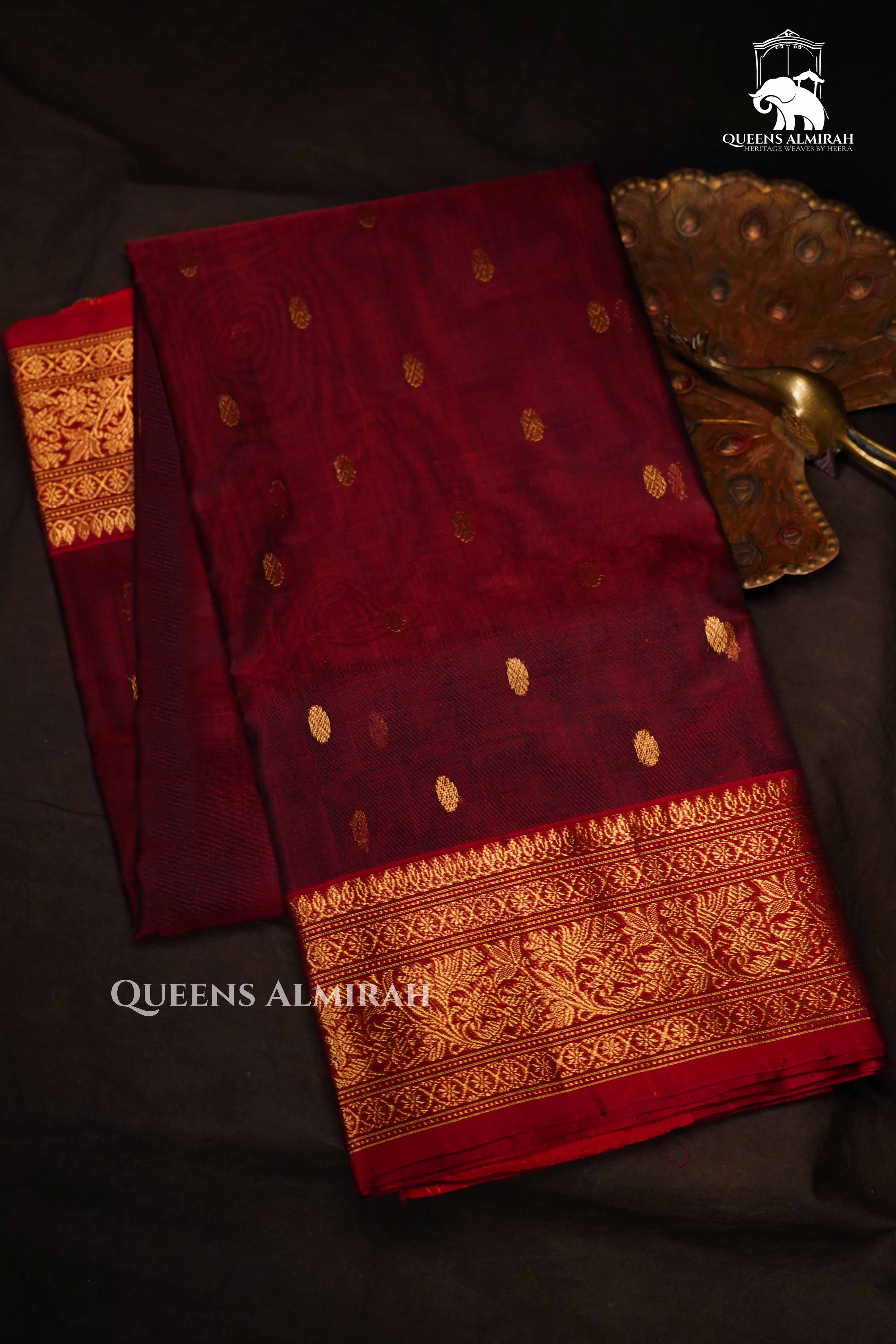 Step into timeless elegance with this Dark Maroon Chanderi Katan Silk Handloom Saree, exquisitely woven with fine golden zari buttas and a rich traditional border. Crafted from pure Katan silk, this saree offers a luxurious texture, graceful fall, and lustrous sheen—perfect for weddings, festive occasions, and special celebrations. Its deep pink hue radiates warmth and charm, making it a standout addition to any ethnic wardrobe.
