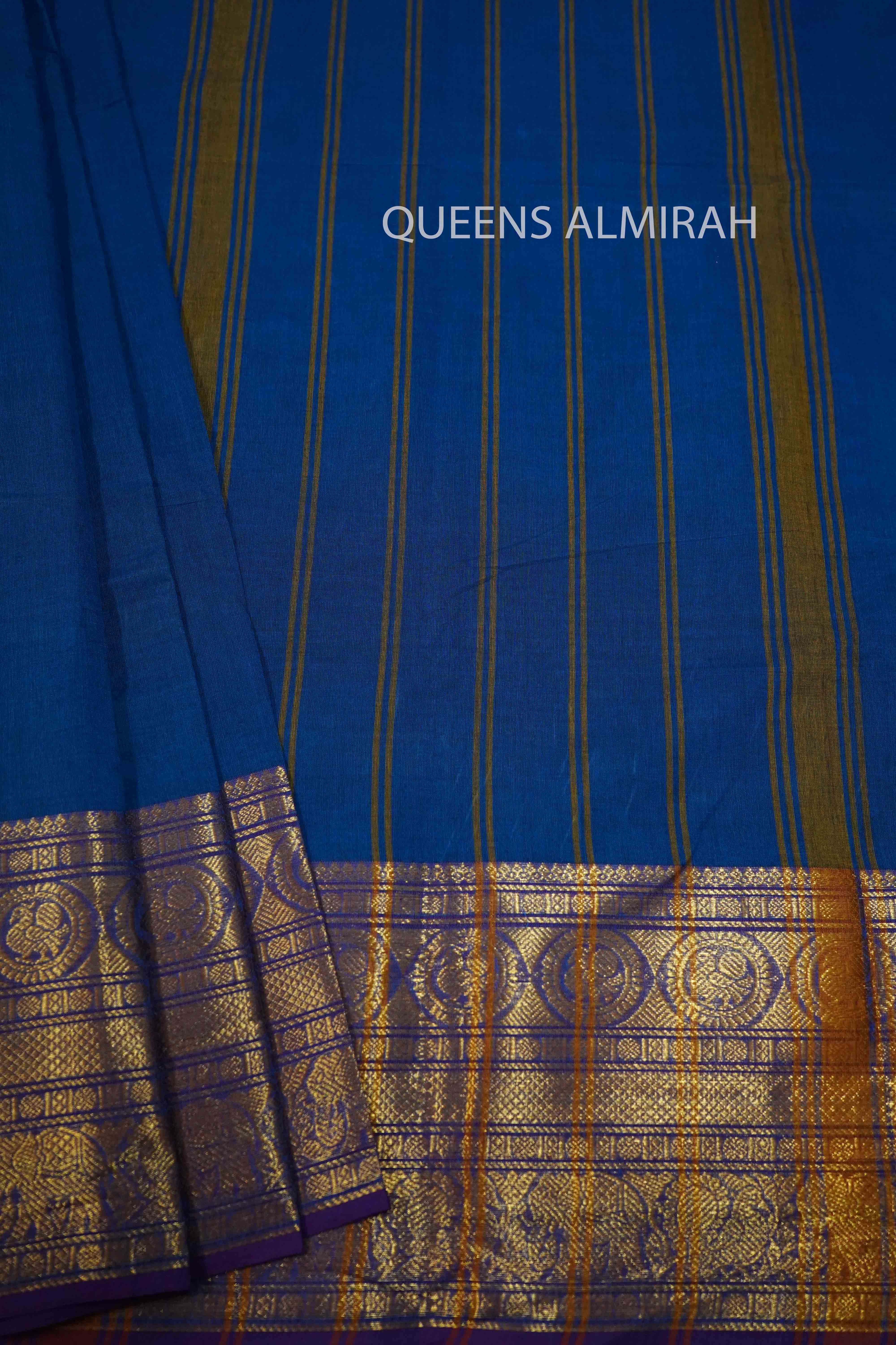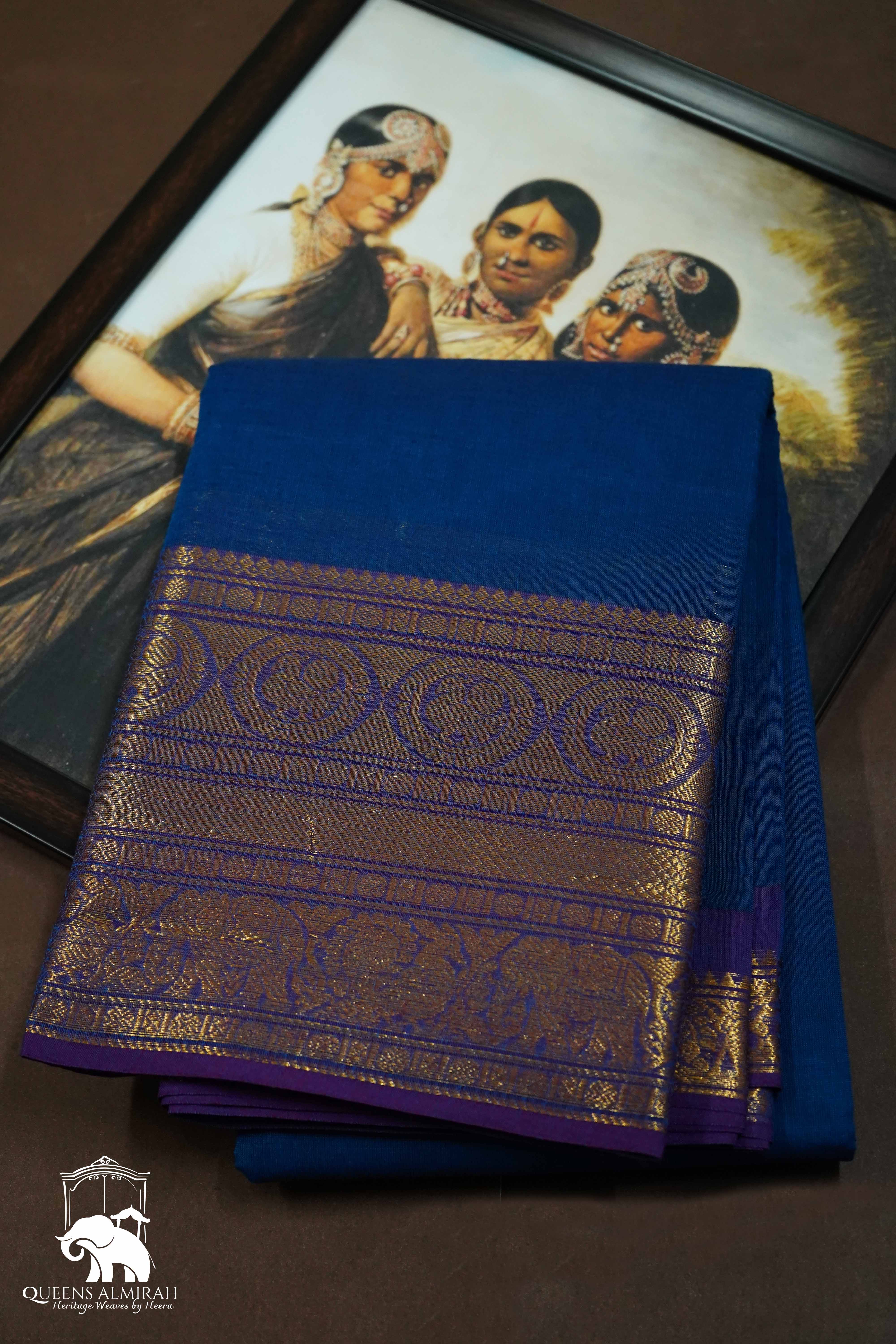 Introducing our sophisticated Dark Navy with Purple Kanchi Cotton Saree. Adorned with a golden border, this saree features intricate designs of peacocks and elephants, adding a touch of elegance to your attire. Made with high-quality Kanchi cotton, it offers both comfort and style. Perfect for any special occasion.